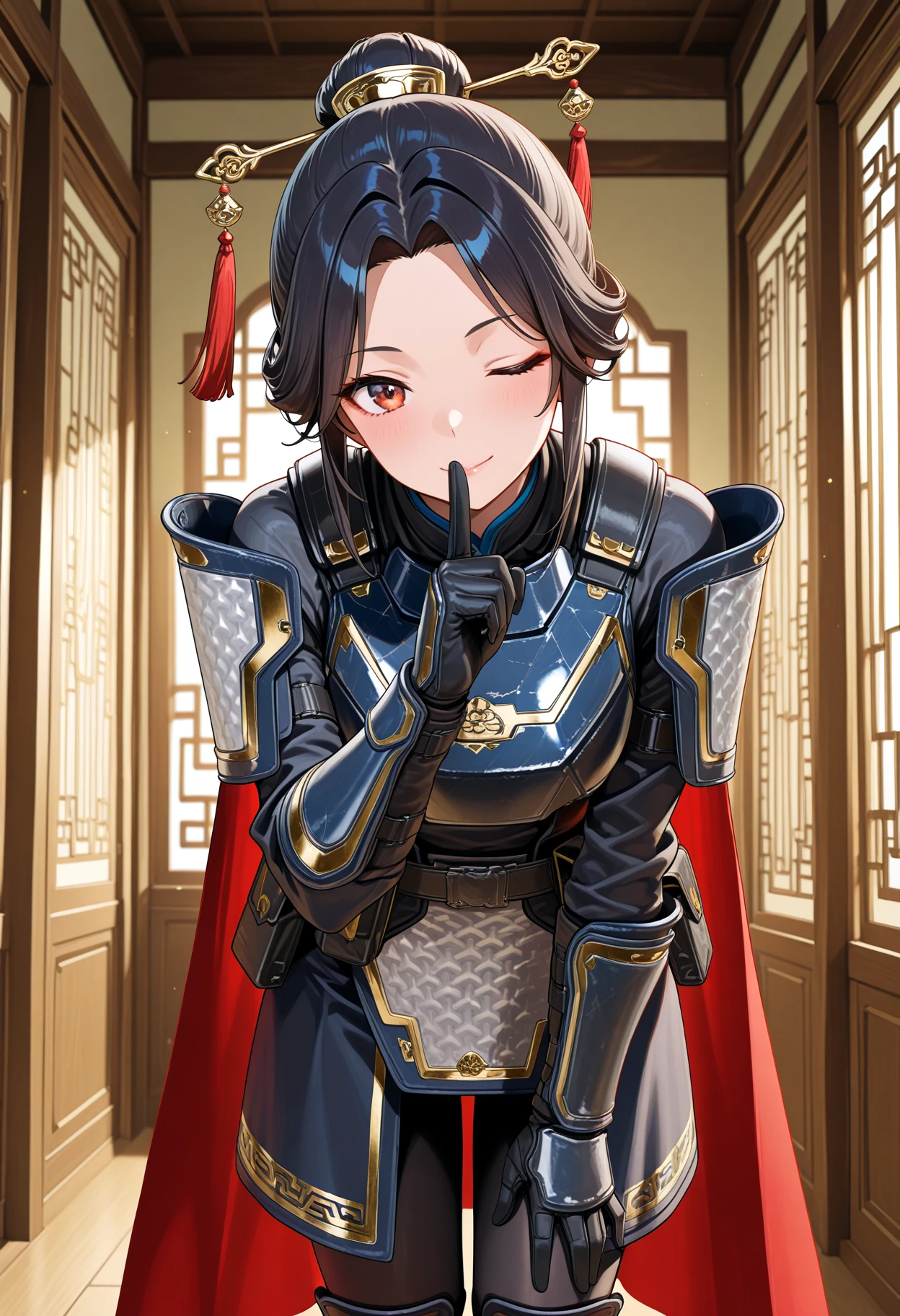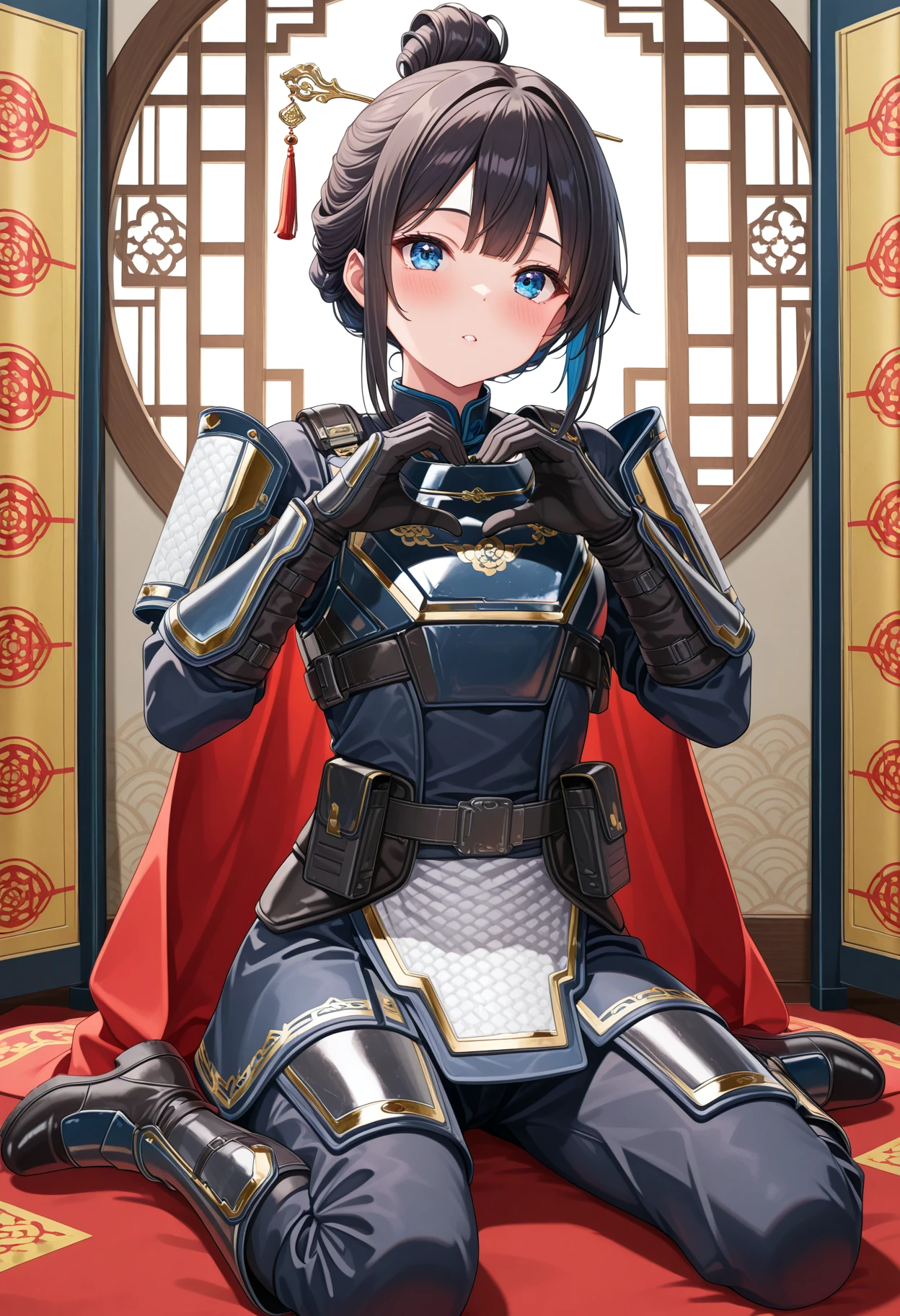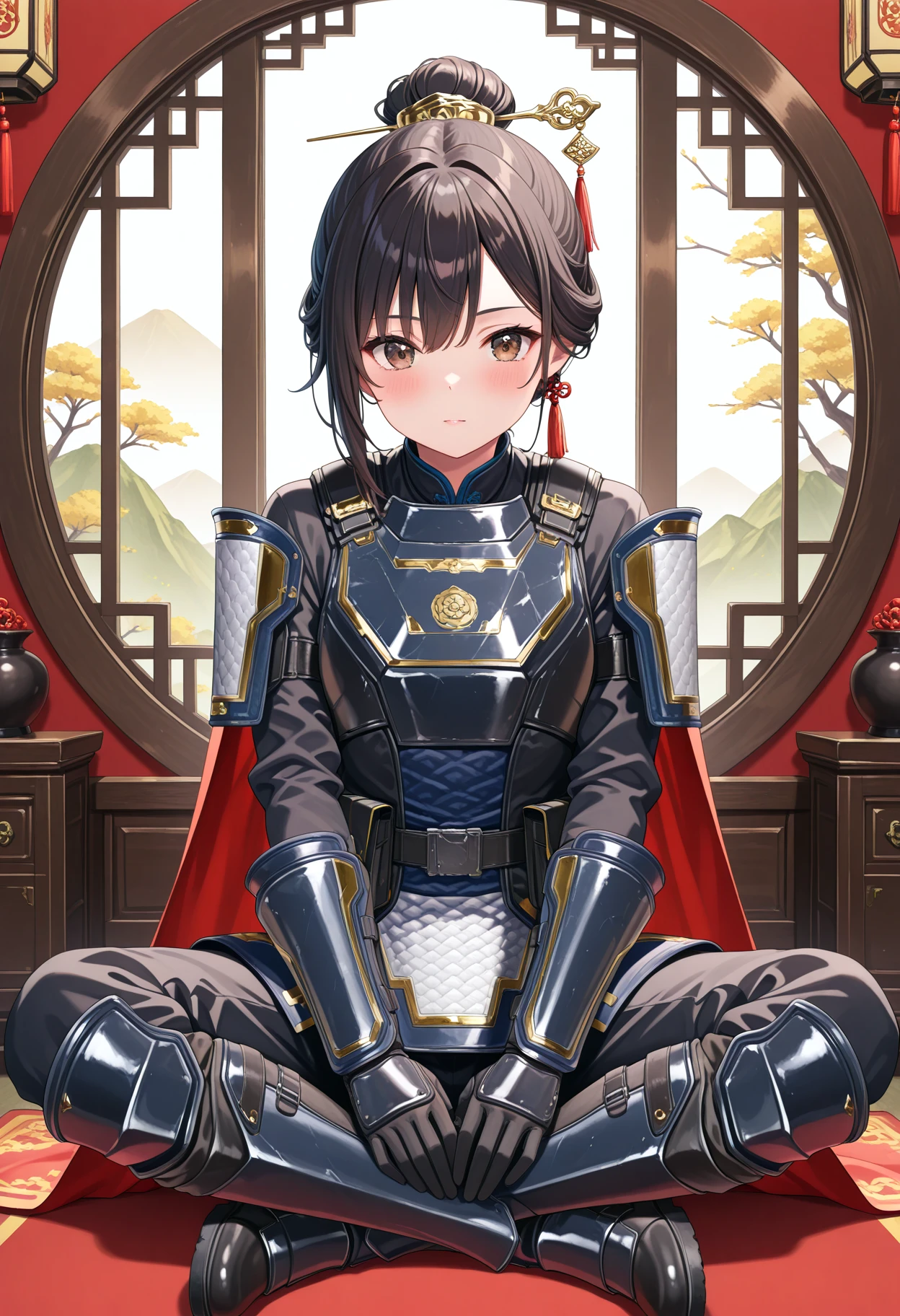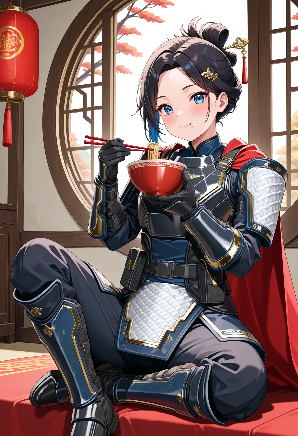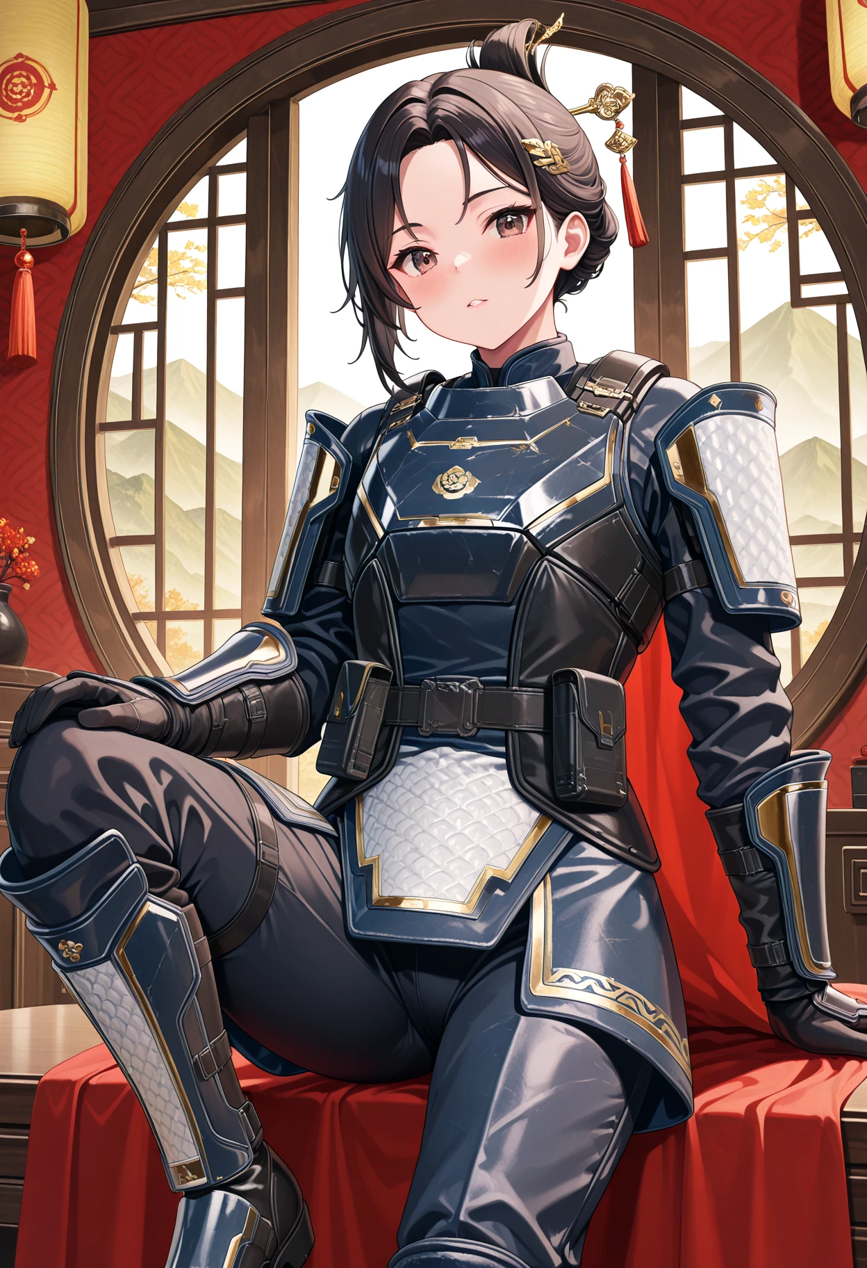 mountain pattern armor, oriental armor style, black and blue armor, y-shaped scales on armor, gold trim on armor, ornate patterns on armor