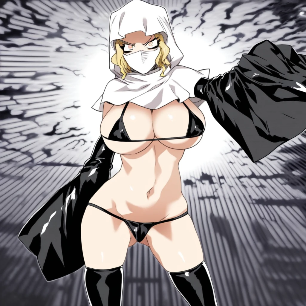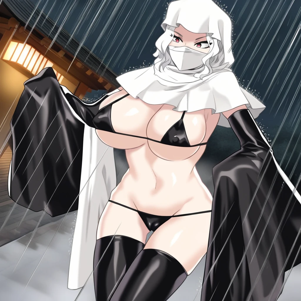 1. ((white monk cowl mantle with hood, white face mask, sexy shiny black latex bikini top, sexy shiny black latex bikini bottom, sexy shiny wide black latex armsleeves, sexy shiny black latex thighhigh, )) white pearl braceltes, white pearl anklets, flip-flops,