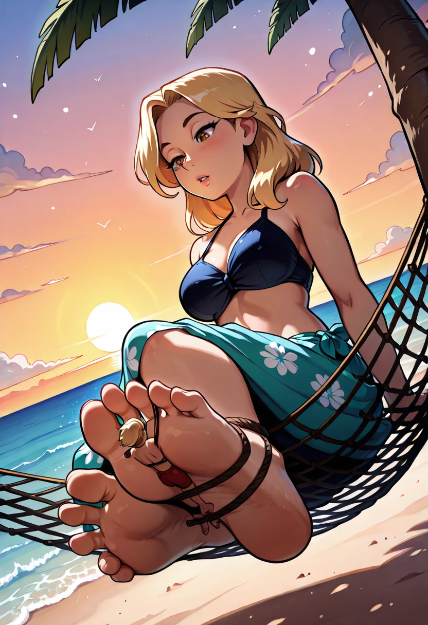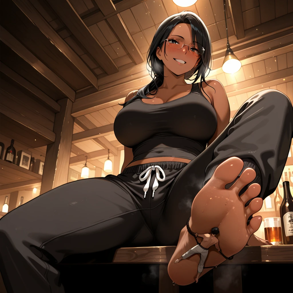fT13d, giantess <pose>, tiny <man/woman>, bound with <rope/string/chain/ribbon>, soles, <other descriptors about the characters and setting>