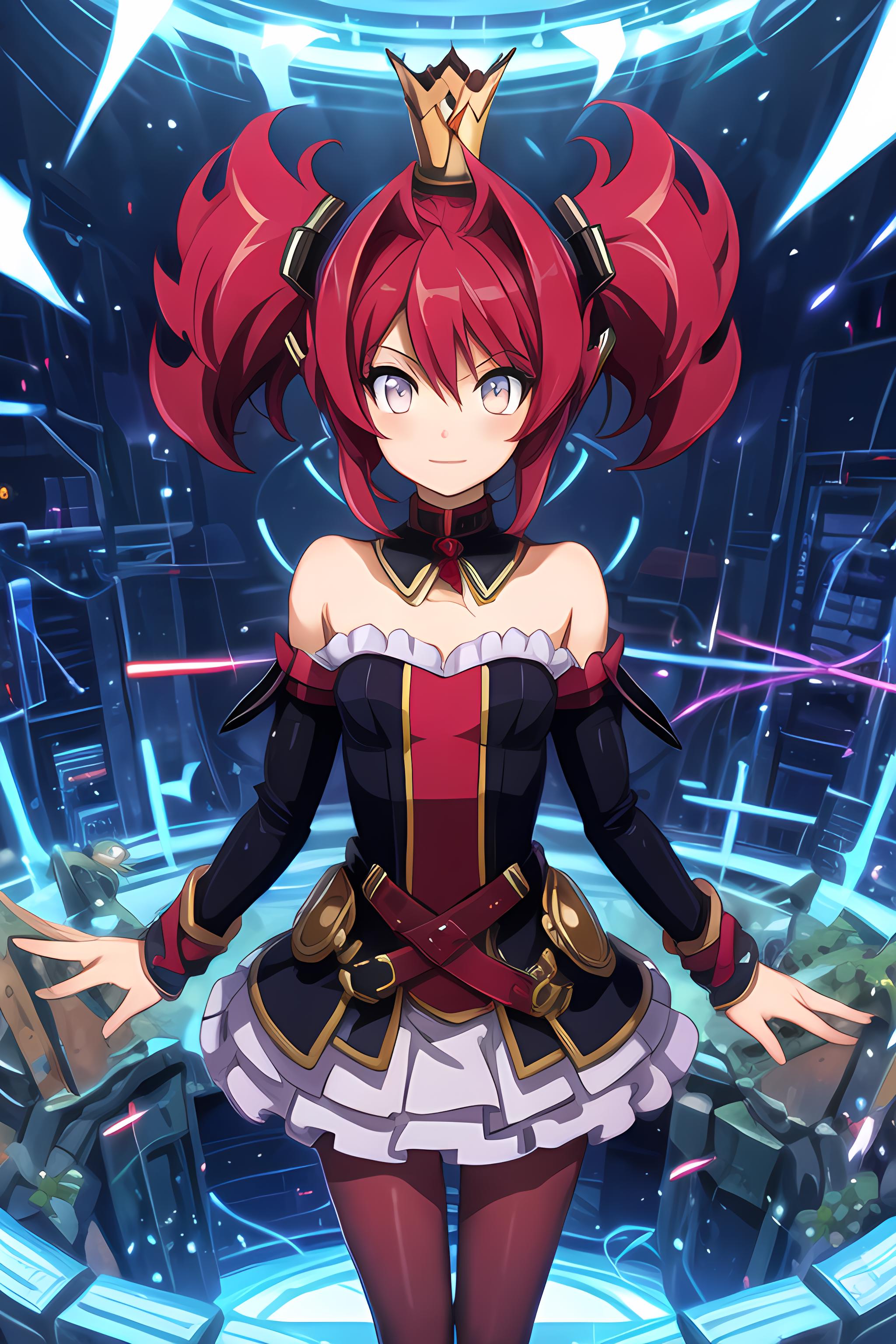 Default outfit : " petta_pk, red hair, twintails, short hair, white eyes, pantyhose, bare shoulder, detached sleeves, crown "