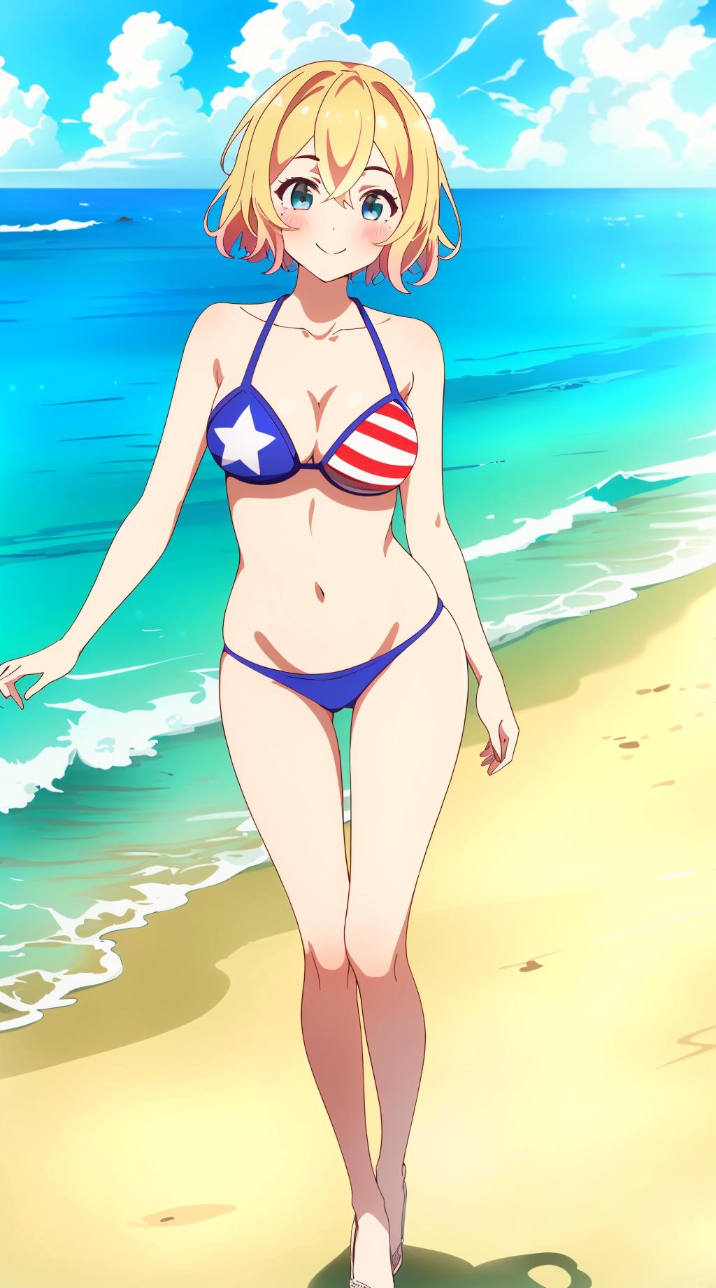 套装一,flag print,swimsuit,bikini,american flag bikini,medium breasts,collarbone,cleavage,navel,breasts, bare thighs,