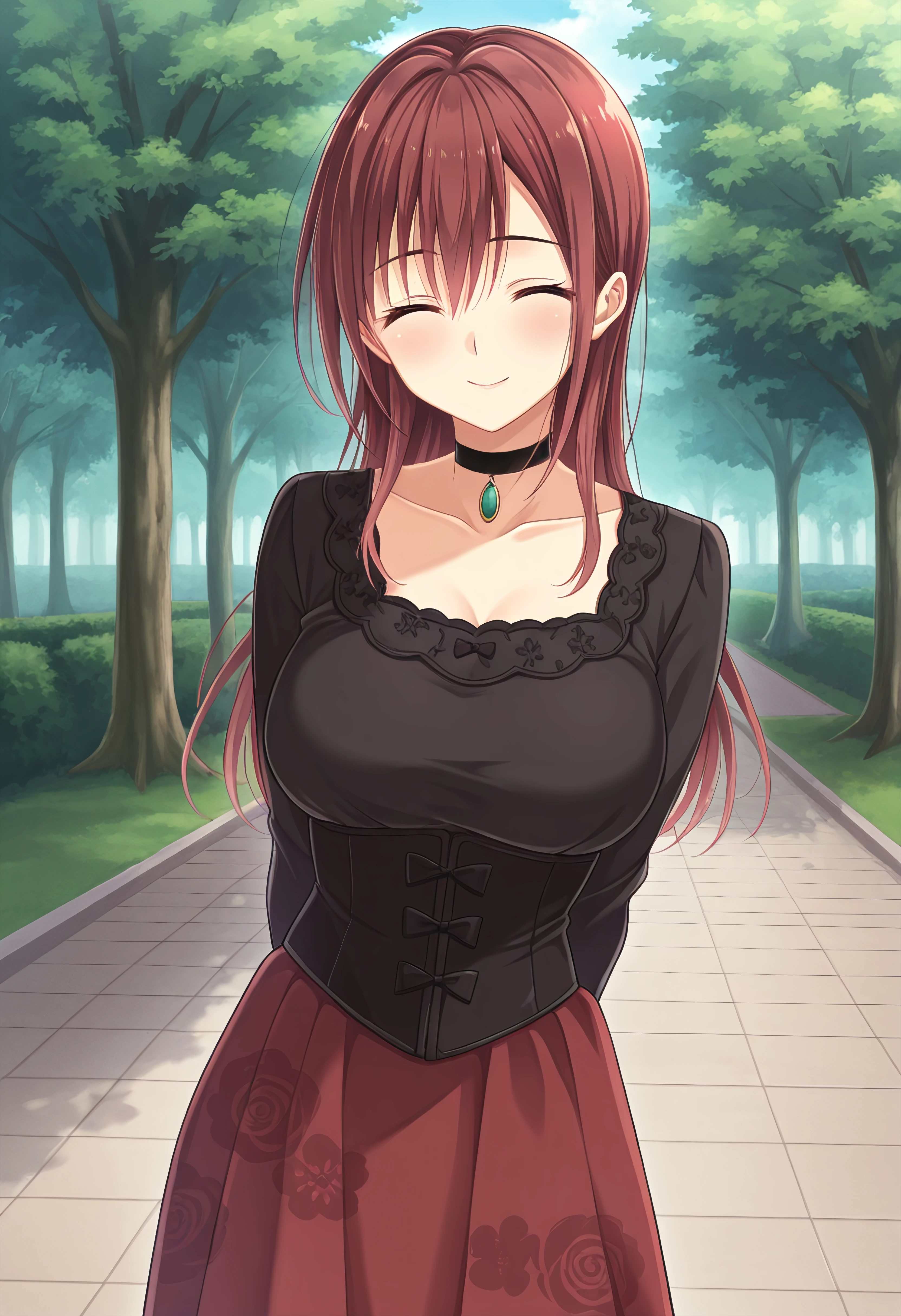 Outfit 3 (Casual): yuusakishioncasual, black choker, gem, black shirt, corset with black bows, long skirt, red skirt with floral print