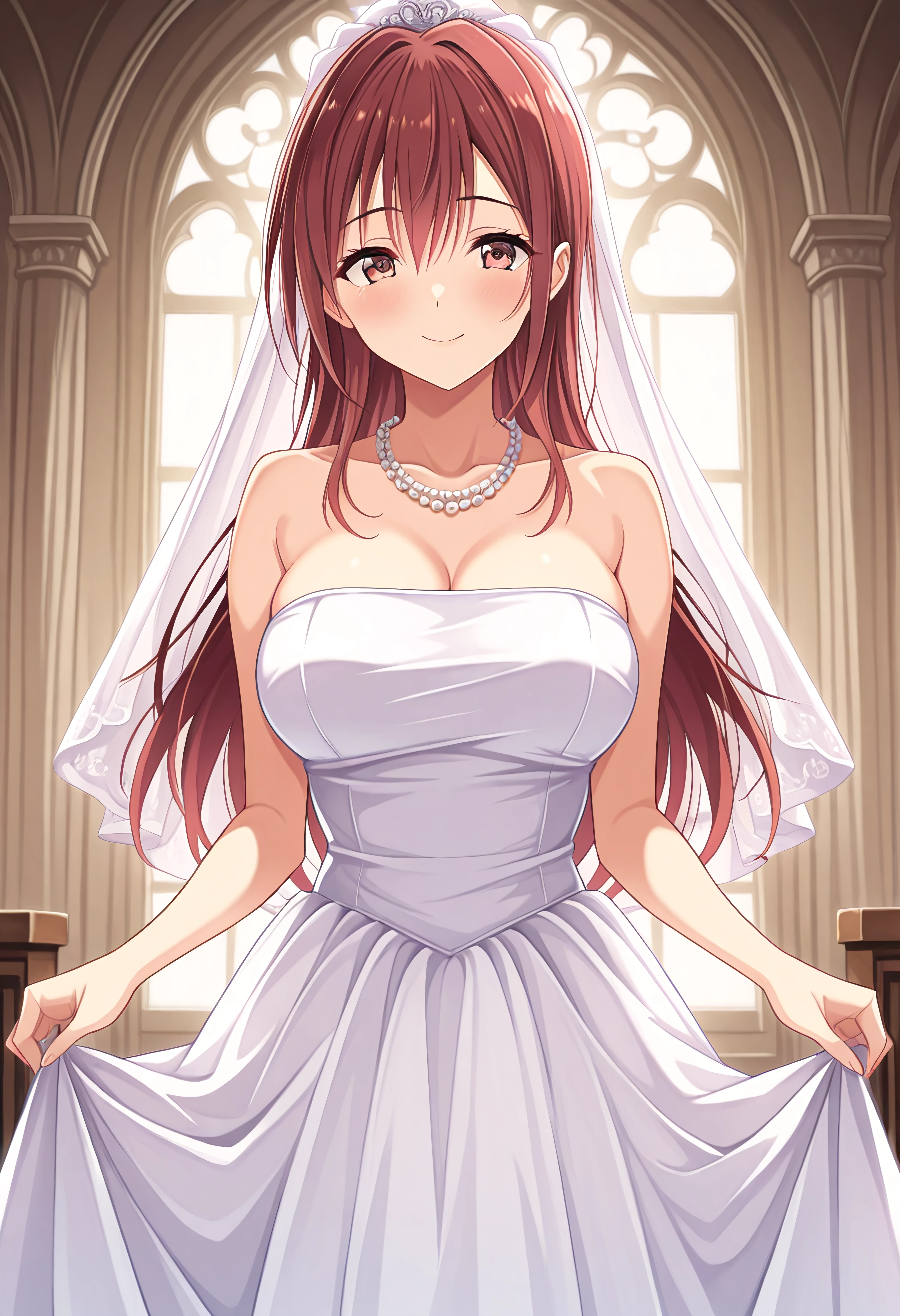 Outfit 4 (Wedding): yuusakishionwedding, white dress, wedding dress, pearl necklace, smile, strapless, ???? shoulders