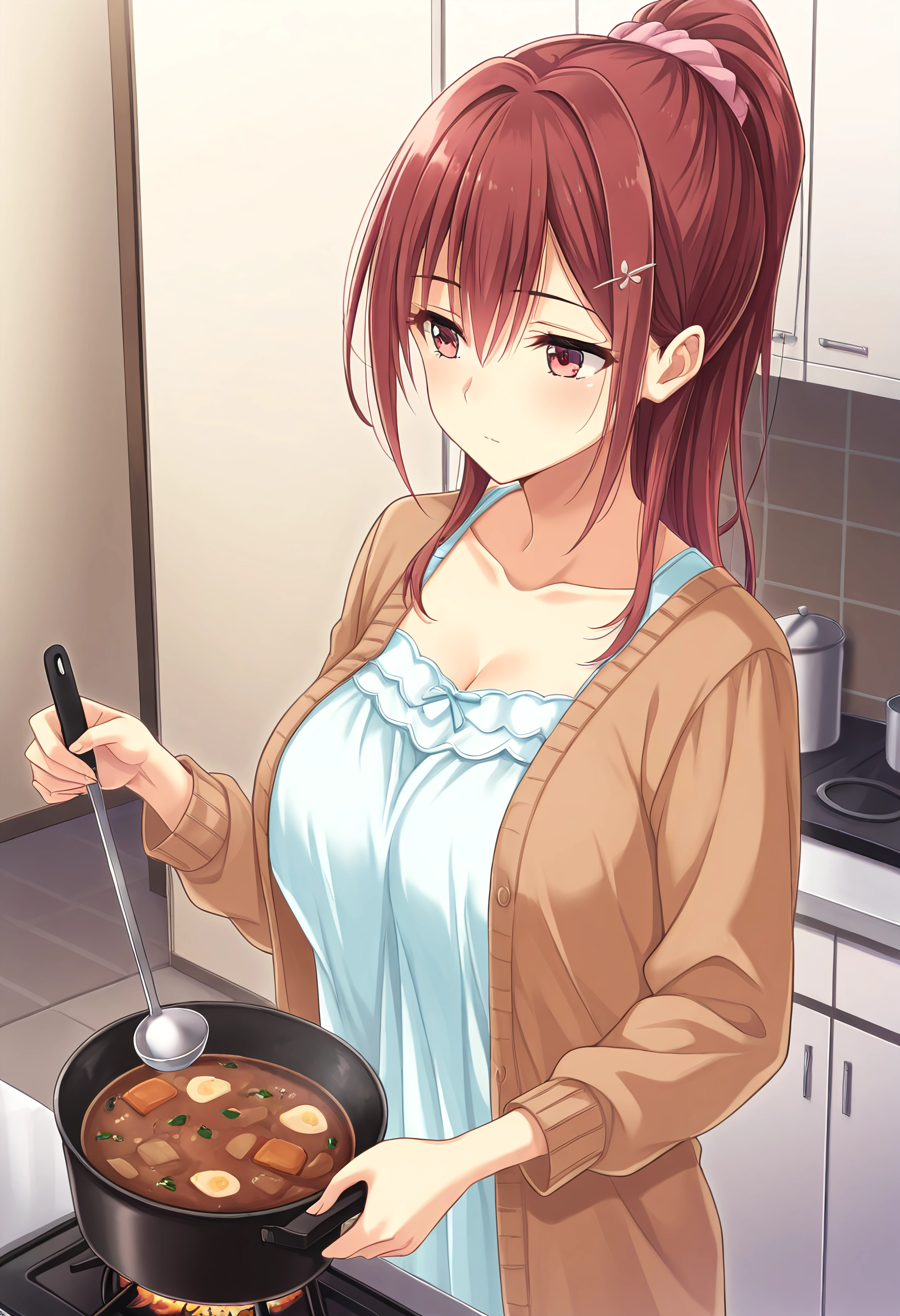 Optional (Ponytail): high ponytail, hair ornament, hairclip, pink scrunchie