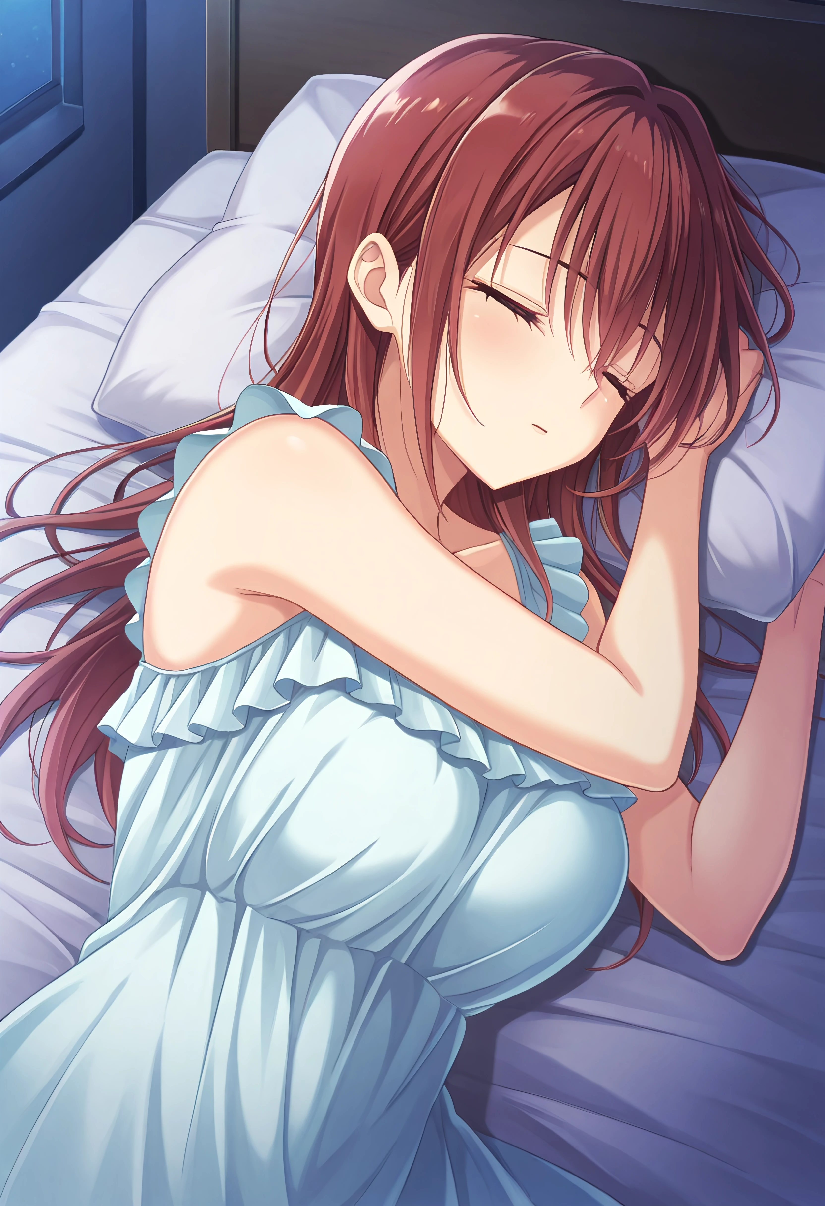 Outfit 4 (Nightgown): yuusakishionnightgown, 1girl, solo, red hair, long hair, sleeping, lightblue nightgown, frills