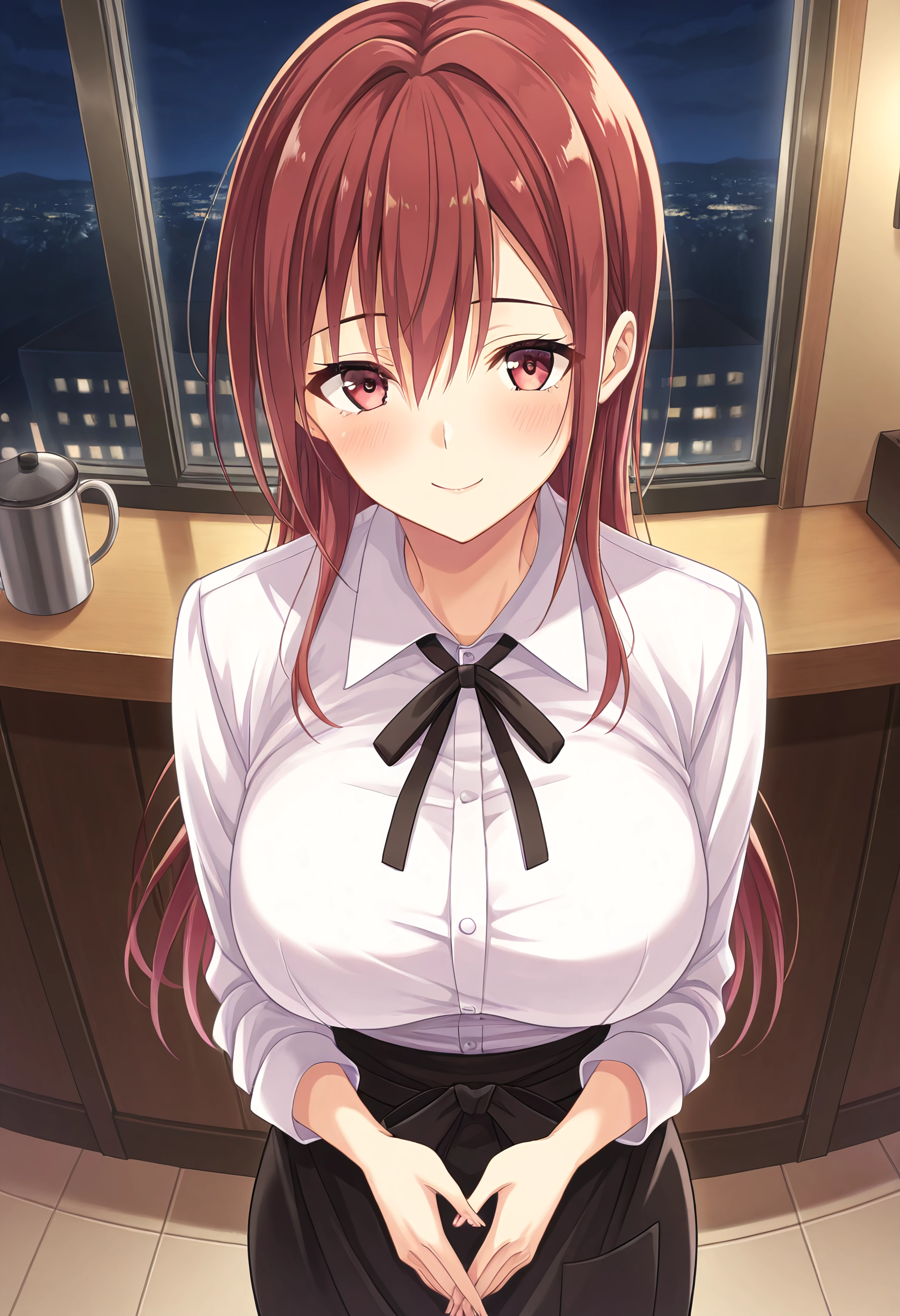 Outfit 1 (Waitress): yuusakishionbarista, white dress shirt, long sleeves, high-waist skirt, long black skirt, black waist-apron, black neck-ribbon