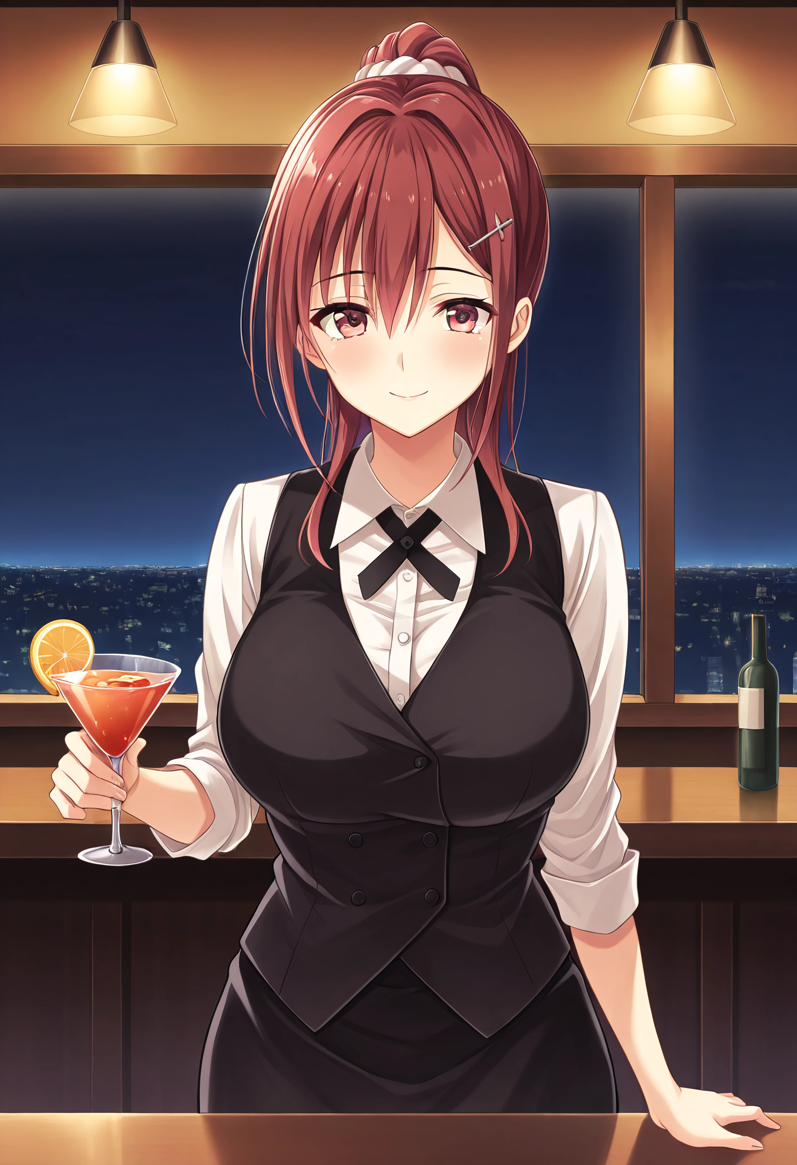 Outfit 2 (Bartender): yuusakishionbartender, white dress shirt, long sleeves, black vest, buttons, black skirt, black neck-ribbon
