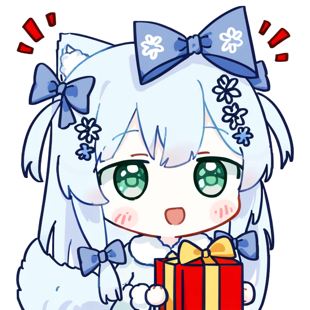 quqchan, blue hair, cat ears fluff, green eyes, hair bow, two side up, braids, hair flowers, strapless dress, detached collar, snowflake necklace, fluffy tail, white thighhighs, frills