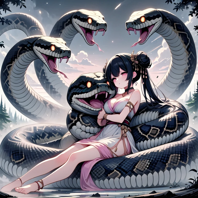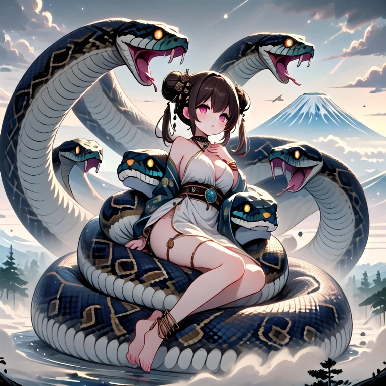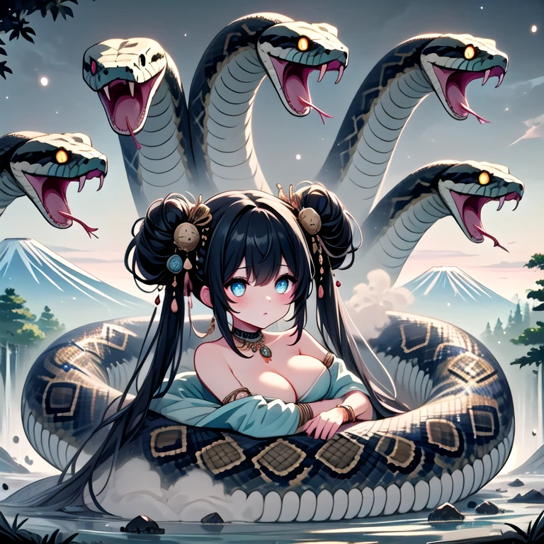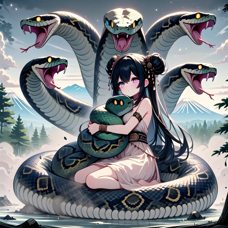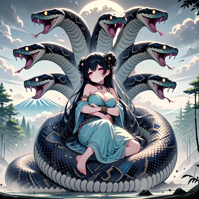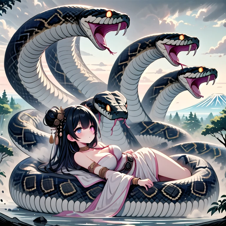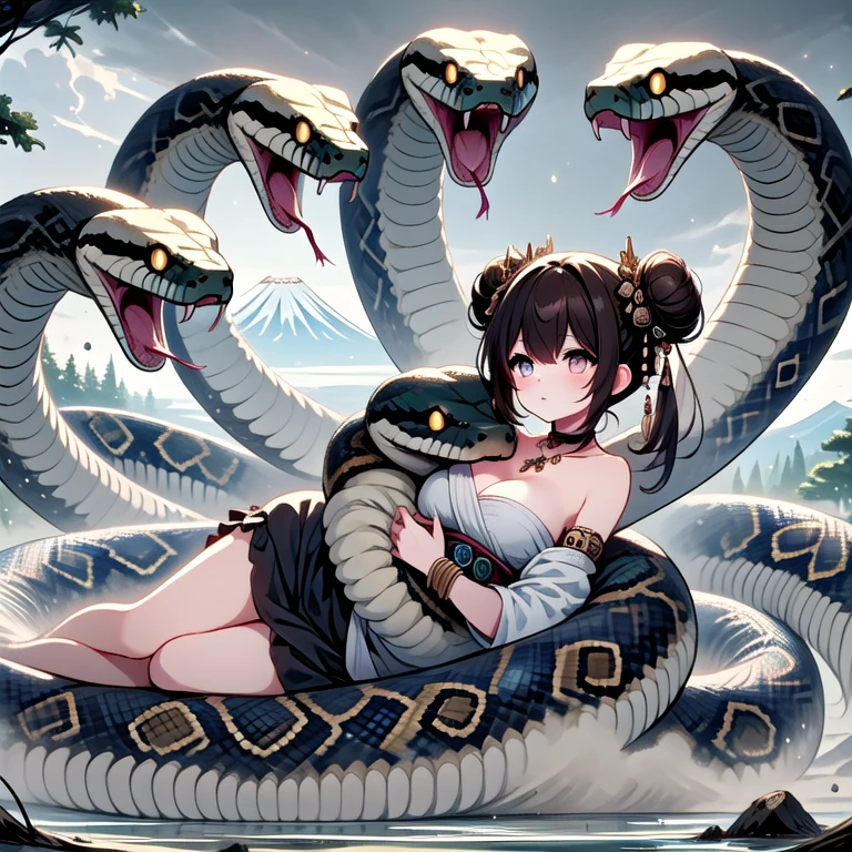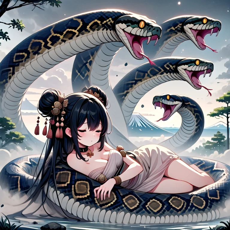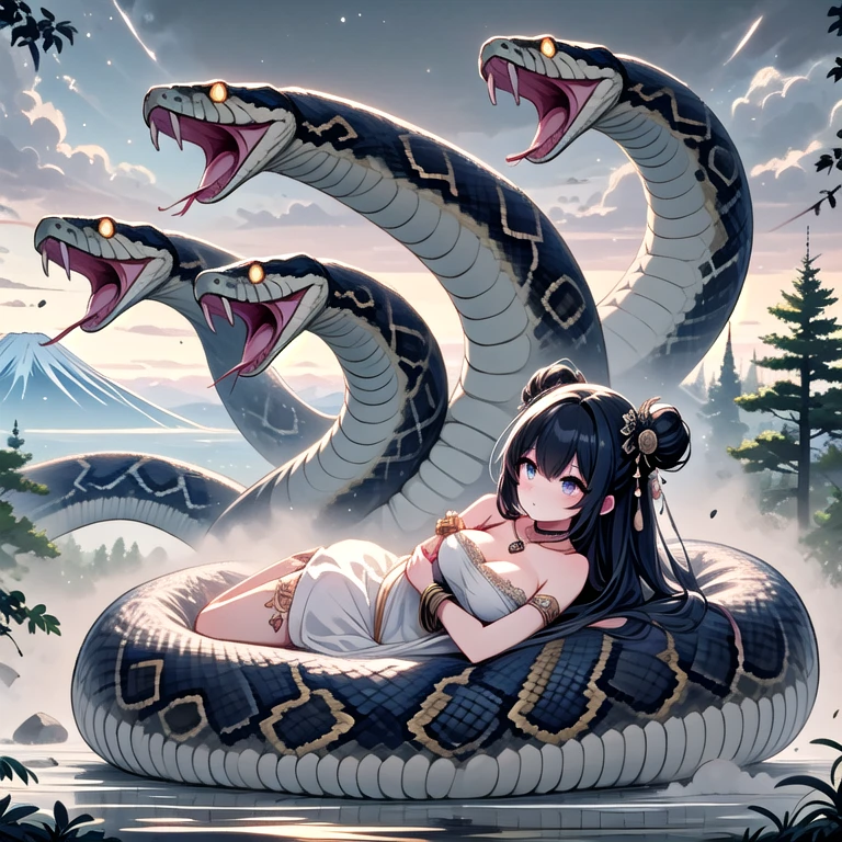 (((orochi))), (((extra snake wrapped around body))), lying on oversized animal, hug, milf, 1girl, glowing eyes, black hair, hair ornament, long hair, double bun, hair bun, tattoo, cleavage, breasts, off shoulders, dress, nacklace, jewelry, bracelet, fog, tree, dust, steam, symmetry, mount fuji, cloudy sky, full body,