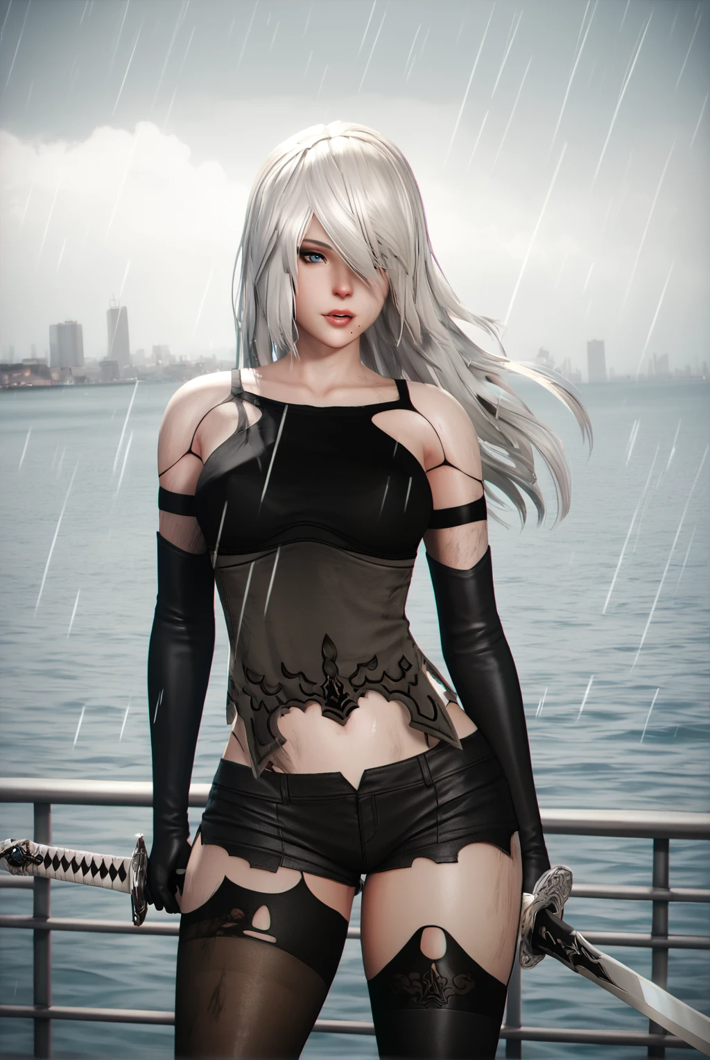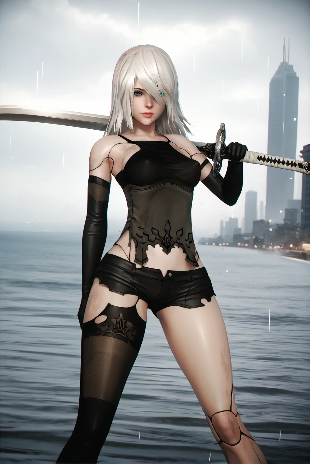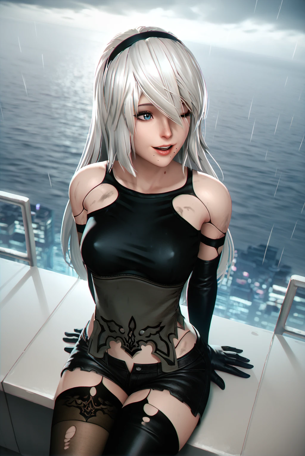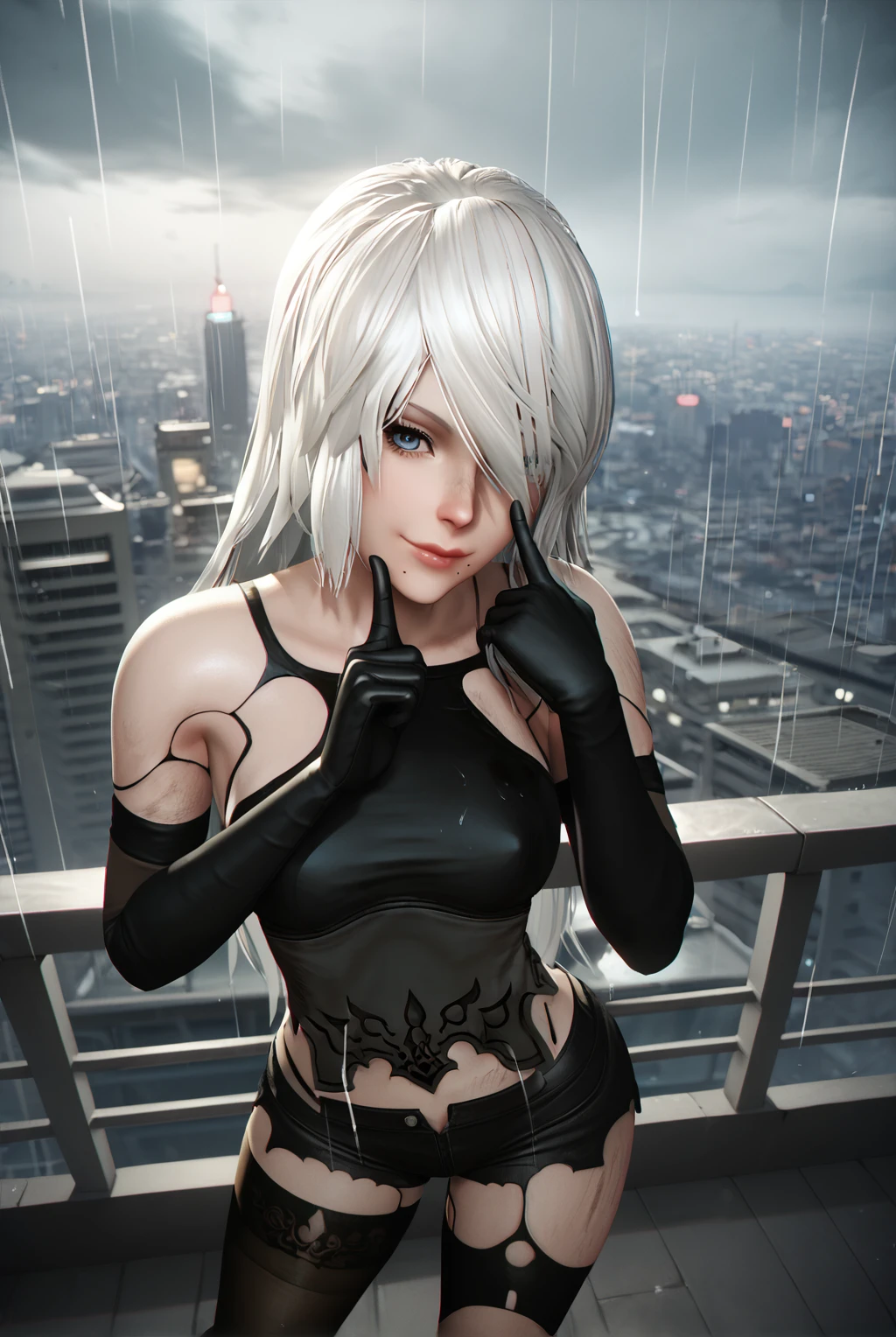 a2 (nier:automata), short hair, blue eyes, hair over one eye, black tank top, black corset, bare shoulders, black gloves, black thighhighs, elbow gloves, short shorts, black shorts, single thighhigh, mole under mouth, asymmetrical legwear, dirty, robot joints