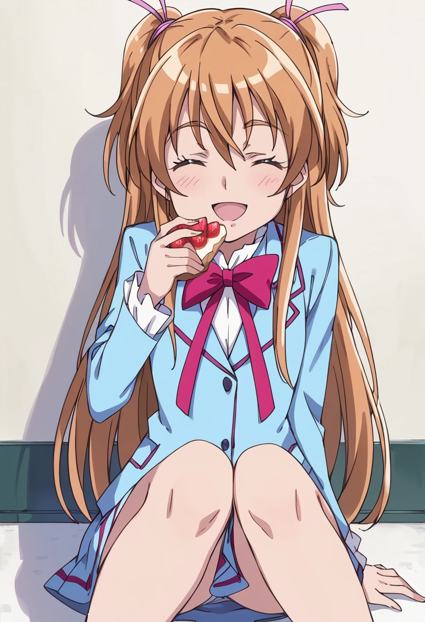 houjou hibiki, aria gakuen school uniform, two side up, half updo, brown hair, orange hair, blonde hair, hair between eyes, long hair, eyelashes, eyebrows visible through hair, blue eyes, hair ribbon, pink ribbon, blue shirt, blue jacket, blazer, white shirt, long sleeves, pink neckwear, pink bow, bowtie, blue skirt, miniskirt, socks, black legwear, loafers, brown footwear
