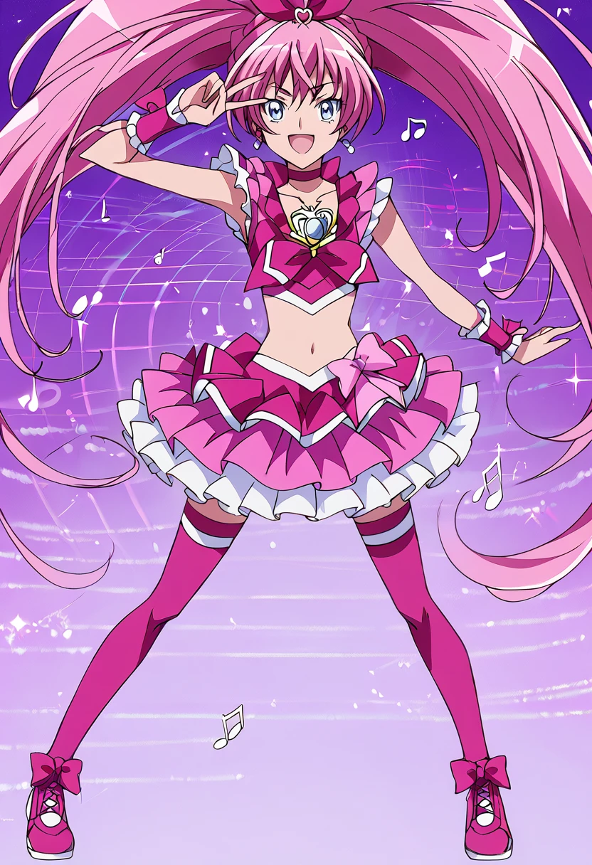 cure melody, pink hair, twintails, very long hair, hair between eyes, braid, eyelashes, eyebrows visible through hair, blue eyes, crop top, pink shirt, frilled shirt, frilled sleeves, pink choker, ribbon choker, pink neckwear, hair bow, pink bow, hair ornament, hairband, earrings, brooch, wrist cuffs, arm warmers, pink skirt, frilled skirt, layered skirt, miniskirt, petticoat, pink legwear, pink thighhighs, pink footwear, thigh boots, midriff, navel