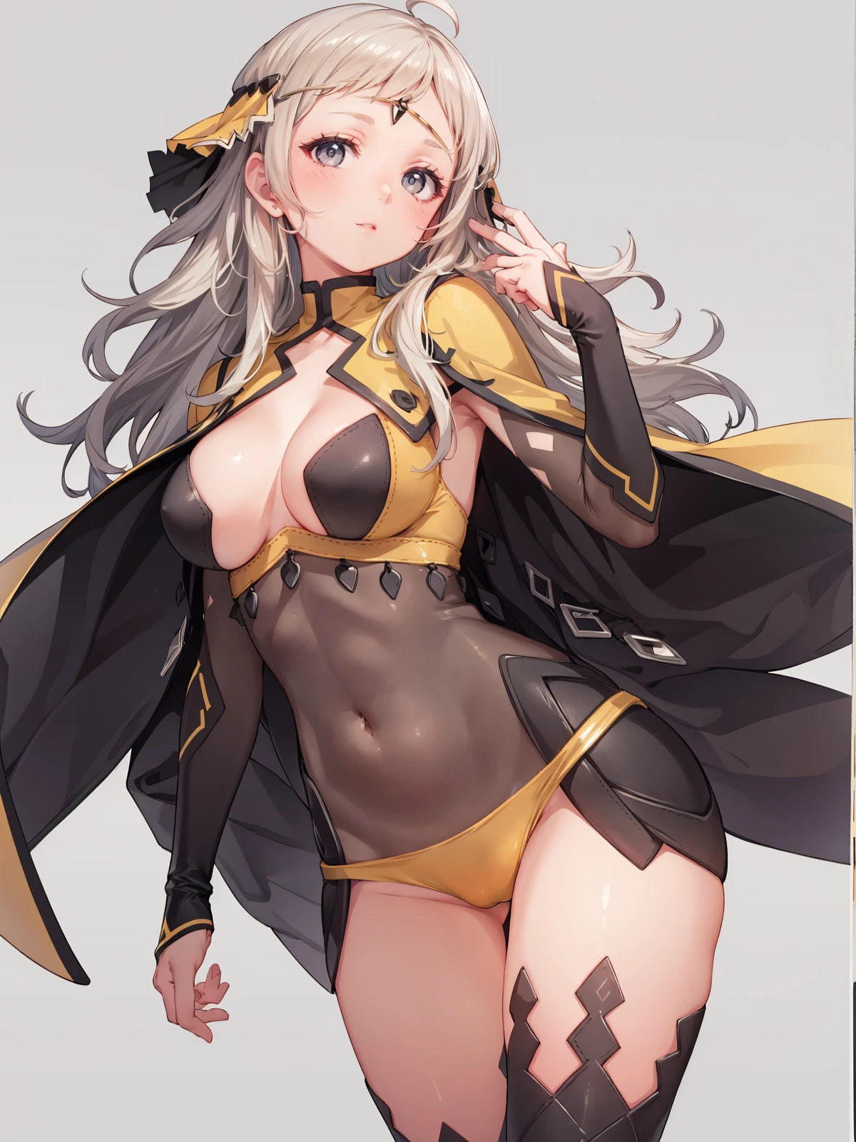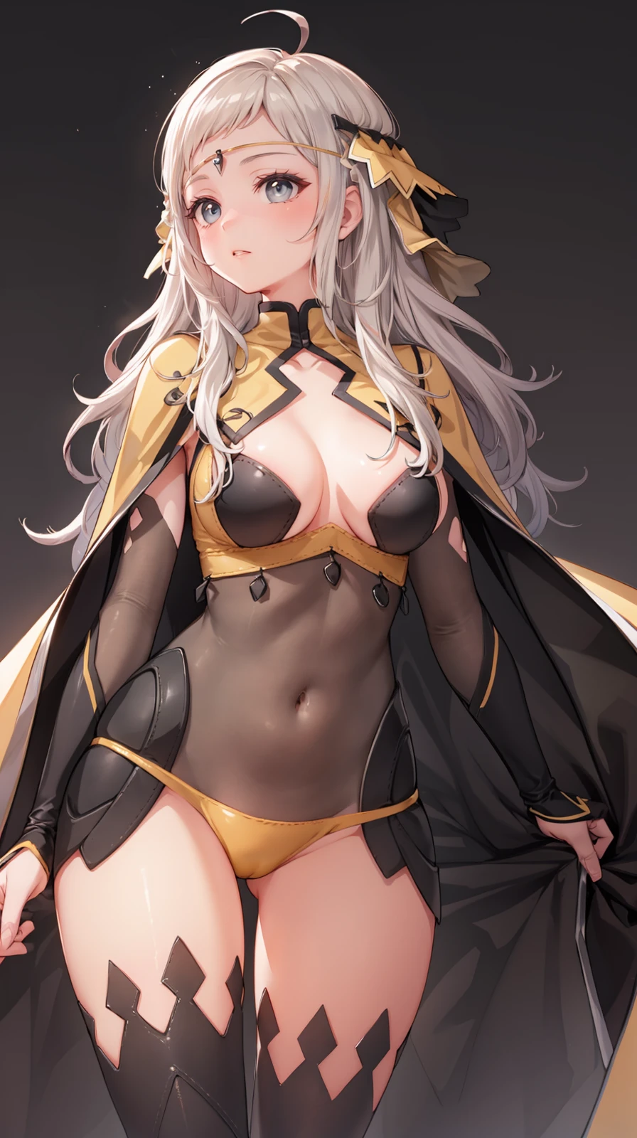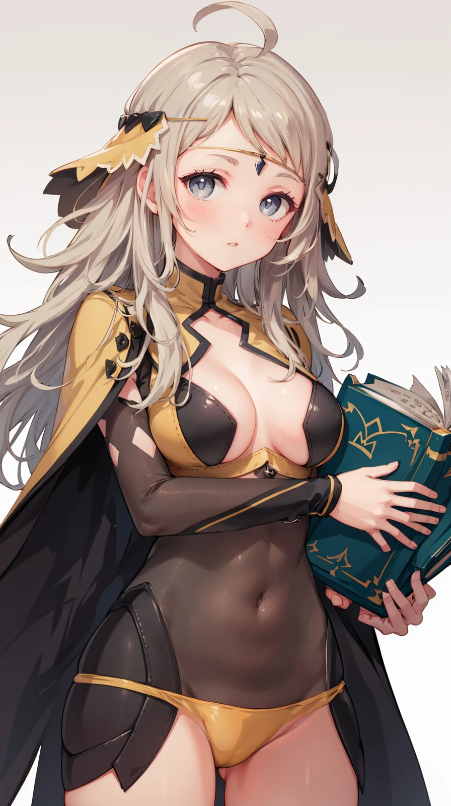 grey eyes, long hair, blonde hair, ahoge, cape, circlet, bodystocking, turtleneck, thighhighs, cleavage, yellow panties, book, holding book, elbow gloves, high heels, toeless footwear