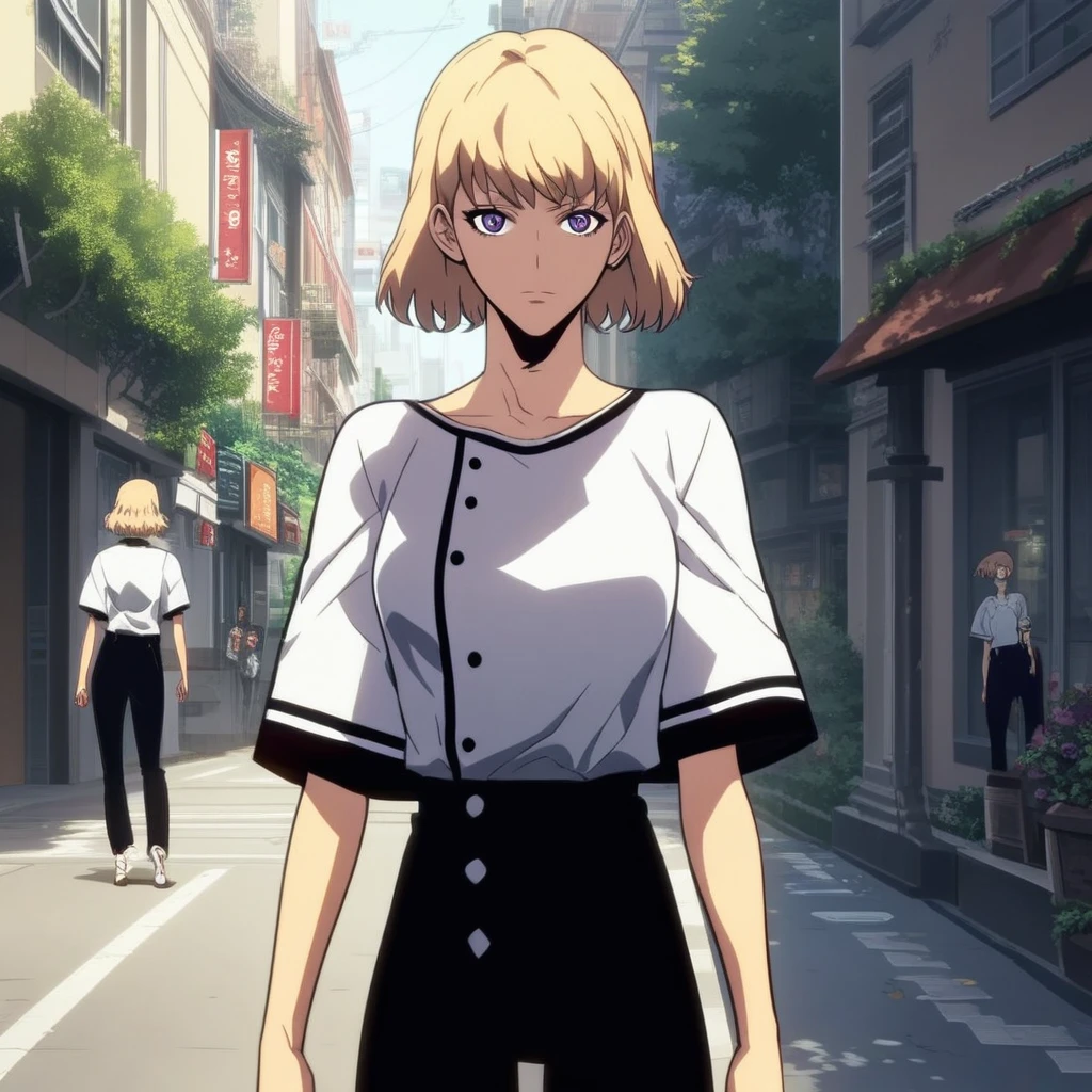 casual clothes: Shirt with side buttons, white shirt, short sleeves, black skinny pants, shirt tucked into pants,
