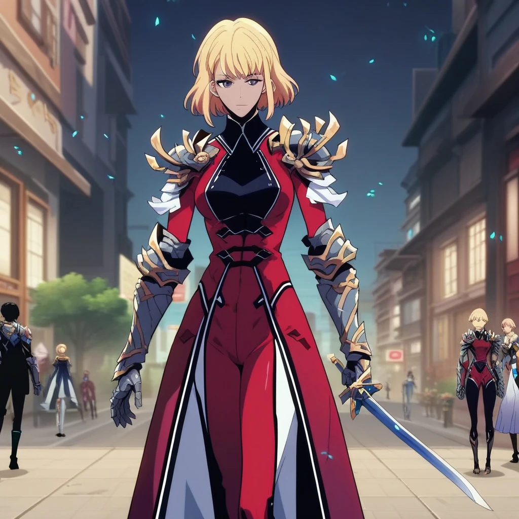 battle suit: battle suit, metal shoulder pad, silver and gold shoulder pad, fitted jacket, red jacket, black turtleneck, metal gauntlets, sword at waist, red tight pants, long white overskirt,