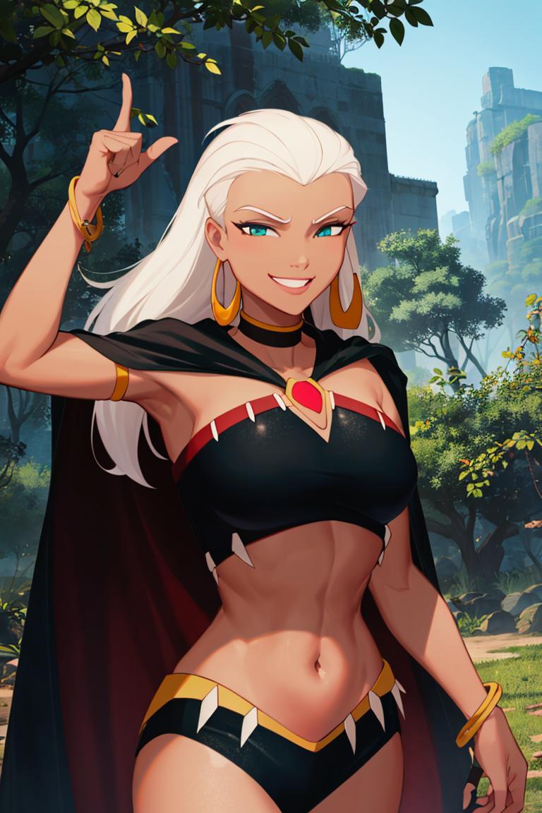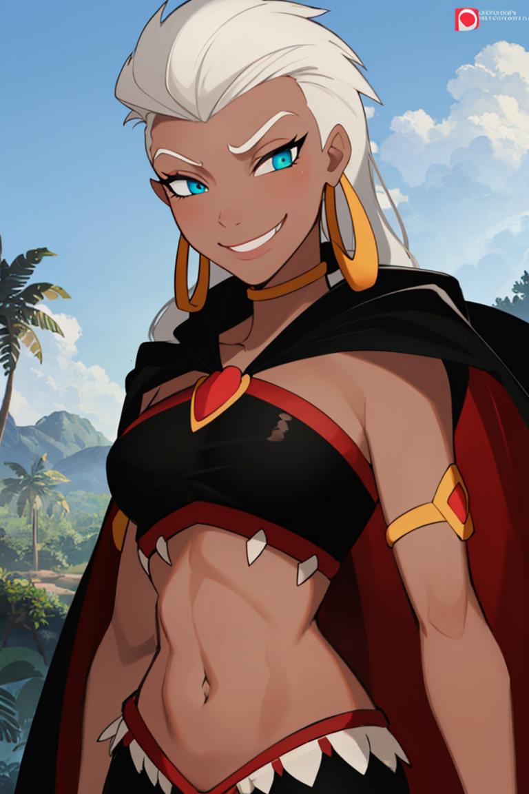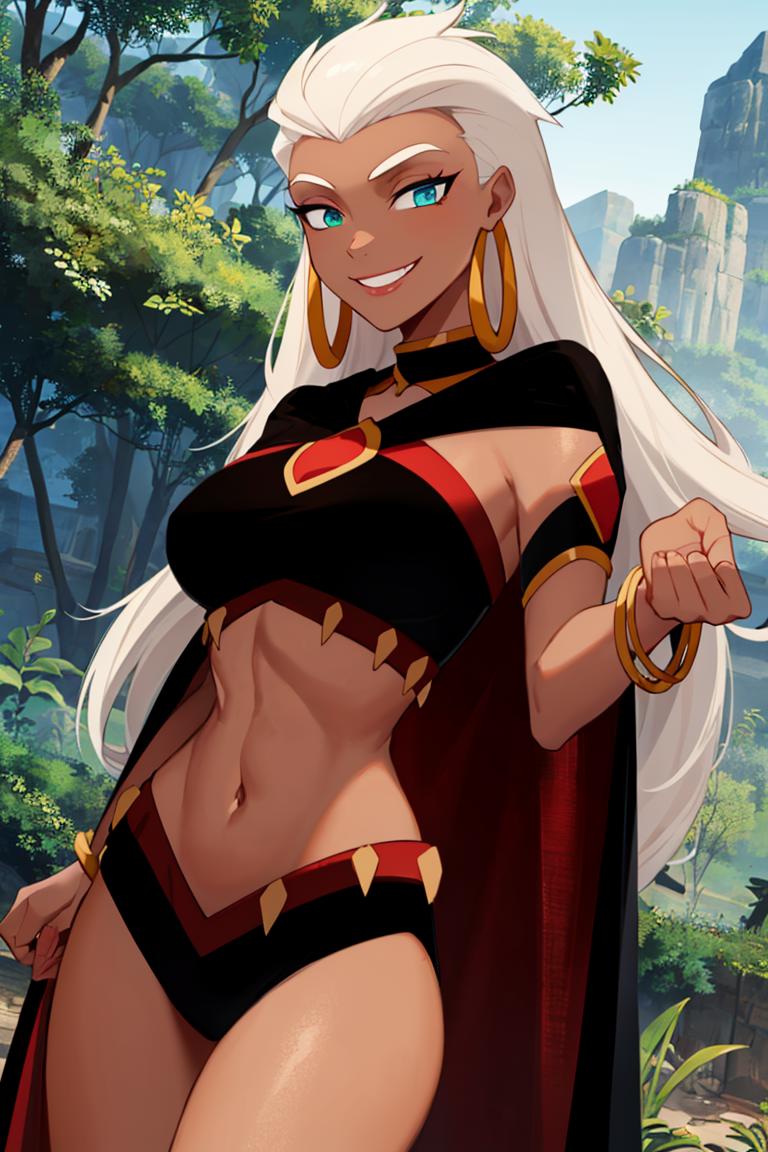 Extra prompts: cape, dark skin, long white hair, black crop top,
