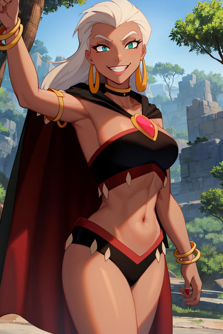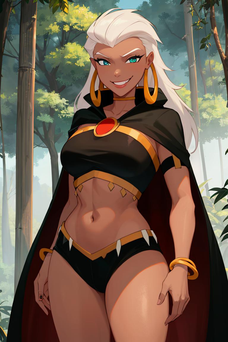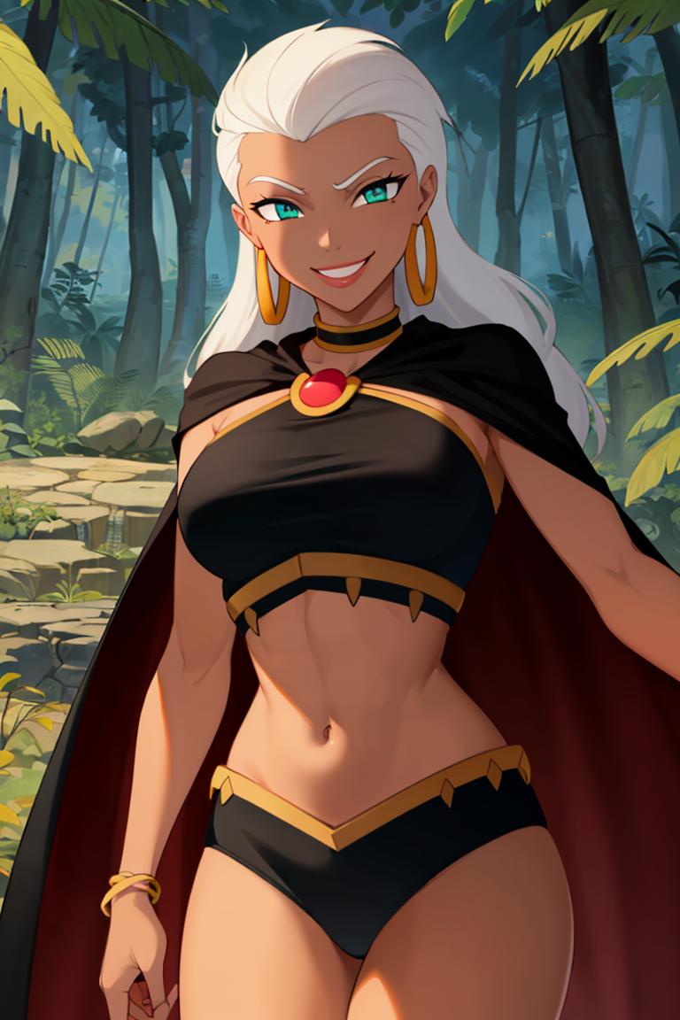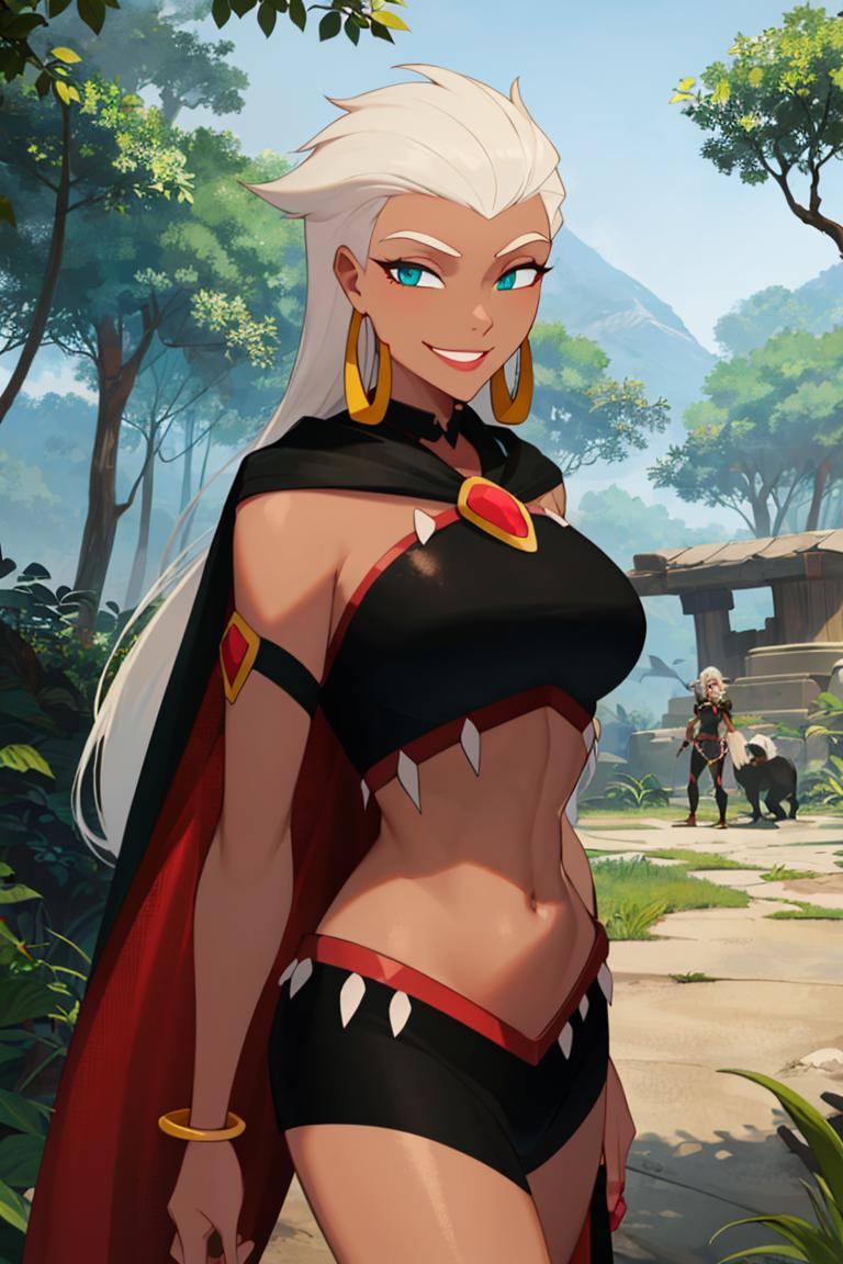 Extra prompts: cape, dark skin, long white hair, black crop top,