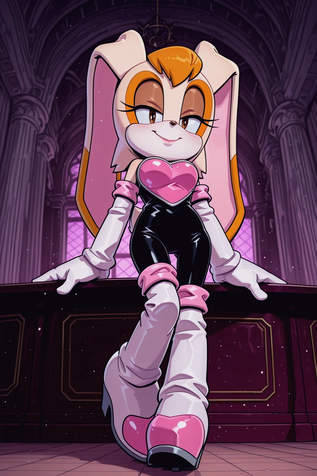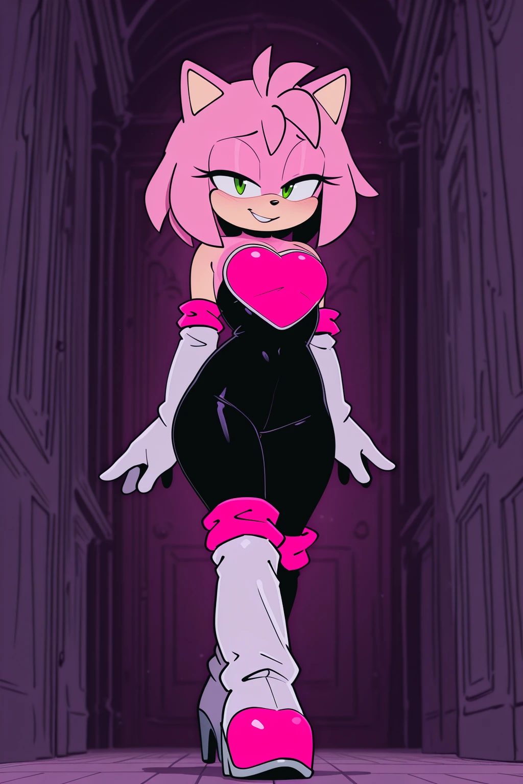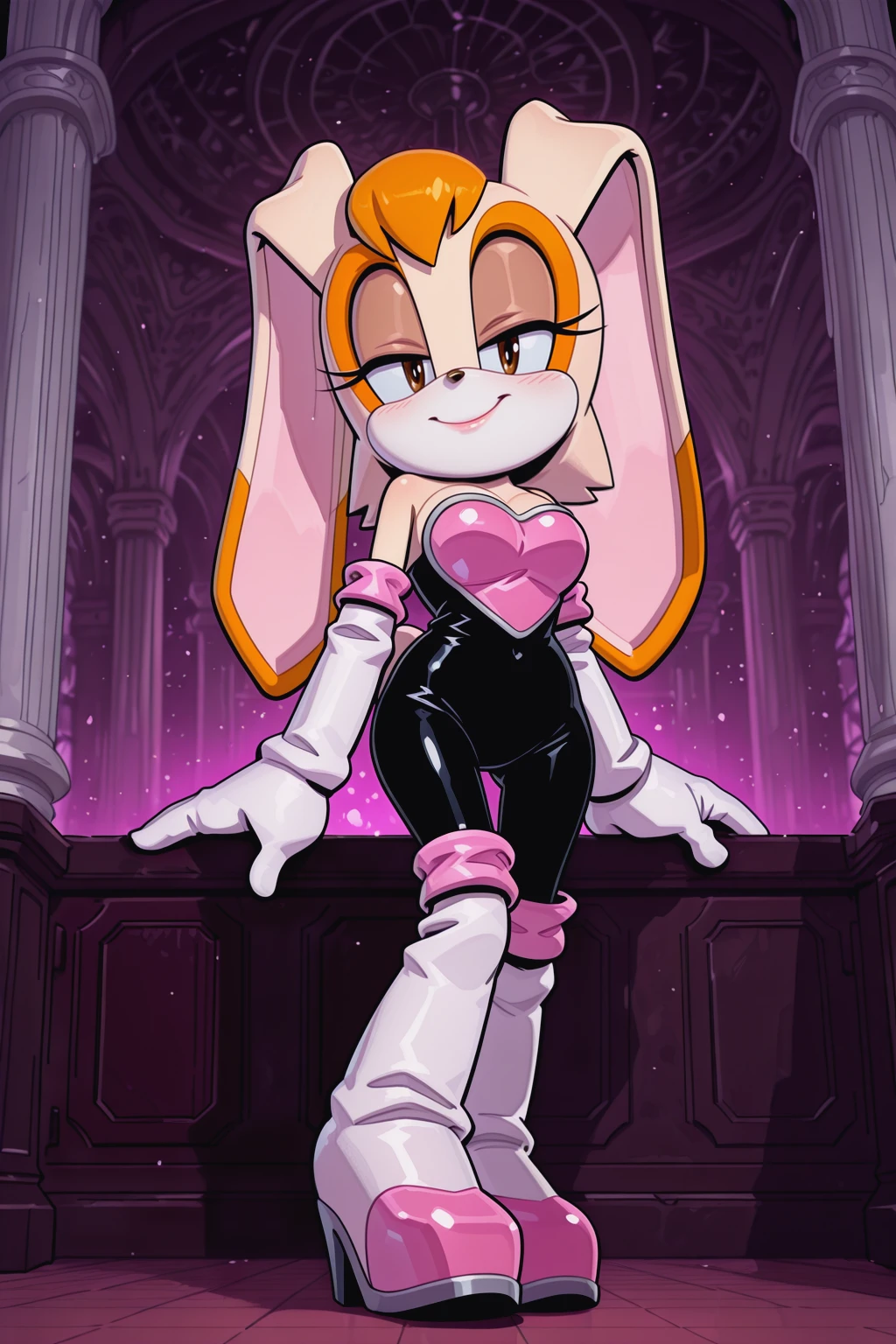 rouge the bat \(cosplay\), black , pink chestplate, high heels, knee boots, elbow gloves,