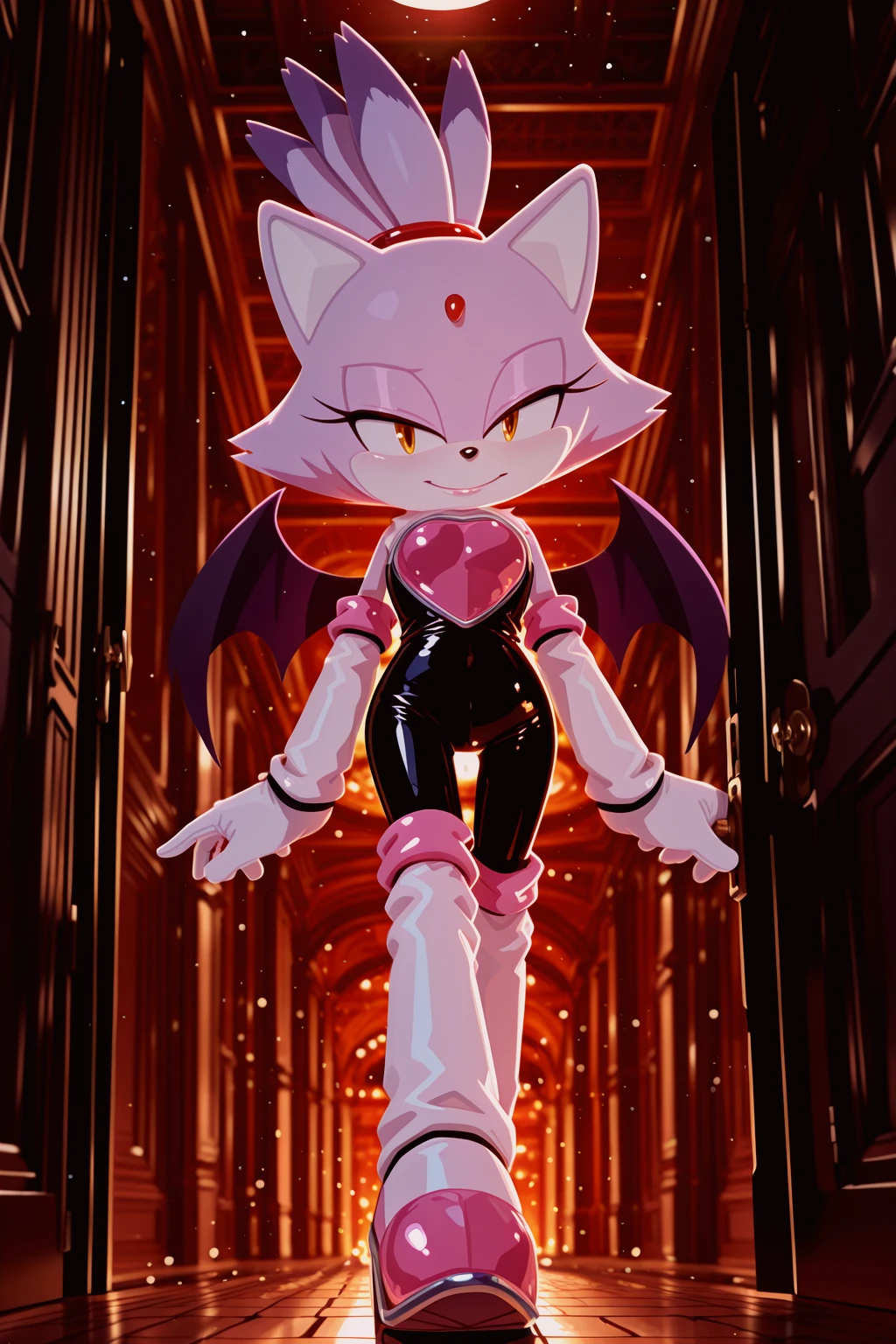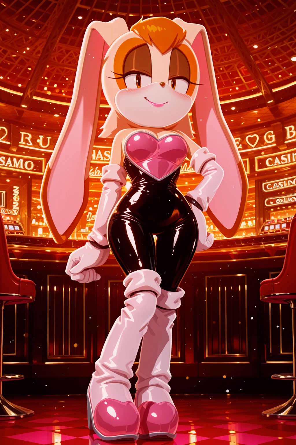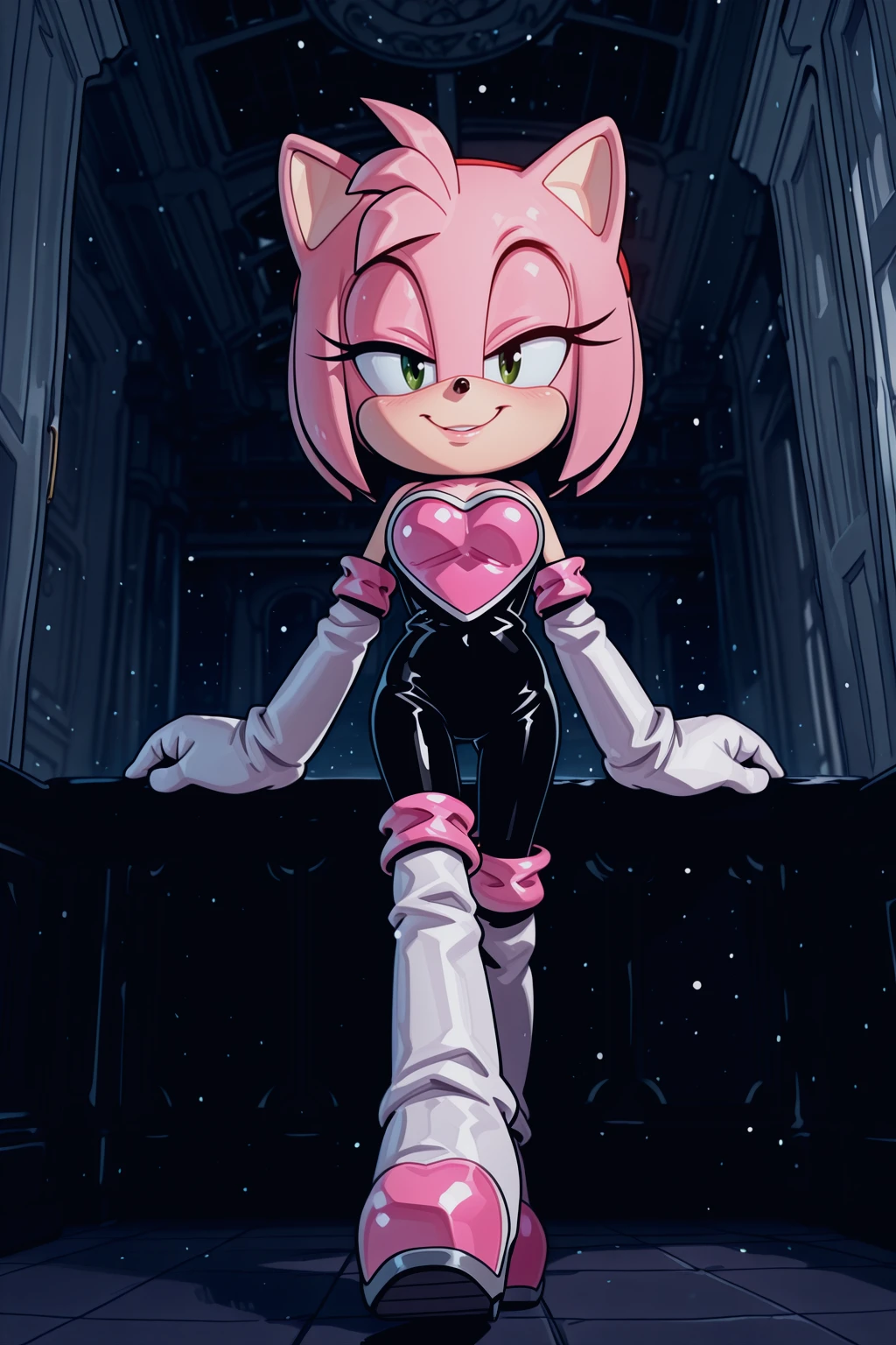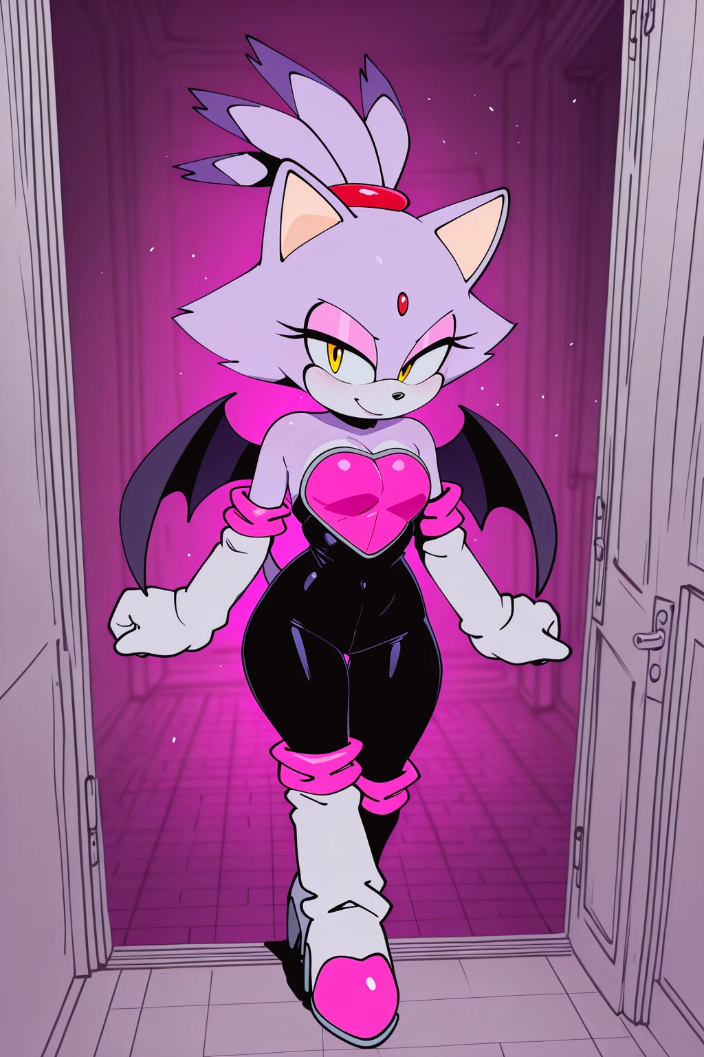 rouge the bat \(cosplay\), black , pink chestplate, high heels, knee boots, elbow gloves,