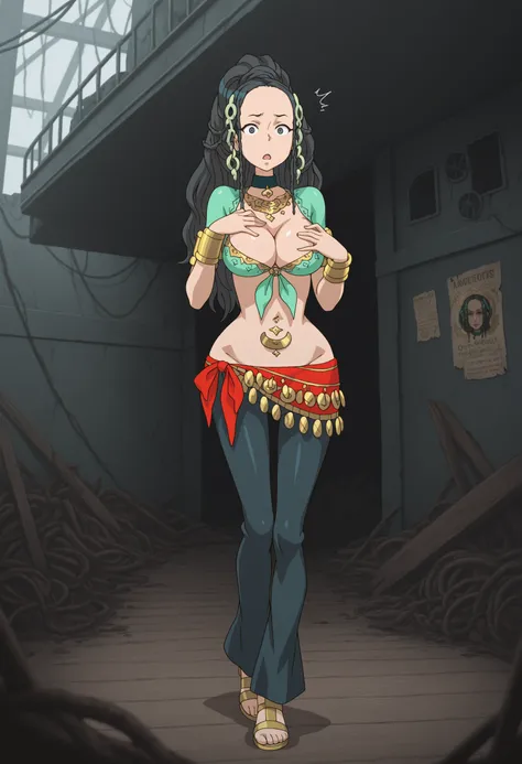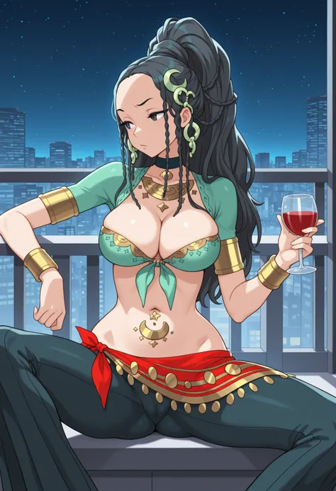 dark green choker, front-tie top, multicolored shirt, cyan shirt, yellow shirt, crop top, cleavage, short sleeves, golden necklace, midriff, golden bracelet, golden armlet, navel piercing, golden crescent, groin, multicolored sarong, red sarong, yellow sarong, dark blue pants,