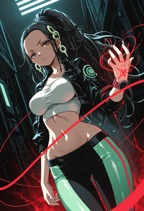 lotutus, 1girl, large breasts, dark grey hair, long hair, hair pulled back, high ponytail, hair ornament, light green ornament, dreadlocks, dark grey eyes,