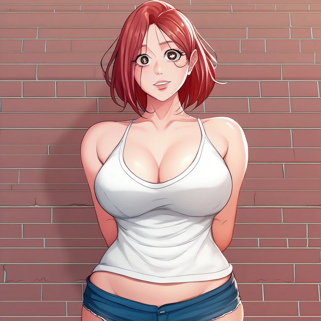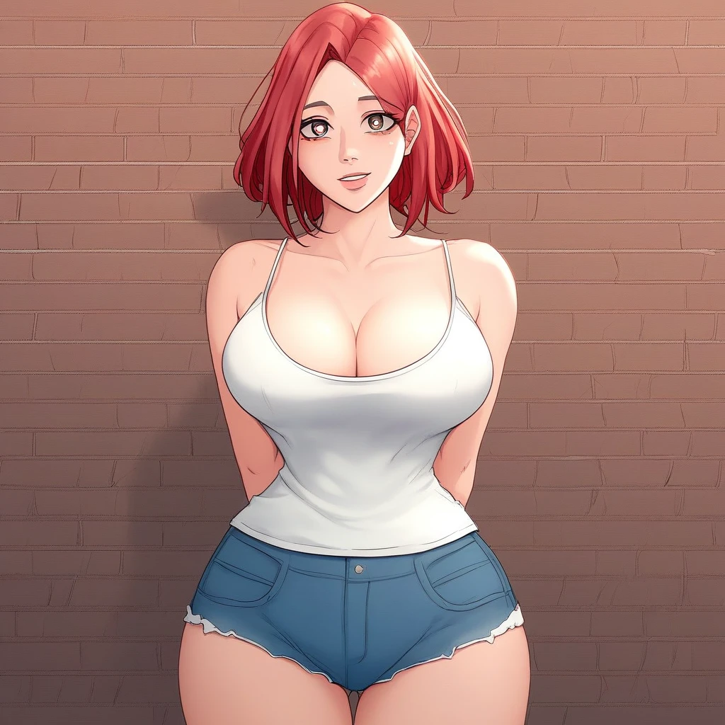 1. ((sexy sheer white camisole, no bra, obscene cleavage, huge cleavage, blue denim shorts, )) + long-sleeves beige cardigan