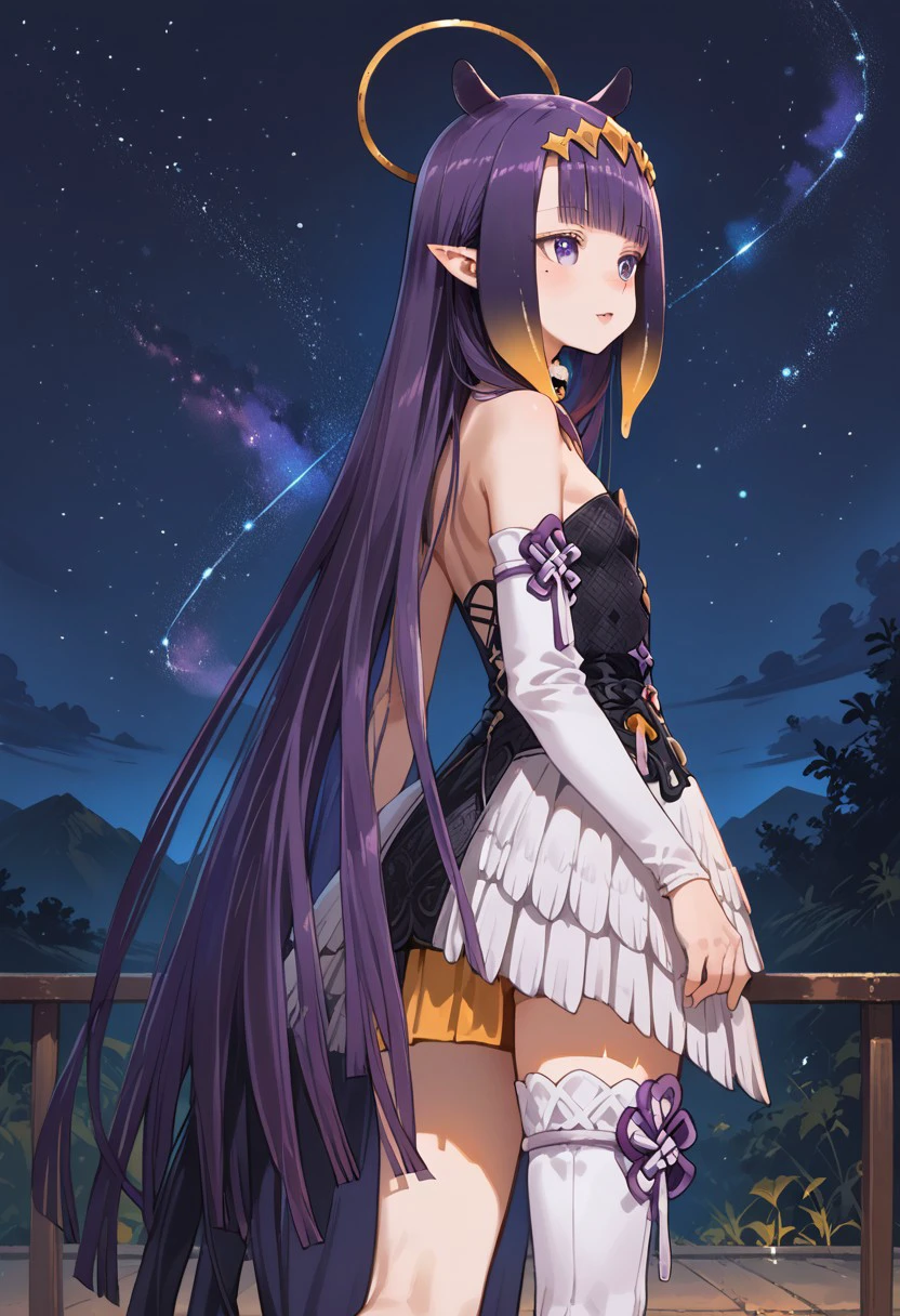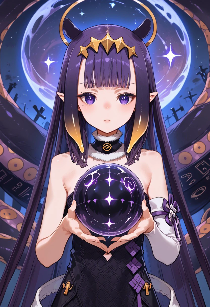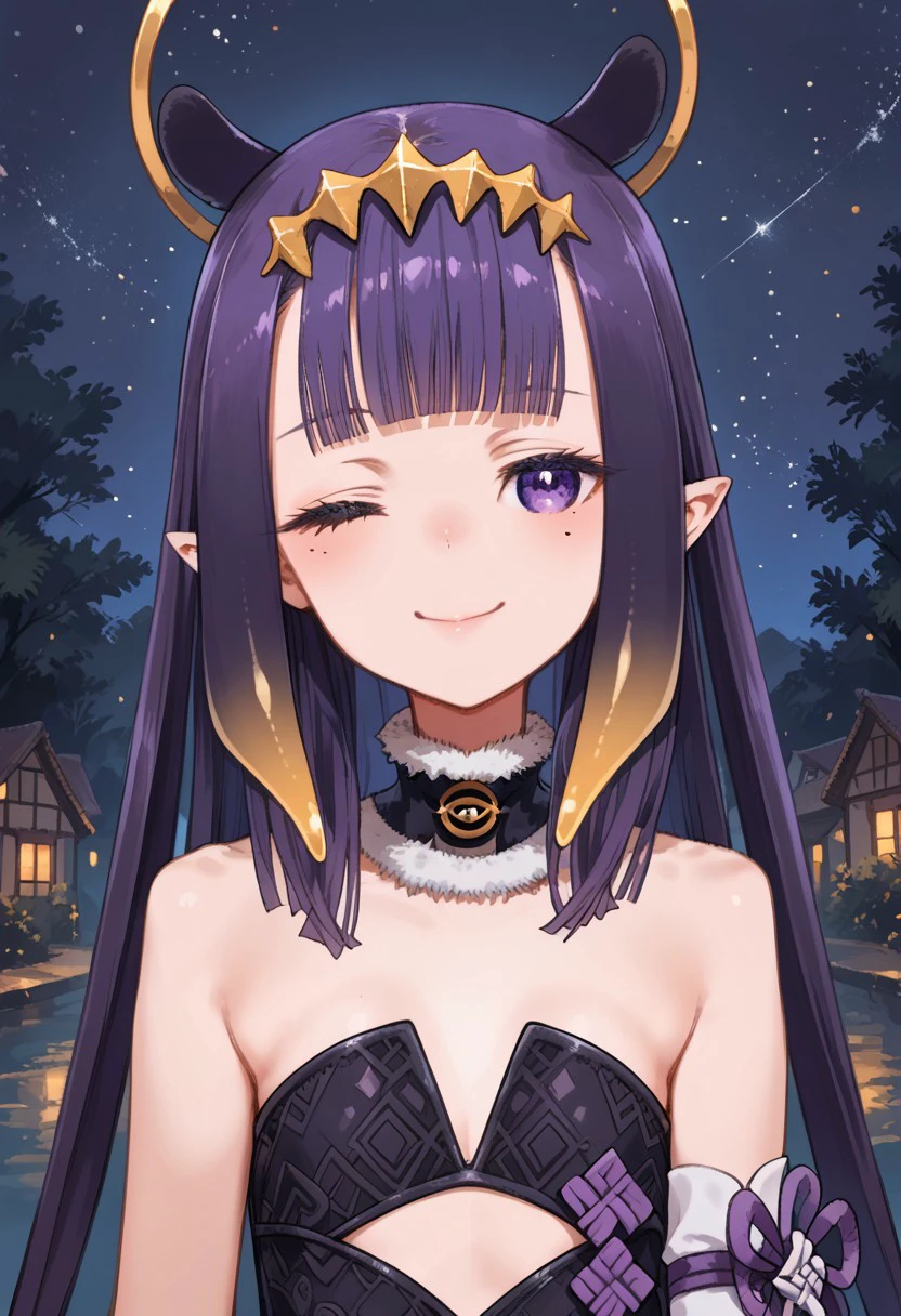 Ina_first, long hair, purple hair, side locks, yellow tips, purple eyes, head flaps, mole under eye, pointy ears, golden tiara, black and white chocker, strapless dress, single detached sleeve, purple knot, single thighhigh, black shoes,