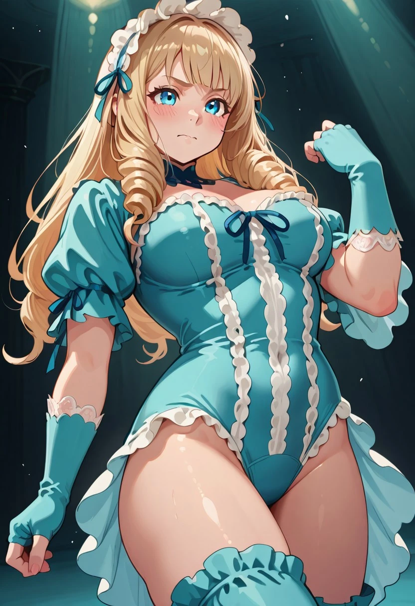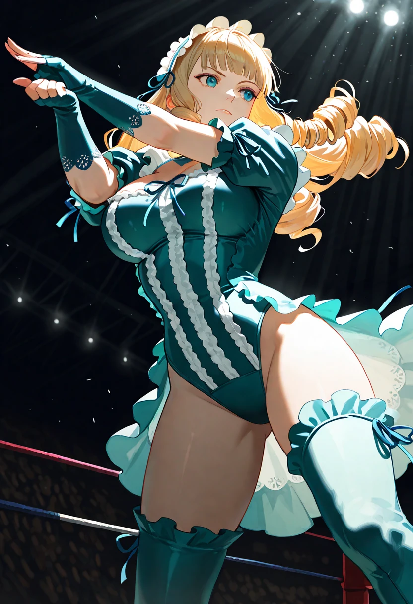 headband with white lace, teal high-leg cut bodysuit with three vertical white lace frills on the chest, puffed short sleeves, separate white lace armbands on upper arms, ornamental lace trim on forearms, continuous white lace frill trim running from upper shoulder down toward thighs,long detached sleeves with lace decoration, blue ribbon decorations with tied bows, teal thigh-high boots with blue ribbon bows, ruffled lace trim behind the thighs, teal fingerless gloves with white lace trim, hands fully visible, maid headdress with lace and blue ribbons, teal and blue outfit,