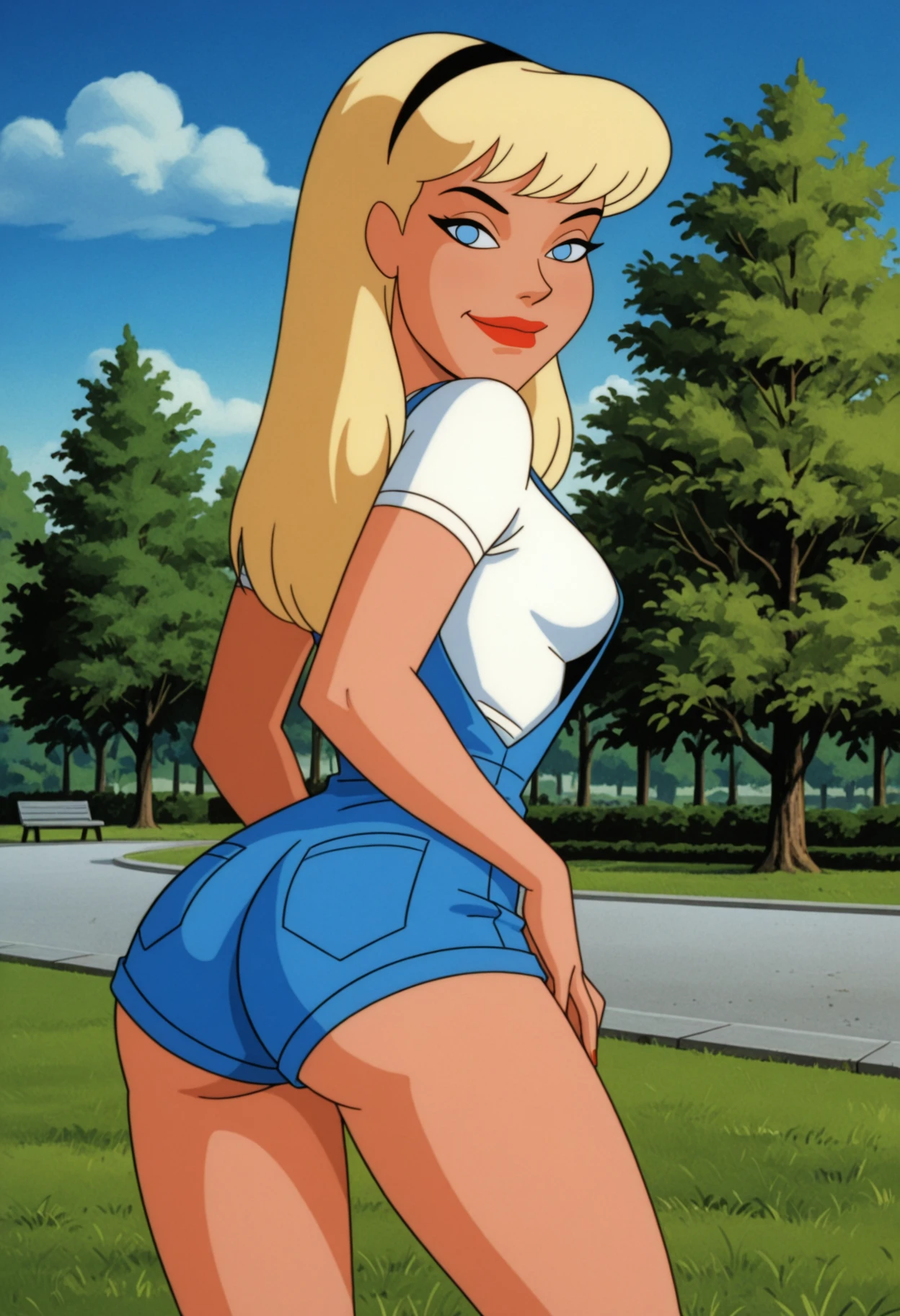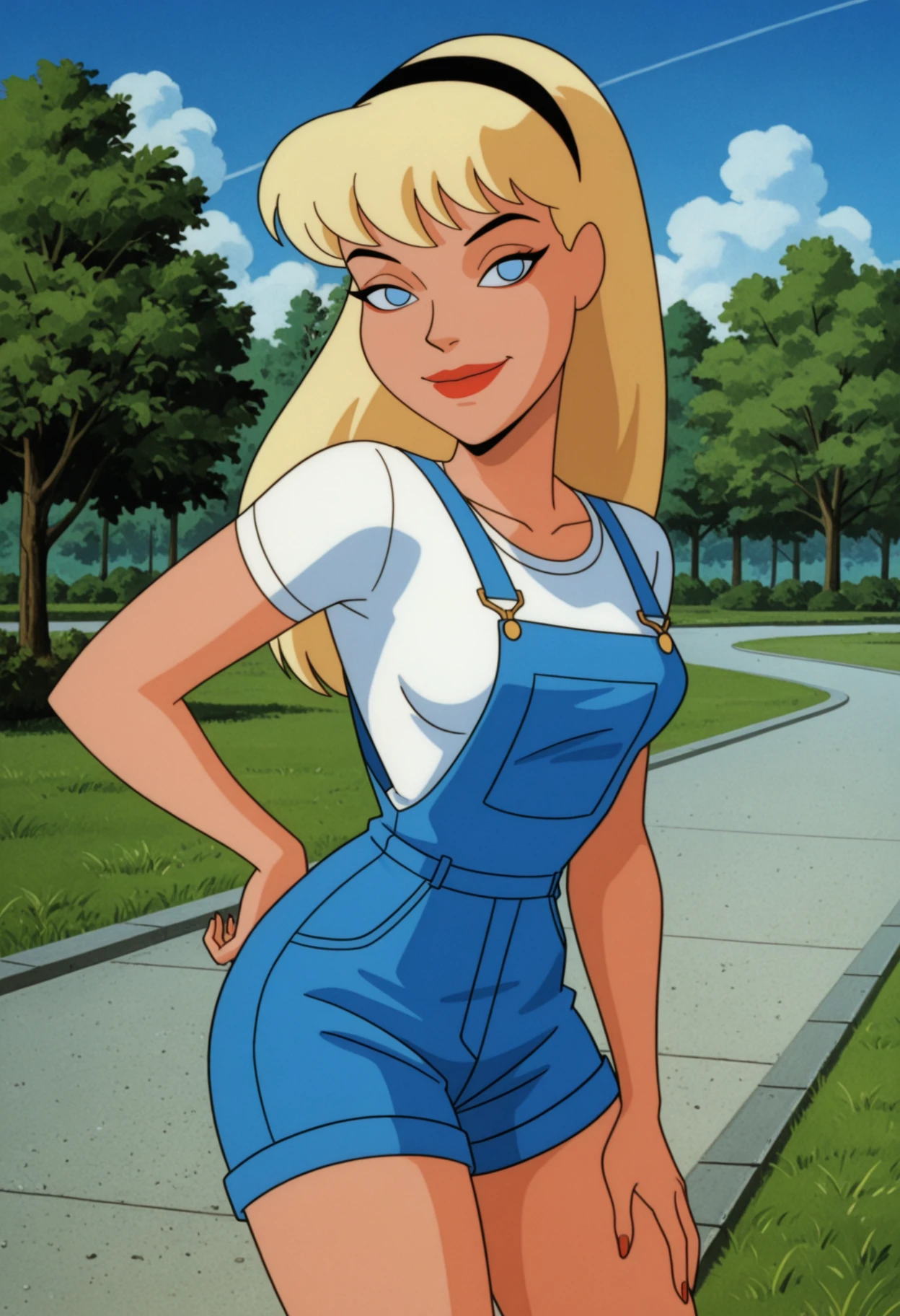 NM_TNBA_Supergirl, 1girl, solo, blue eyes, blonde hair, long hair, breasts, medium breasts, lipstick, red lips, superhero, hairband, cape, red cape, crop top, shirt, white shirt, short sleeves, cropped shirt, midriff, navel, gloves, white gloves, skirt, blue skirt, miniskirt,You can support my work by following the link: https://boosty.to/nmackelie