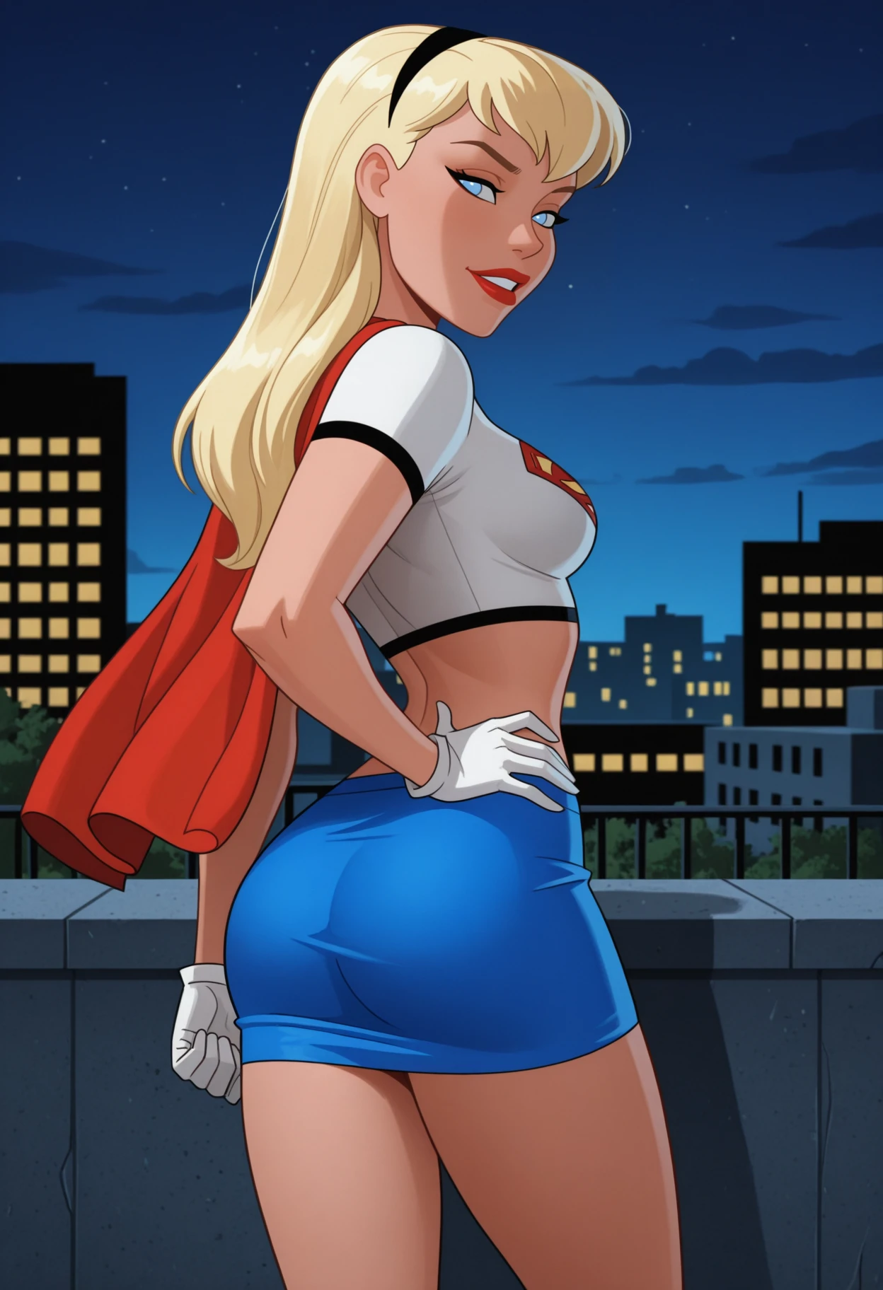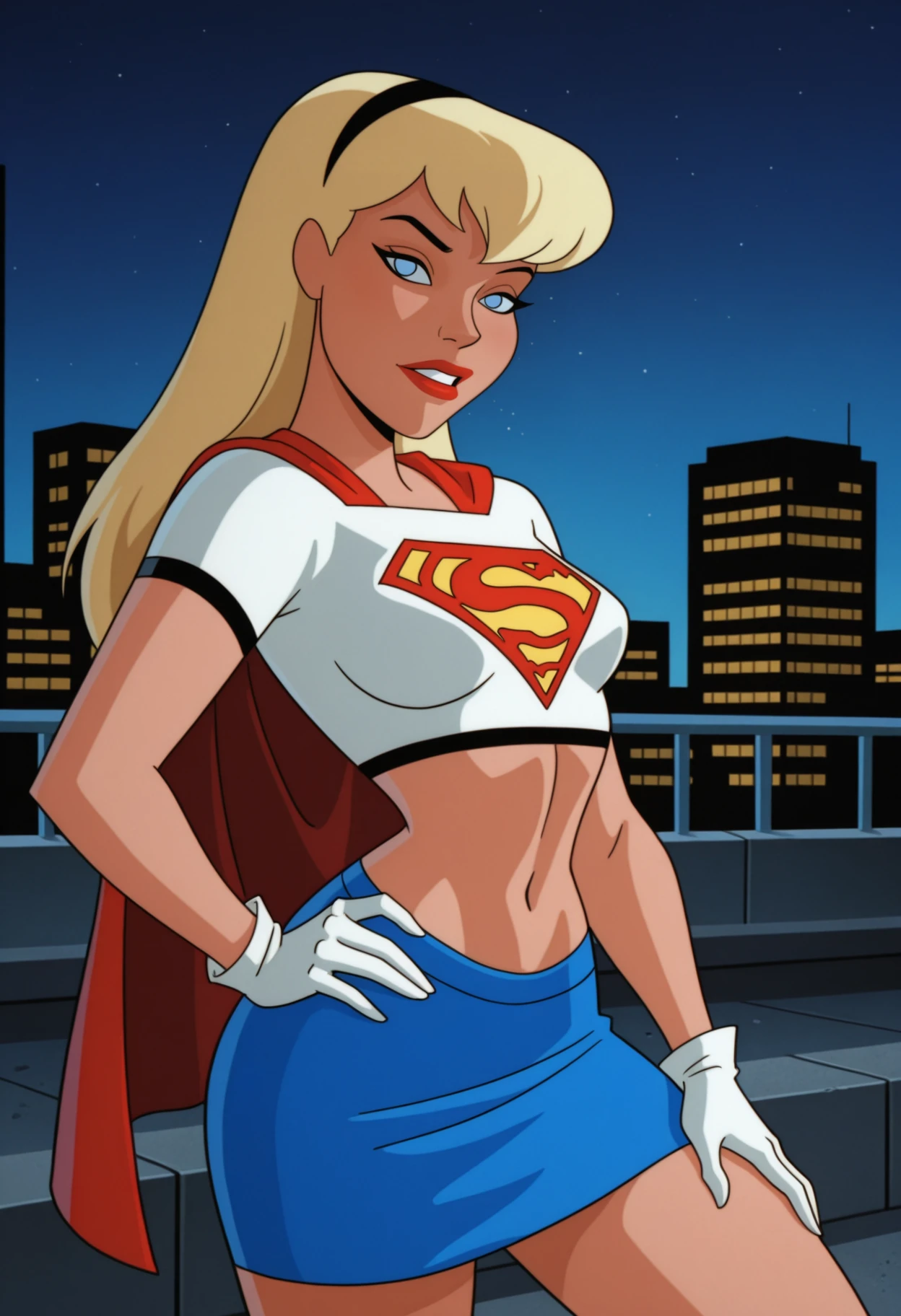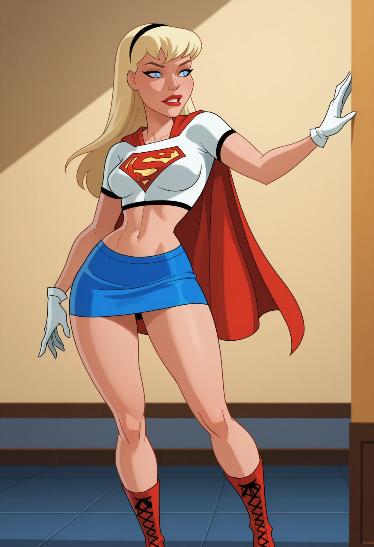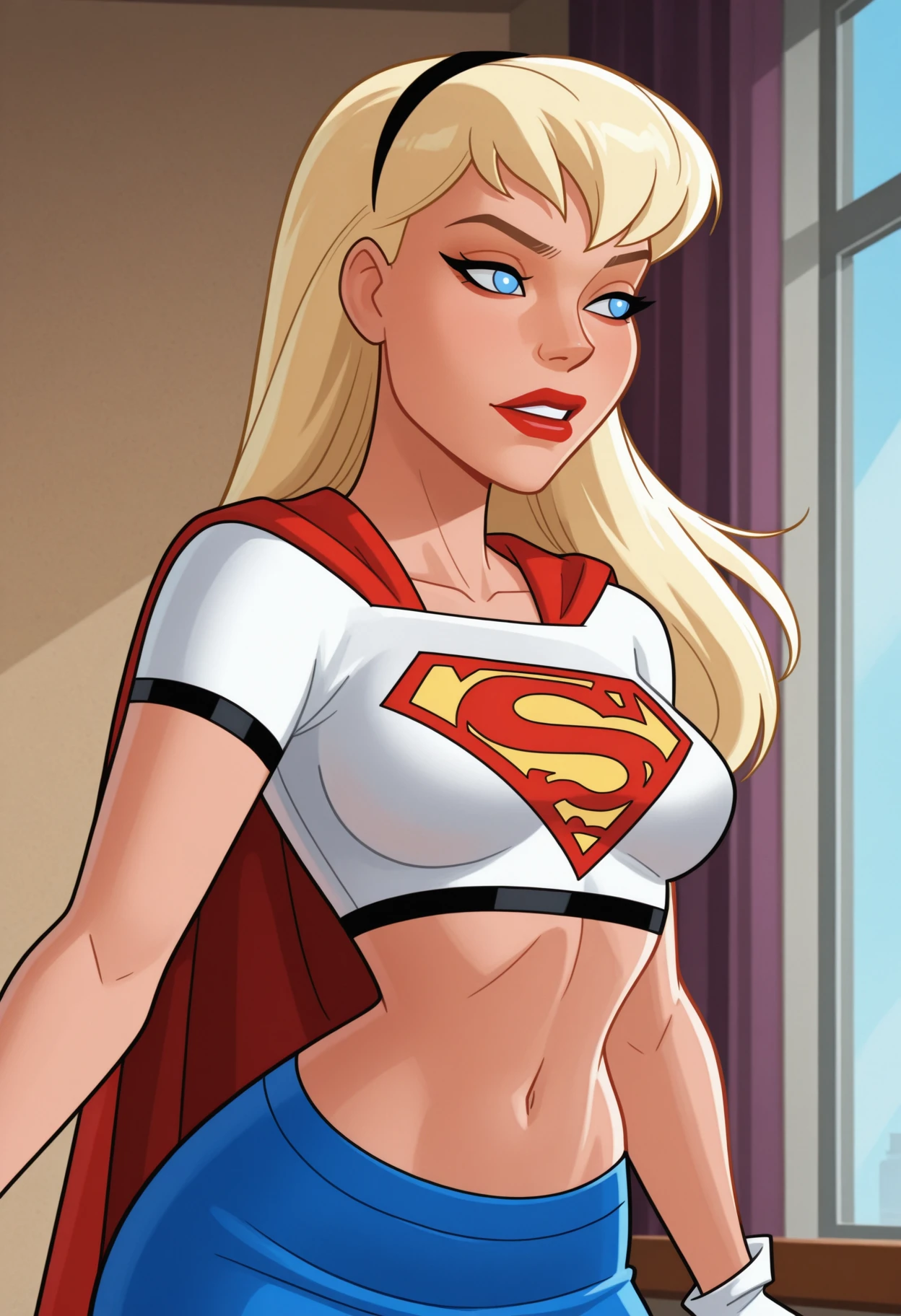 NM_TNBA_Supergirl, 1girl, solo, blue eyes, blonde hair, long hair, breasts, medium breasts, lipstick, red lips, superhero, hairband, cape, red cape, crop top, shirt, white shirt, short sleeves, cropped shirt, midriff, navel, gloves, white gloves, skirt, blue skirt, miniskirt,