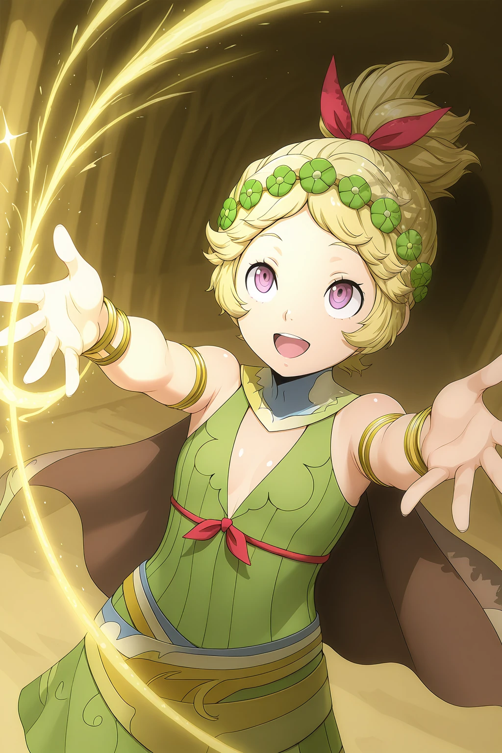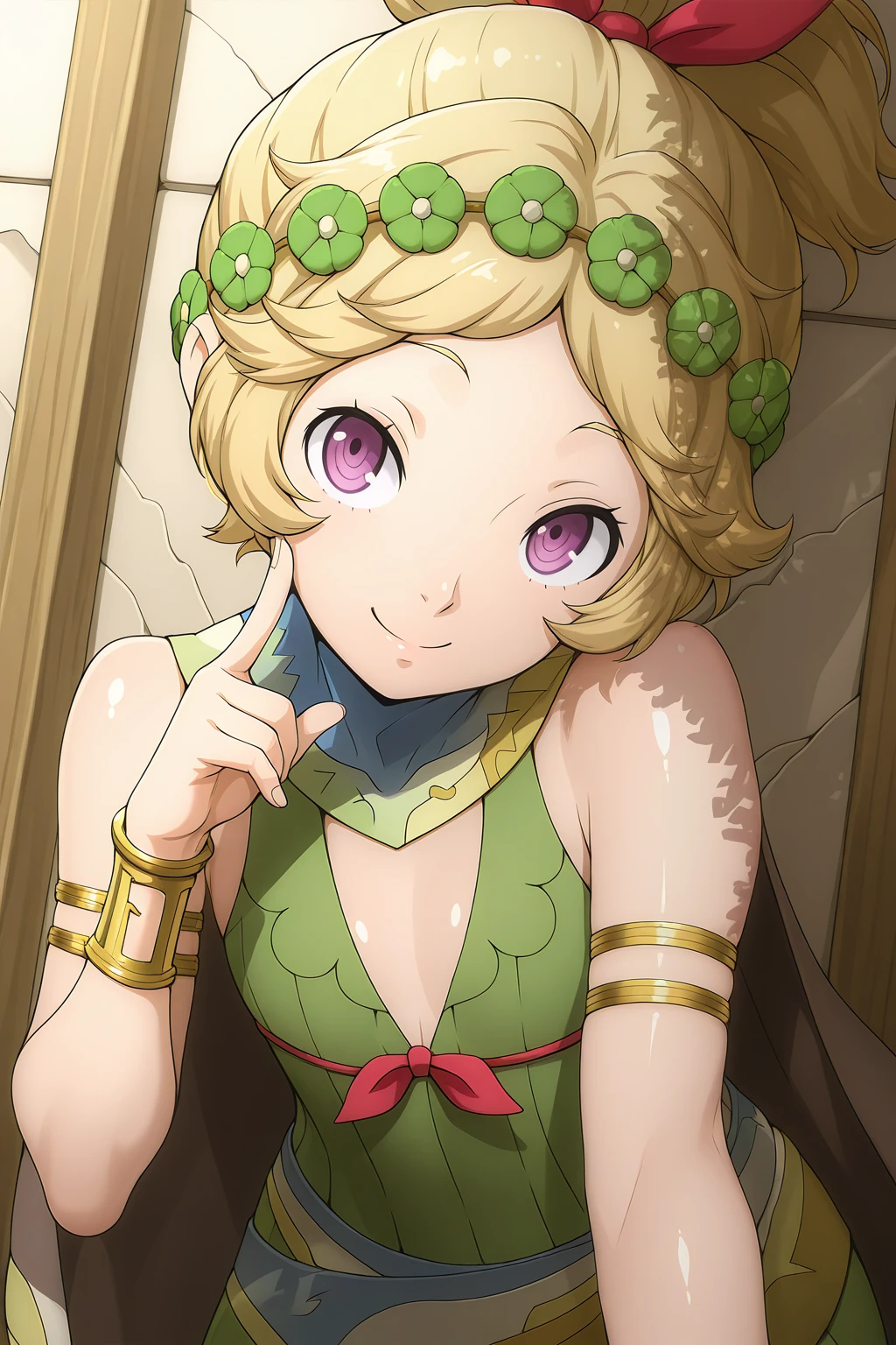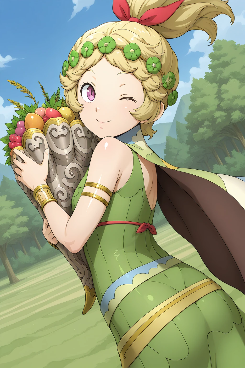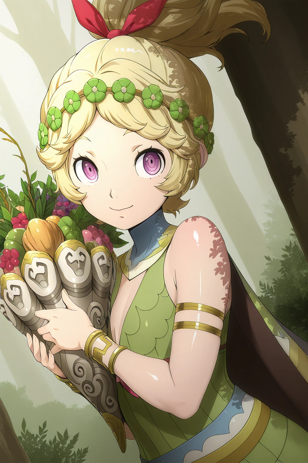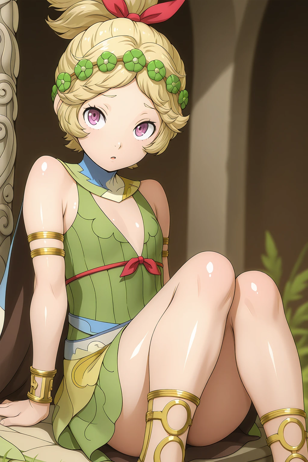 DMShinMegamiTensei, DMCostume, blonde hair, high ponytail, purple eyes, eyelashes, head wreath, hair ribbon, cape, green dress, sleeveless, armlet, bracelet, sandals
