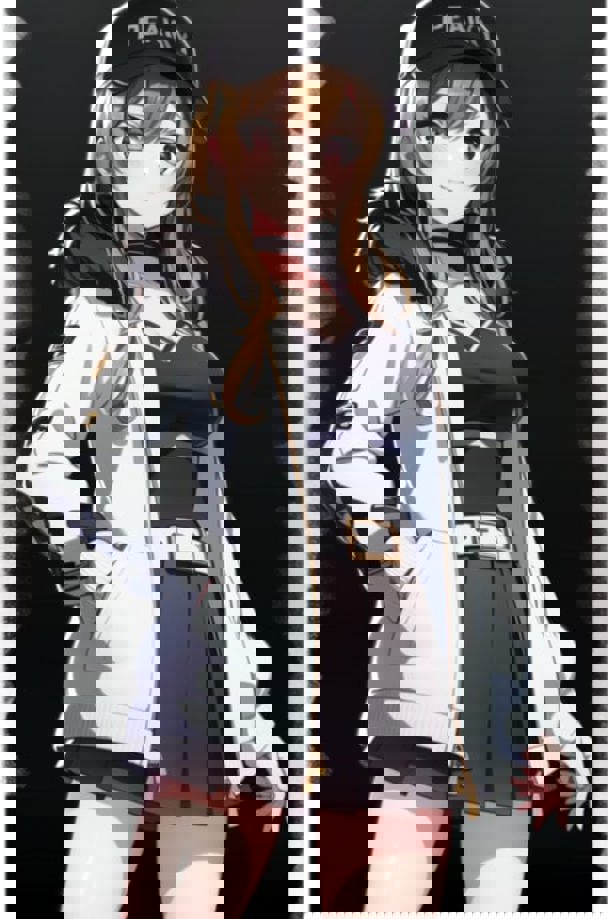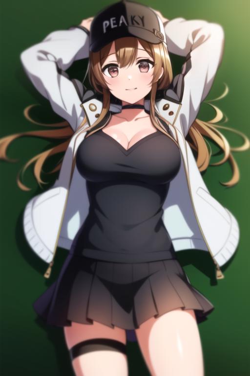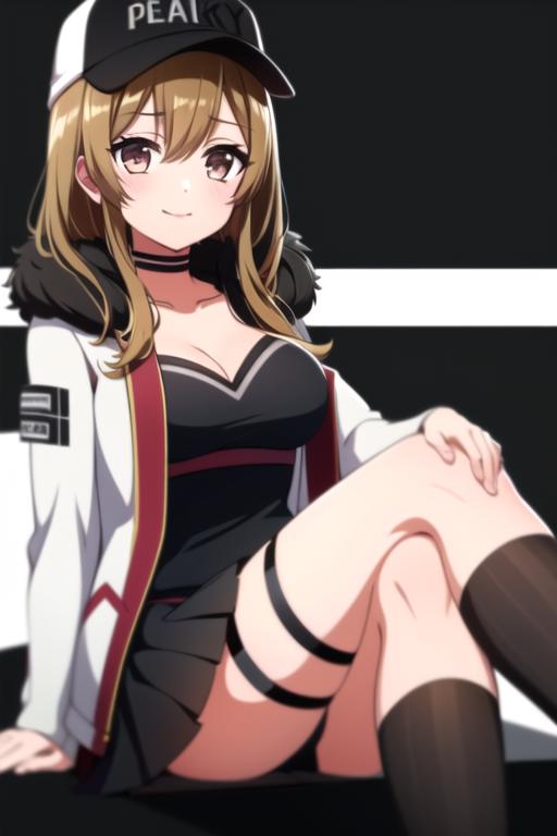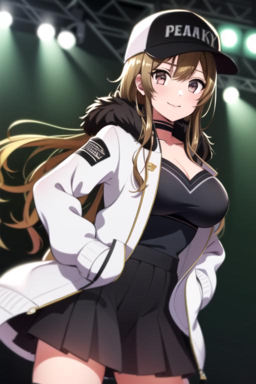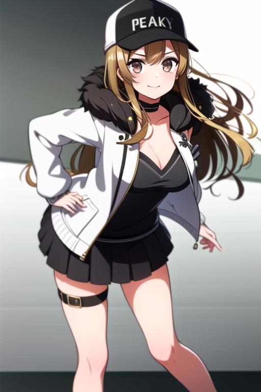 peaky p-key,bangs,belt, black clothes,baseball_cap, black_choker, black_skirt,choker, cleavage, collarbone, fur-trimmed_coat, fur-trimmed_jacket, fur_trim, light brown hair, hat, white jacket, long_sleeves,open_clothes, pleated_skirt, black skirt, smile,thigh_strap