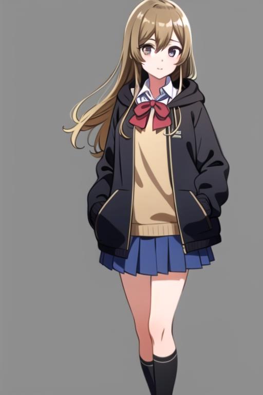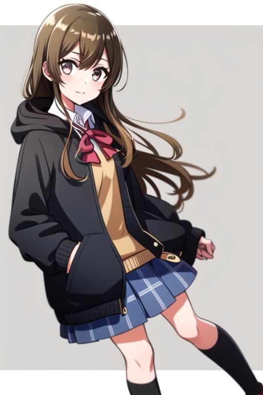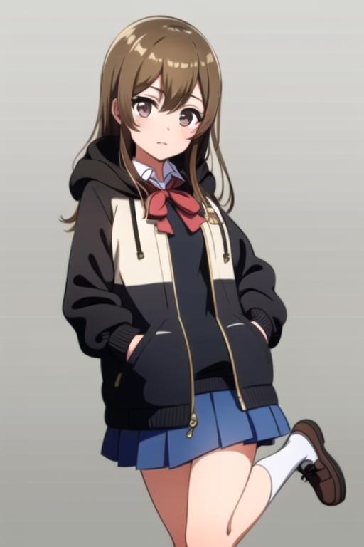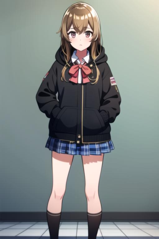 black_jacket, blue_skirt, plaid skirt,school uniform, brick_floor, brown_eyes, brown_hair, hood, hoodie, light brown hair, jacket, long_hair, open_clothes, open_jacket, pleated_skirt, red_bow, school_uniform, shirt, shoes