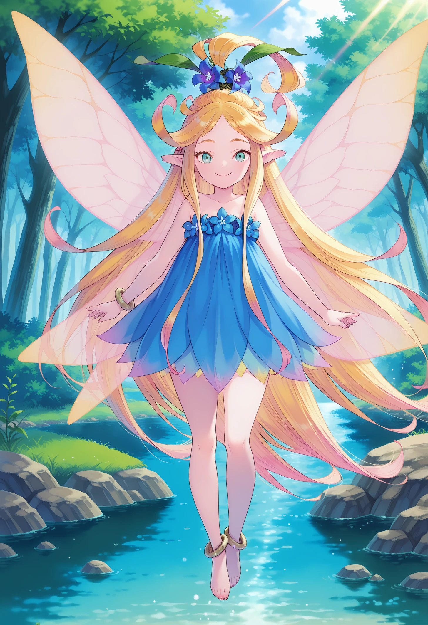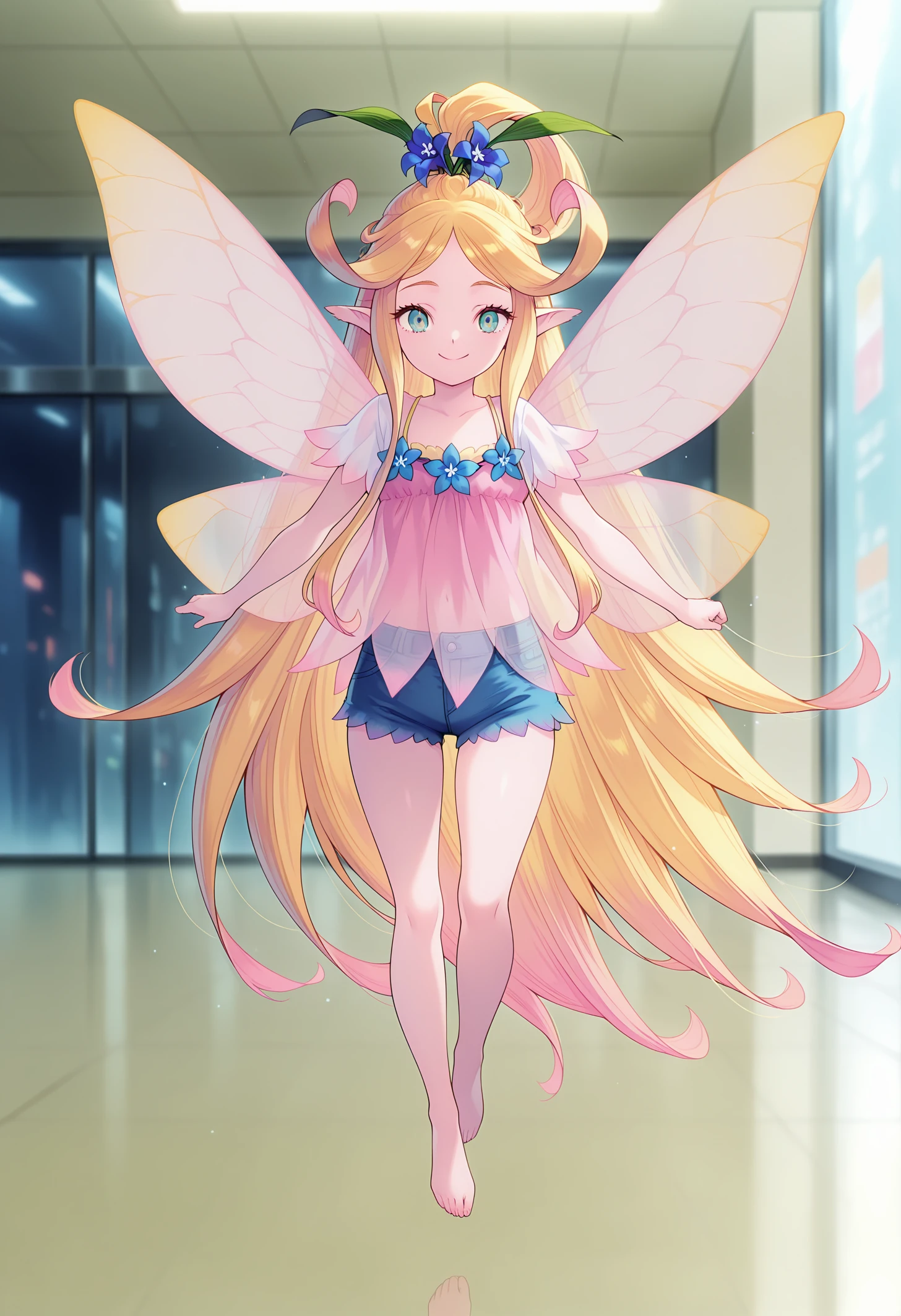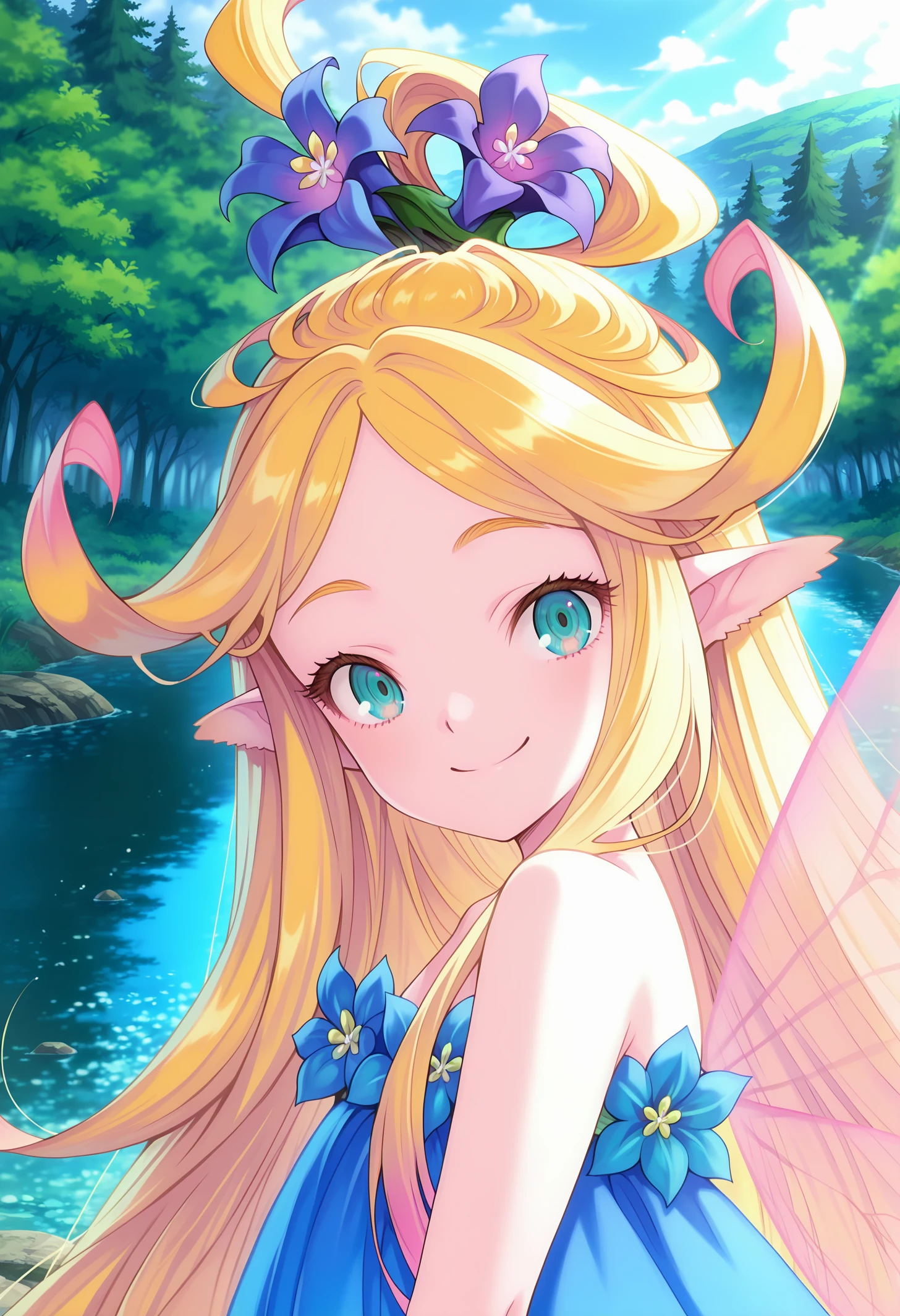 1girl, solo, long hair, aqua eyes, blonde hair, multicolored hair, pointy ears, fairy wings, fairy, hair flower, <lora:IllustriousXL ToM Fairy V1:1>