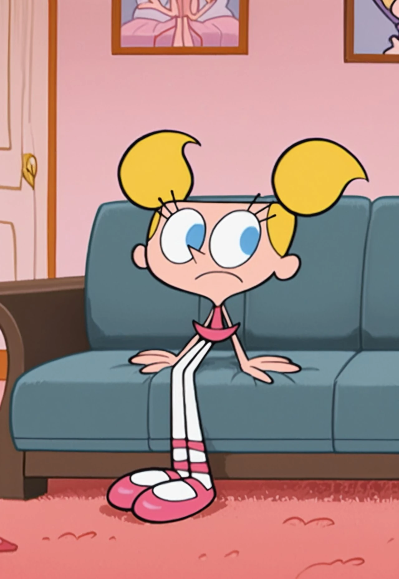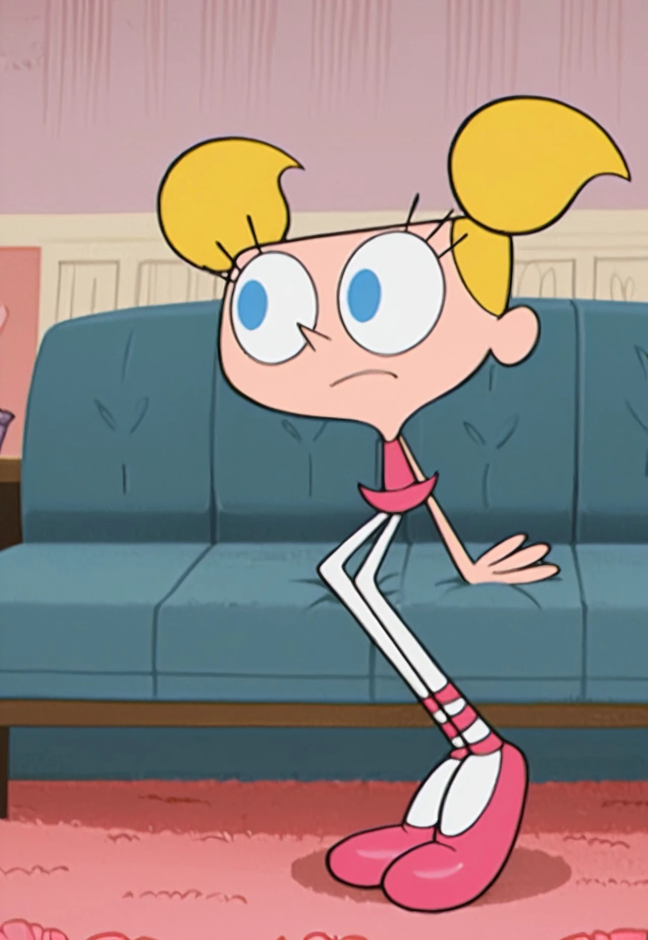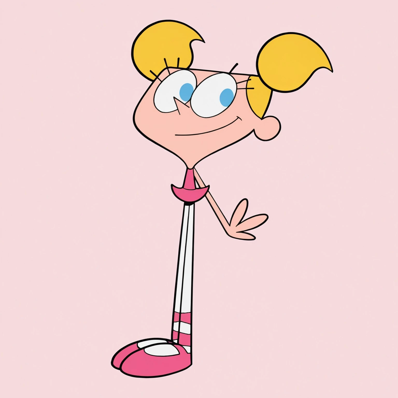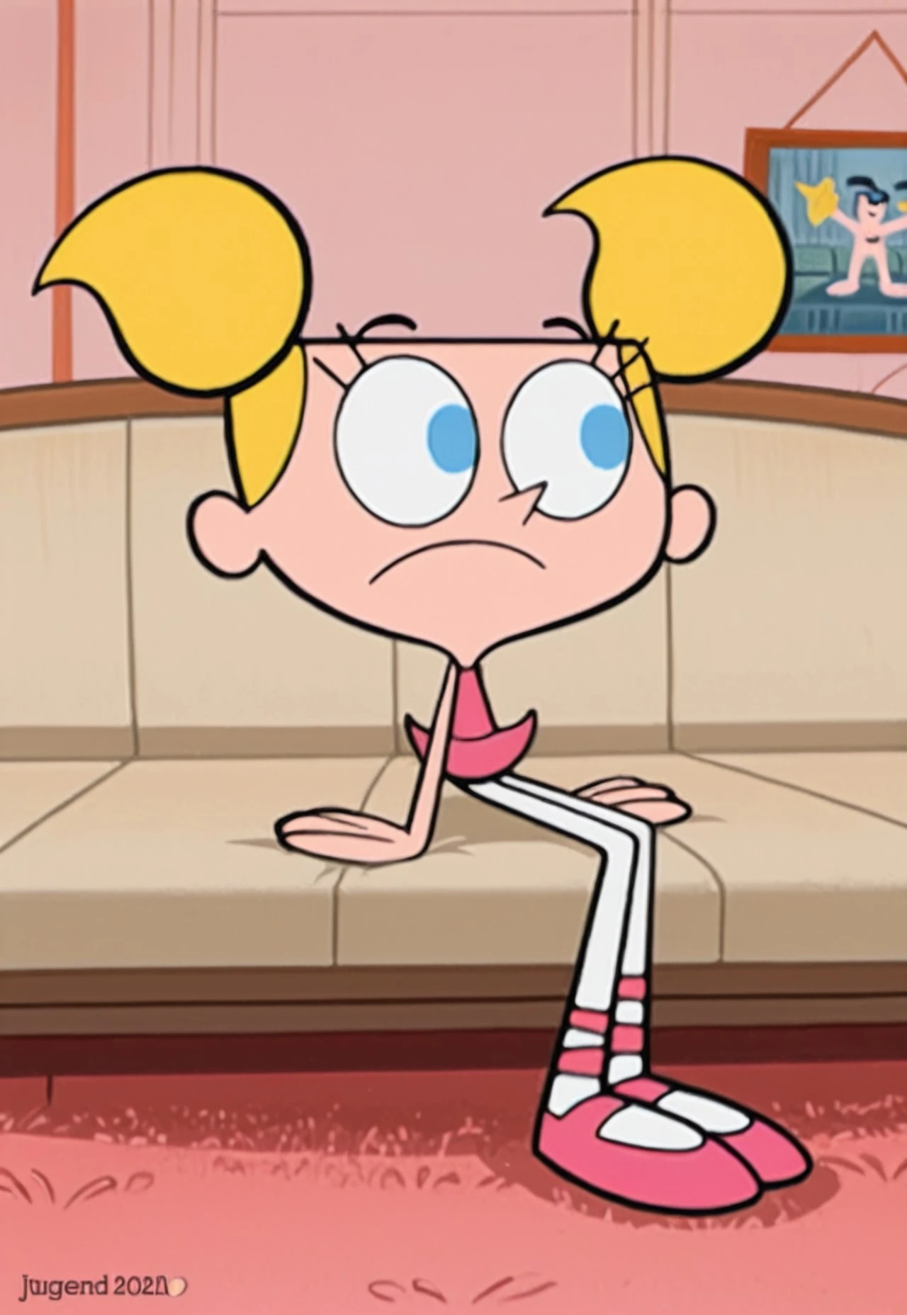 1girl, solo, dee dee from Dexter's Laboratory, blue eyes, blonde hair, long hair, blonde hair in pigtails,