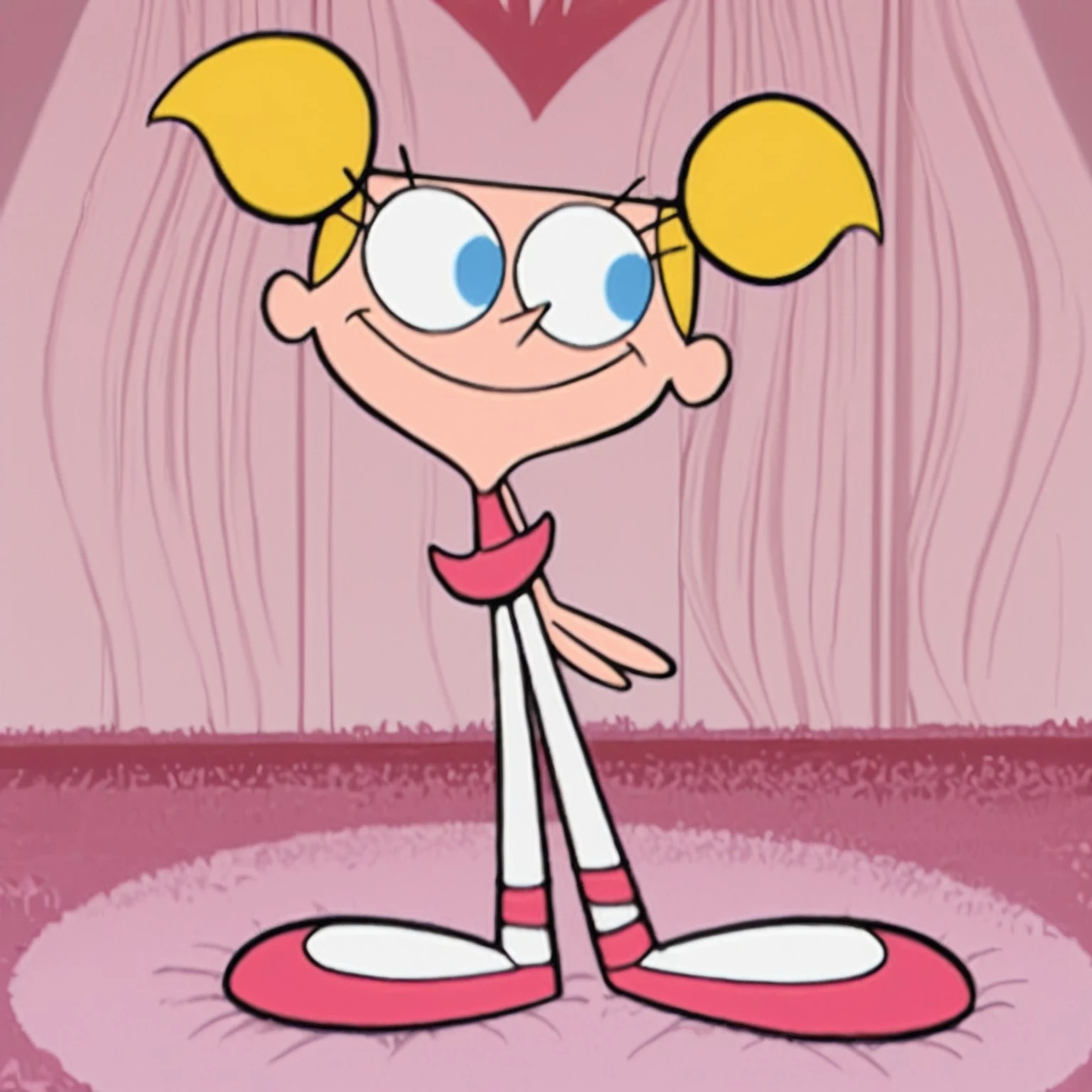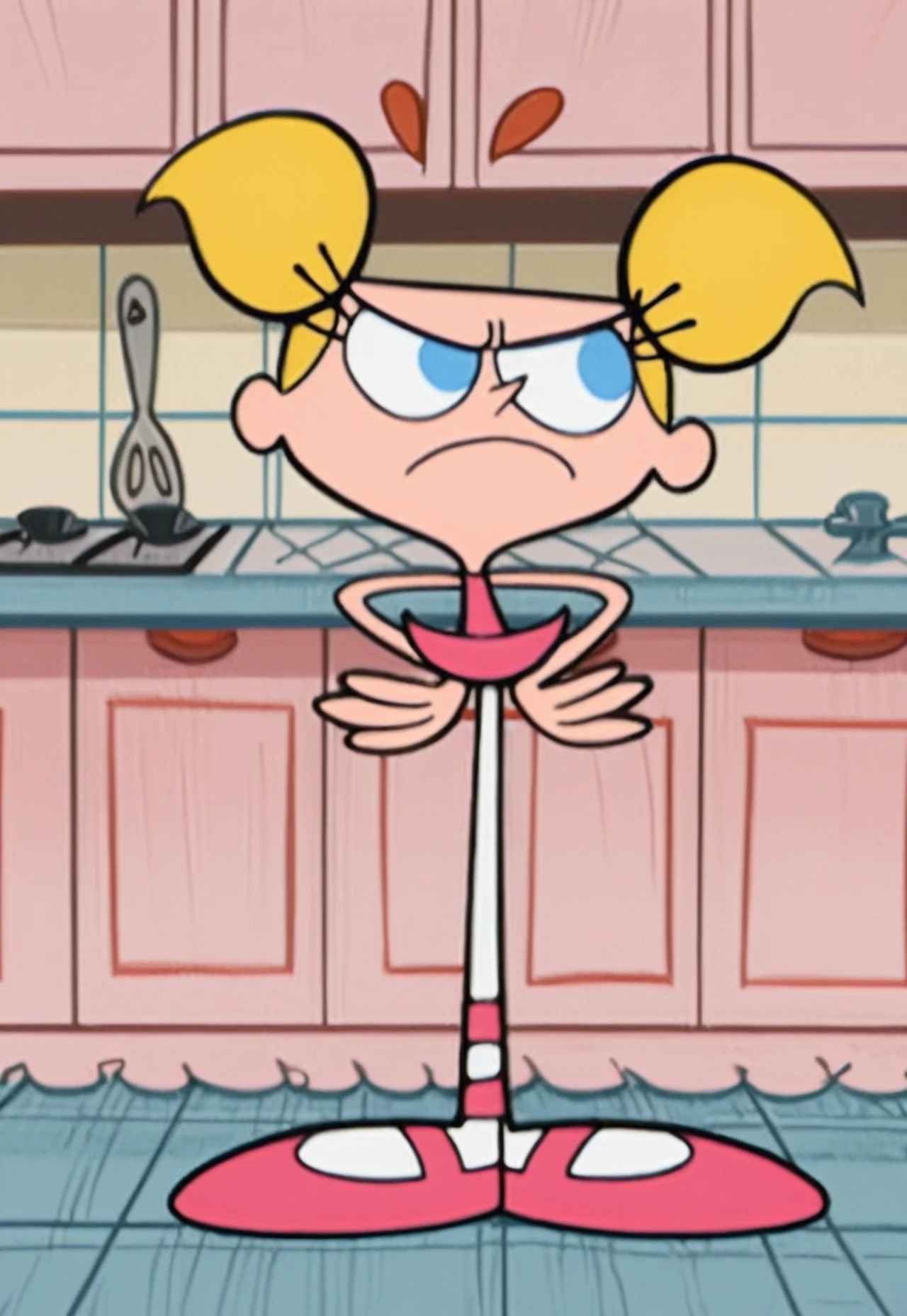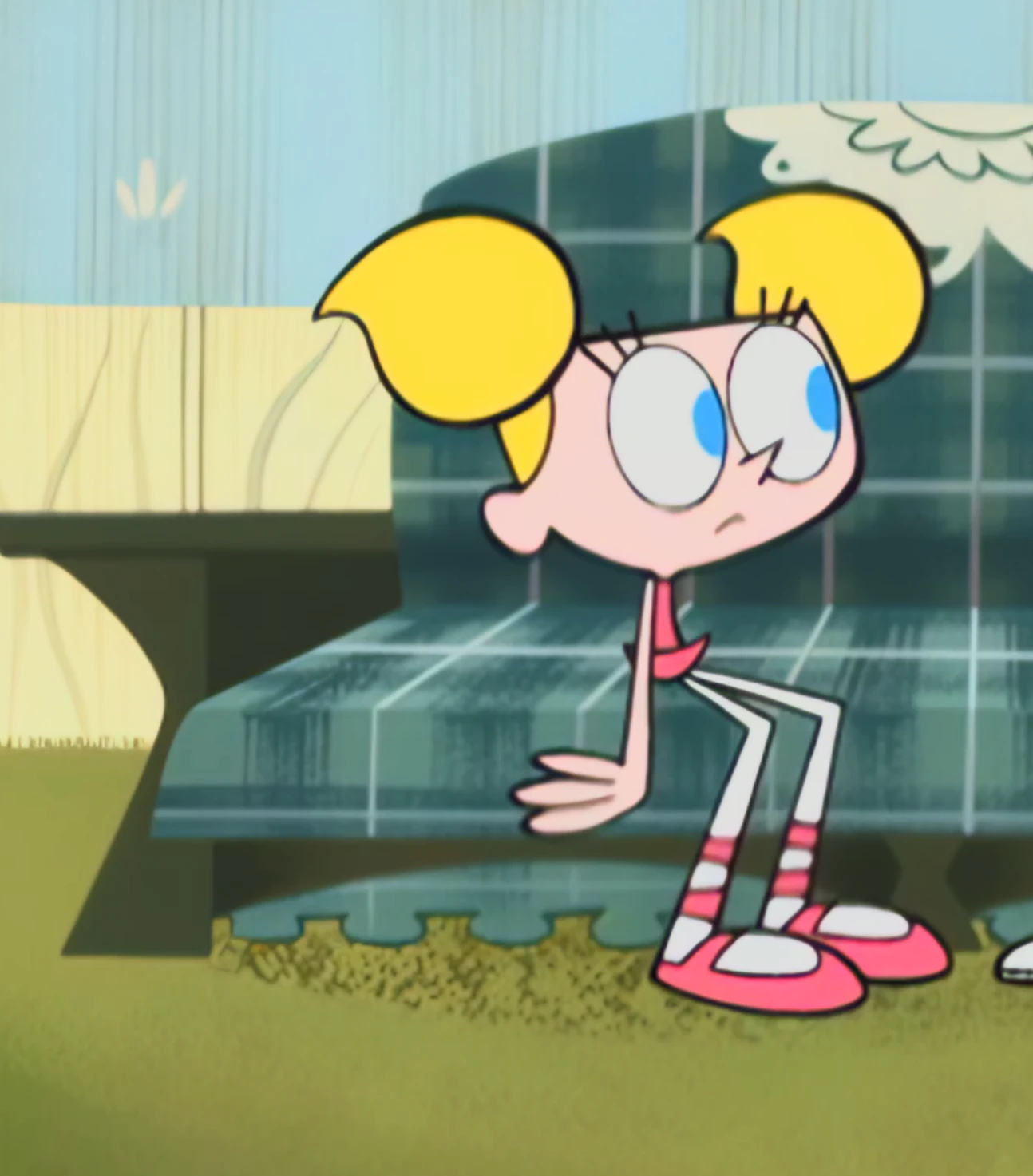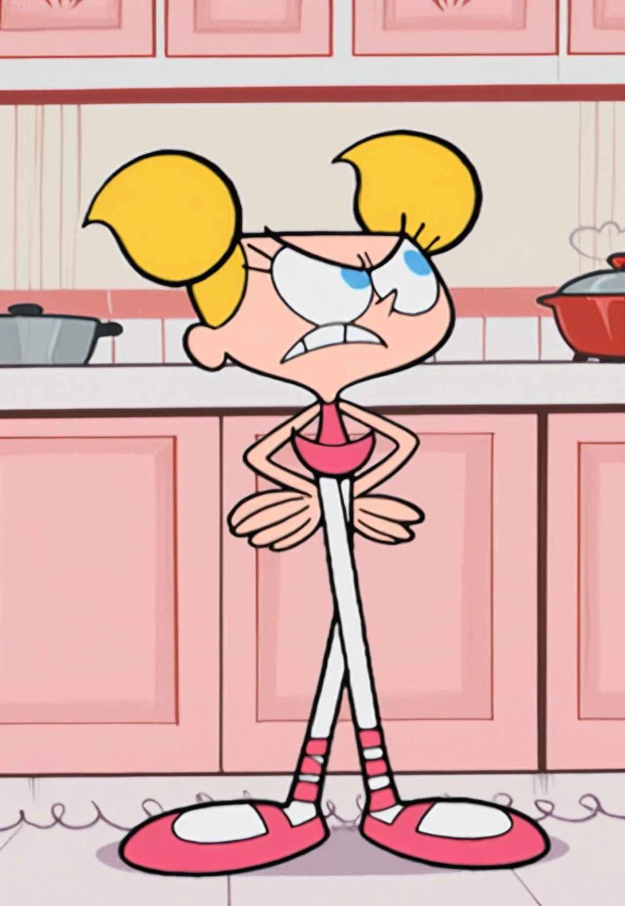 1girl, solo, dee dee from Dexter's Laboratory, blue eyes, blonde hair, long hair, blonde hair in pigtails,