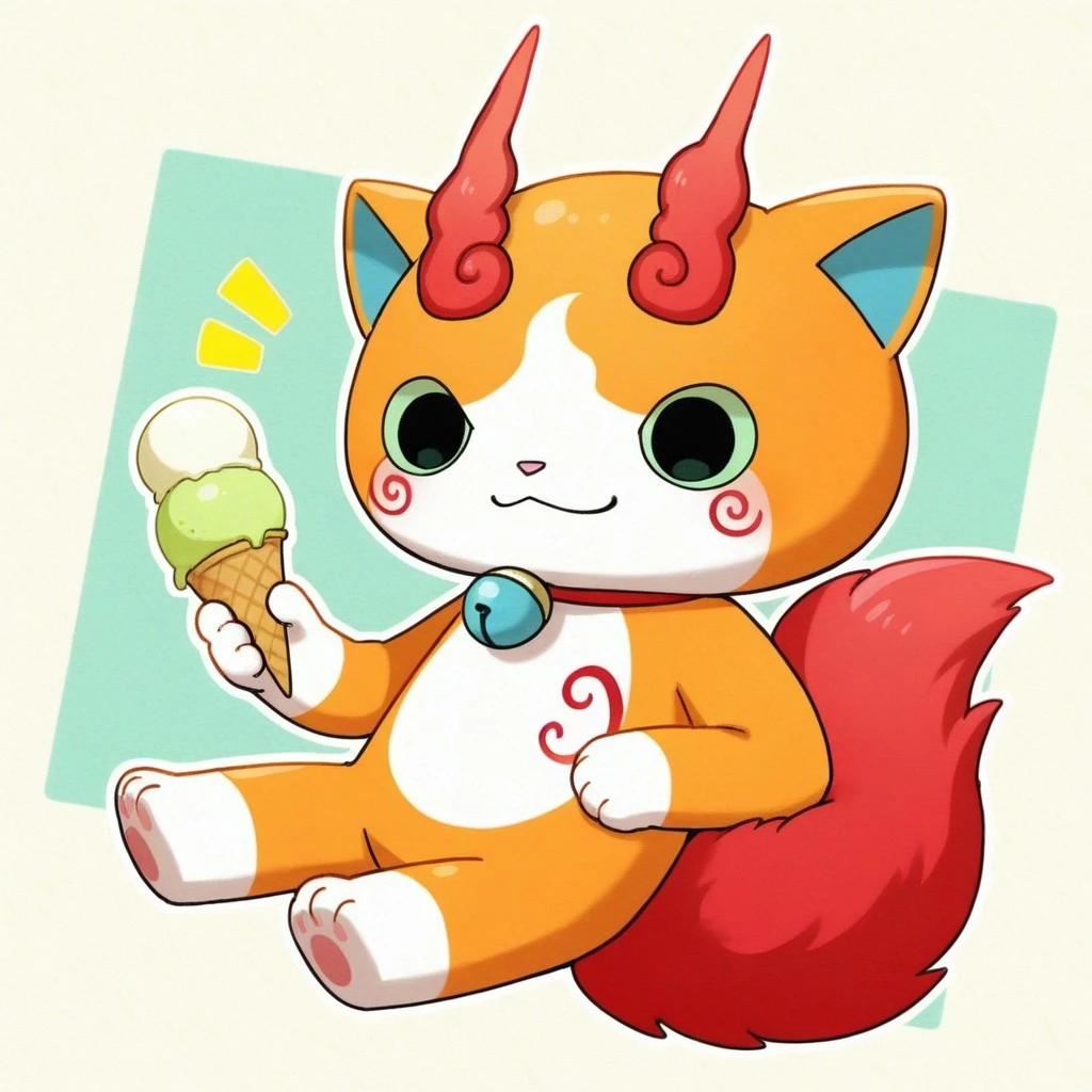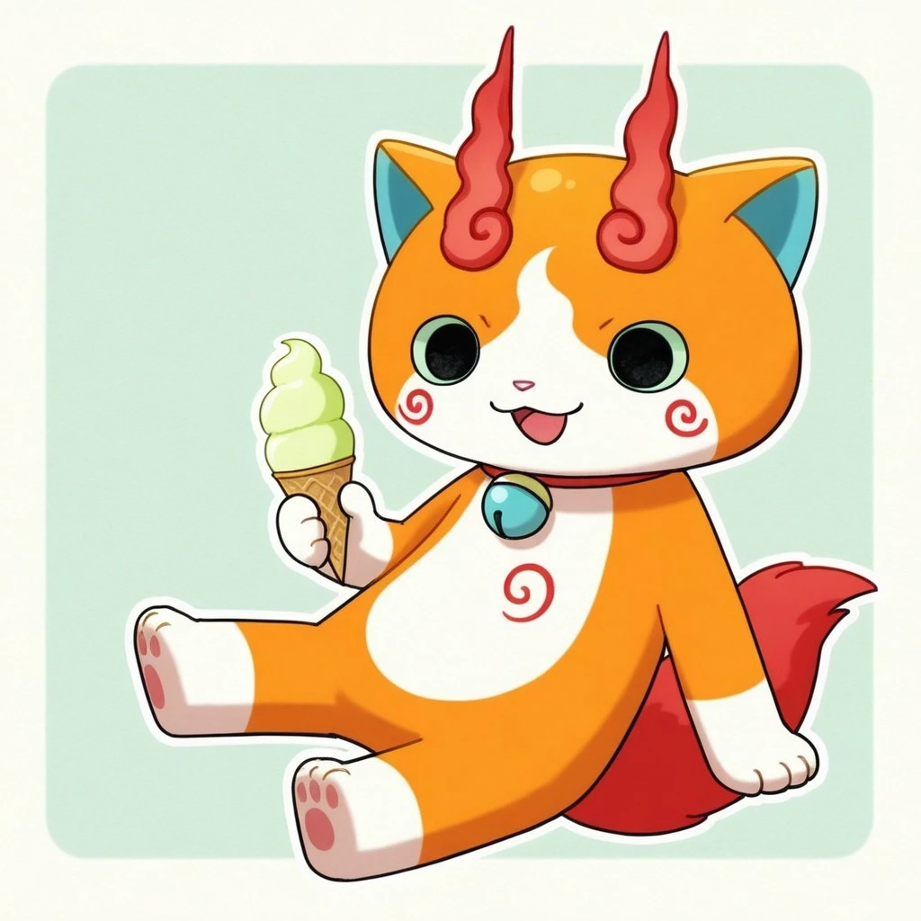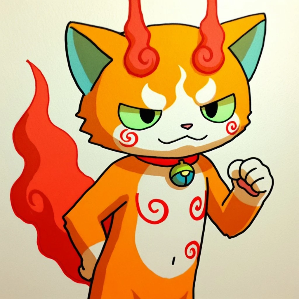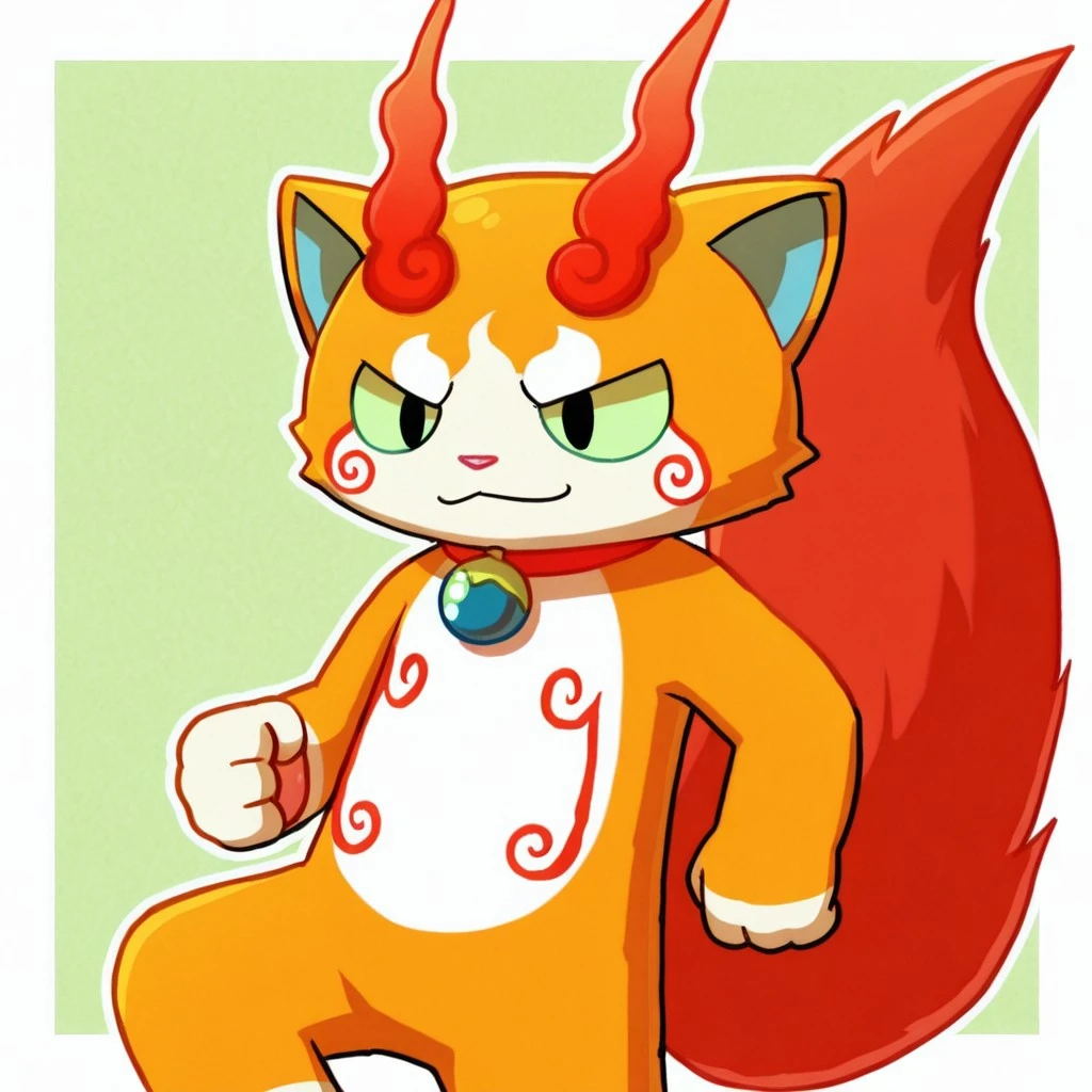 solo,male,feline,traditional yokai,lime green sclera,black eyes,orange body,orange fur,pink nose,red swirls on body,animal ears,blue inner-ears,collar with blue bell,blue countershade torso,red fluffy tail,