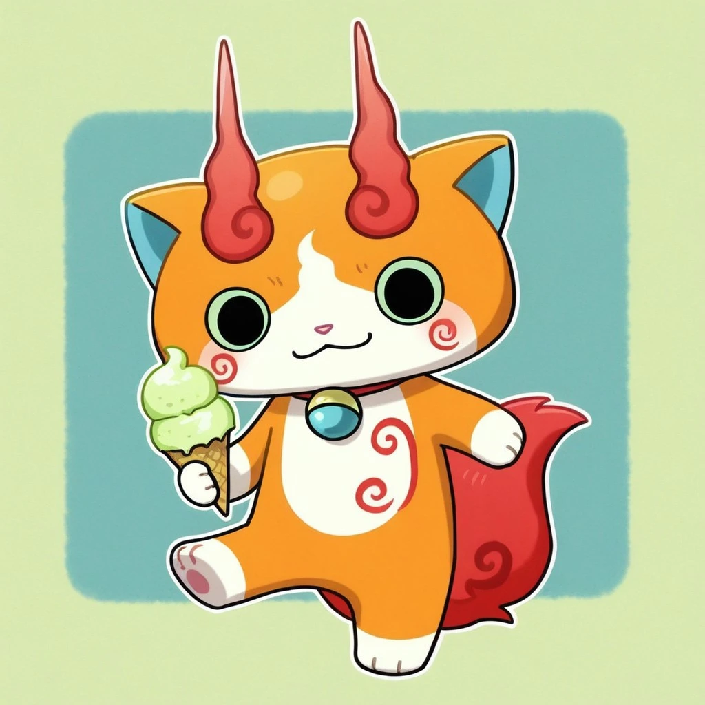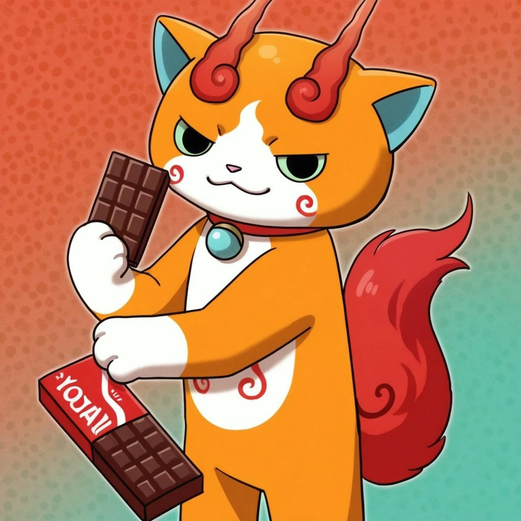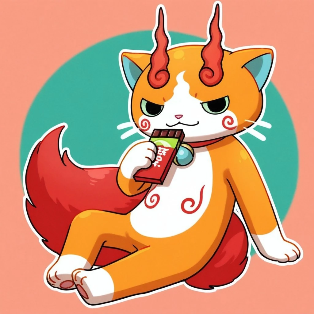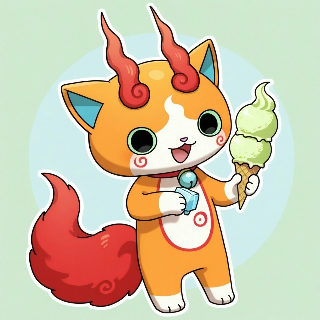 solo,male,feline,traditional yokai,lime green sclera,black eyes,orange body,orange fur,pink nose,red swirls on body,animal ears,blue inner-ears,collar with blue bell,blue countershade torso,red fluffy tail,