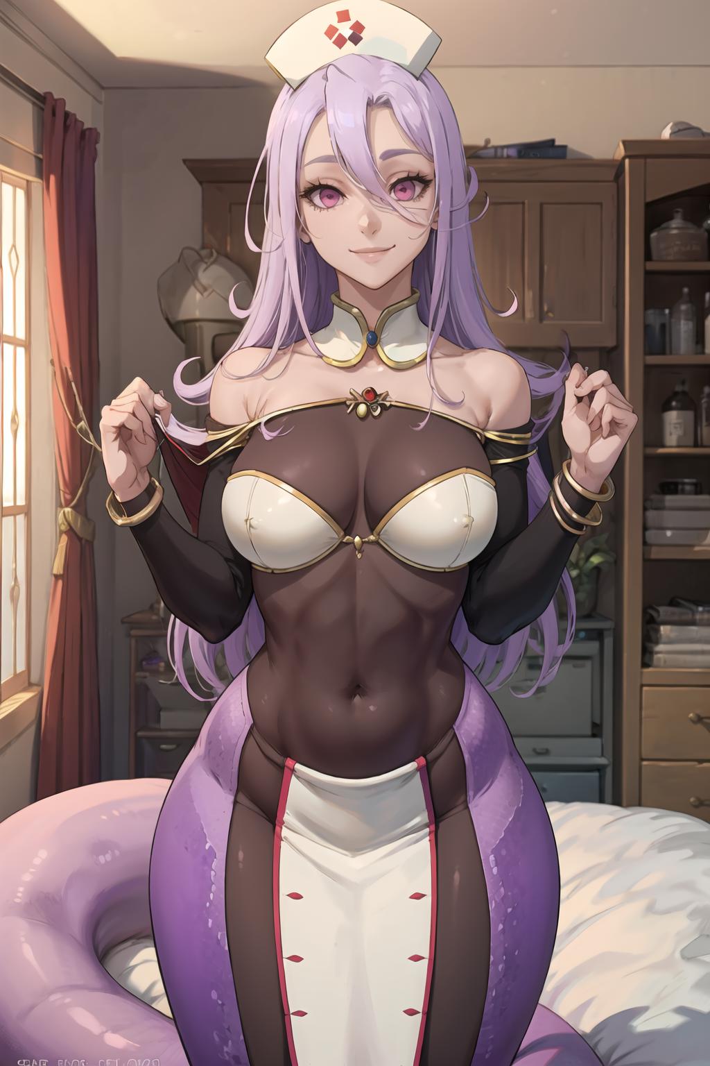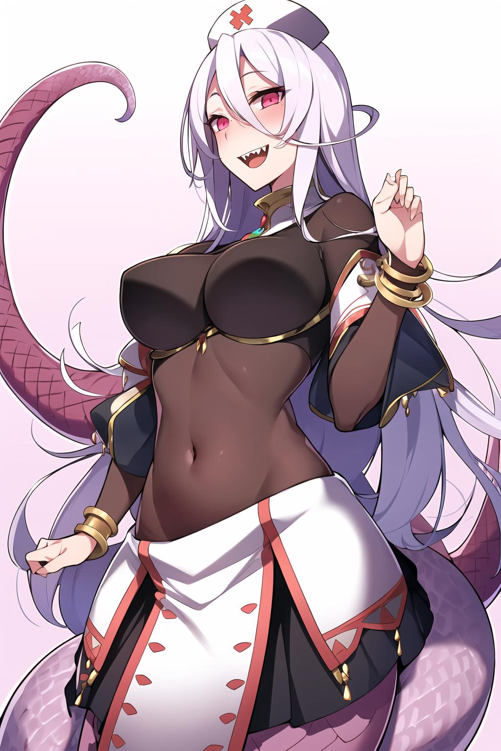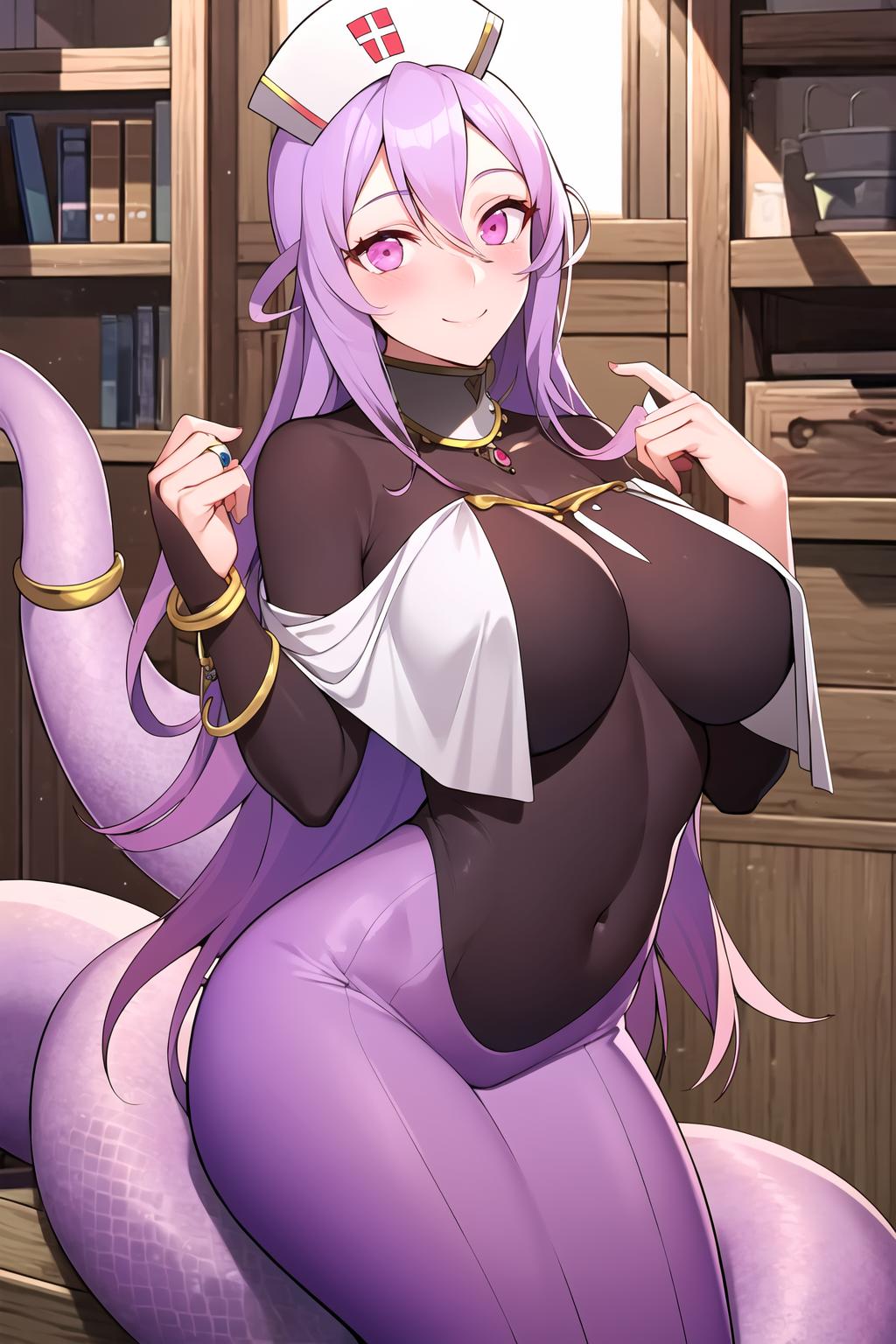 very light purple hair, pink eyes, snake girl, serpent girl, scalie, lamia, monster girl, long hair, hair between eyes, scales, hat, pointy ears, nurse cap, jewelry, blush, pink eyes, tail ornament, see-through, bodystocking, bodysuit