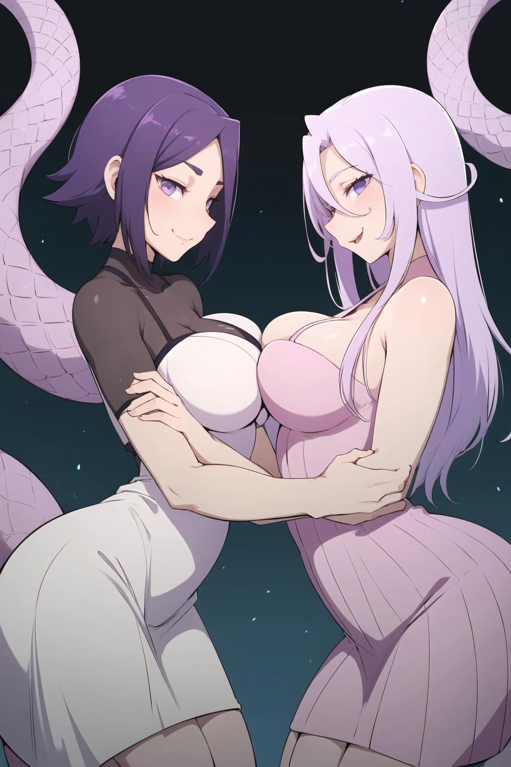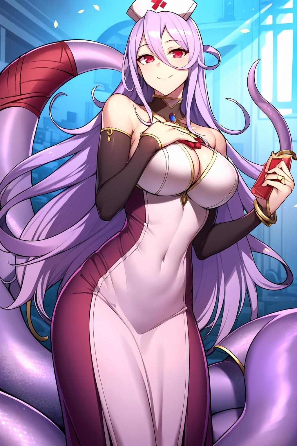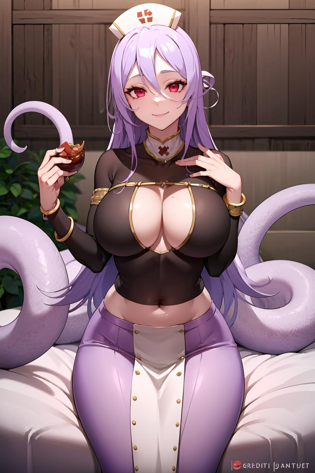 very light purple hair, pink eyes, snake girl, serpent girl, scalie, lamia, monster girl, long hair, hair between eyes, scales, hat, pointy ears, nurse cap, jewelry, blush, pink eyes, tail ornament, see-through, bodystocking, bodysuit
