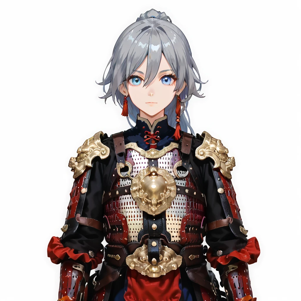 fu hua,armor,blue eyes,hair between eyes,boots,grey hair,shoulder armor,gauntlets,breastplate,ponytail,in the face,tassel,sheath,sheathed,, earrings, jewelry