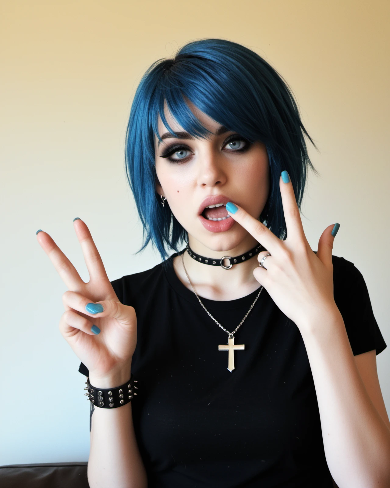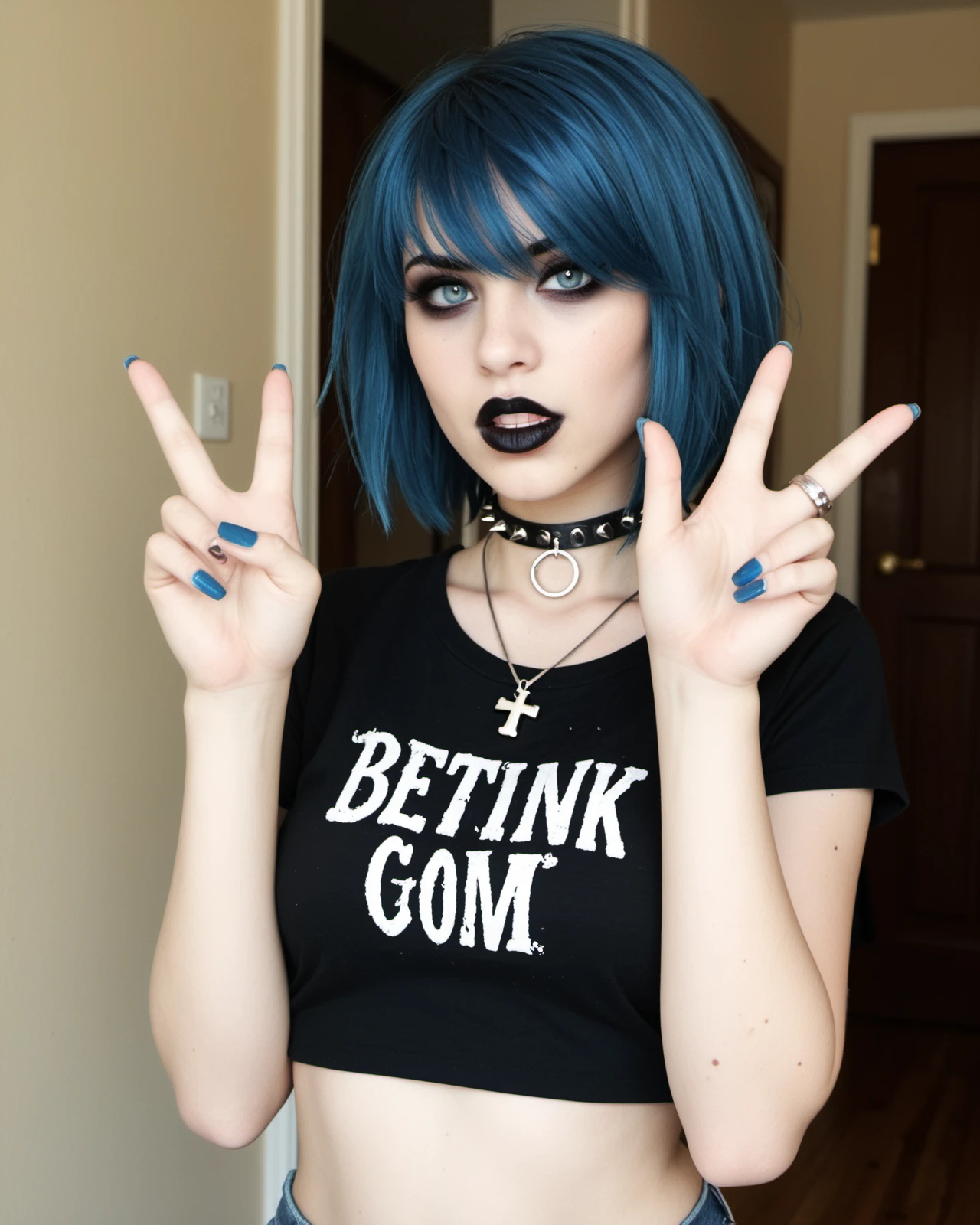 short hair, hair over one eye, blue hair, shiny blue eyes, tall female, skinny, narrow waist, medium breasts, pale skin, black eyeshadows, black eyeliner, makeup,
