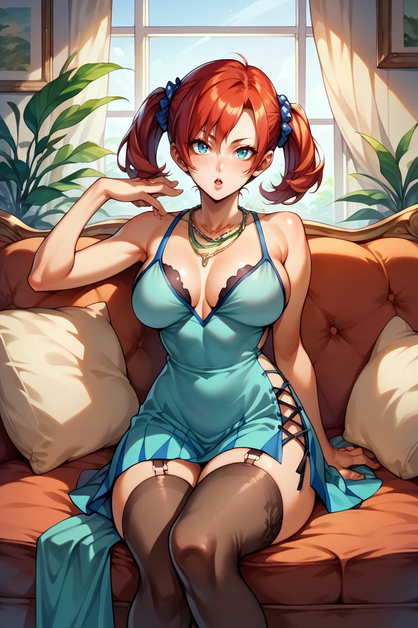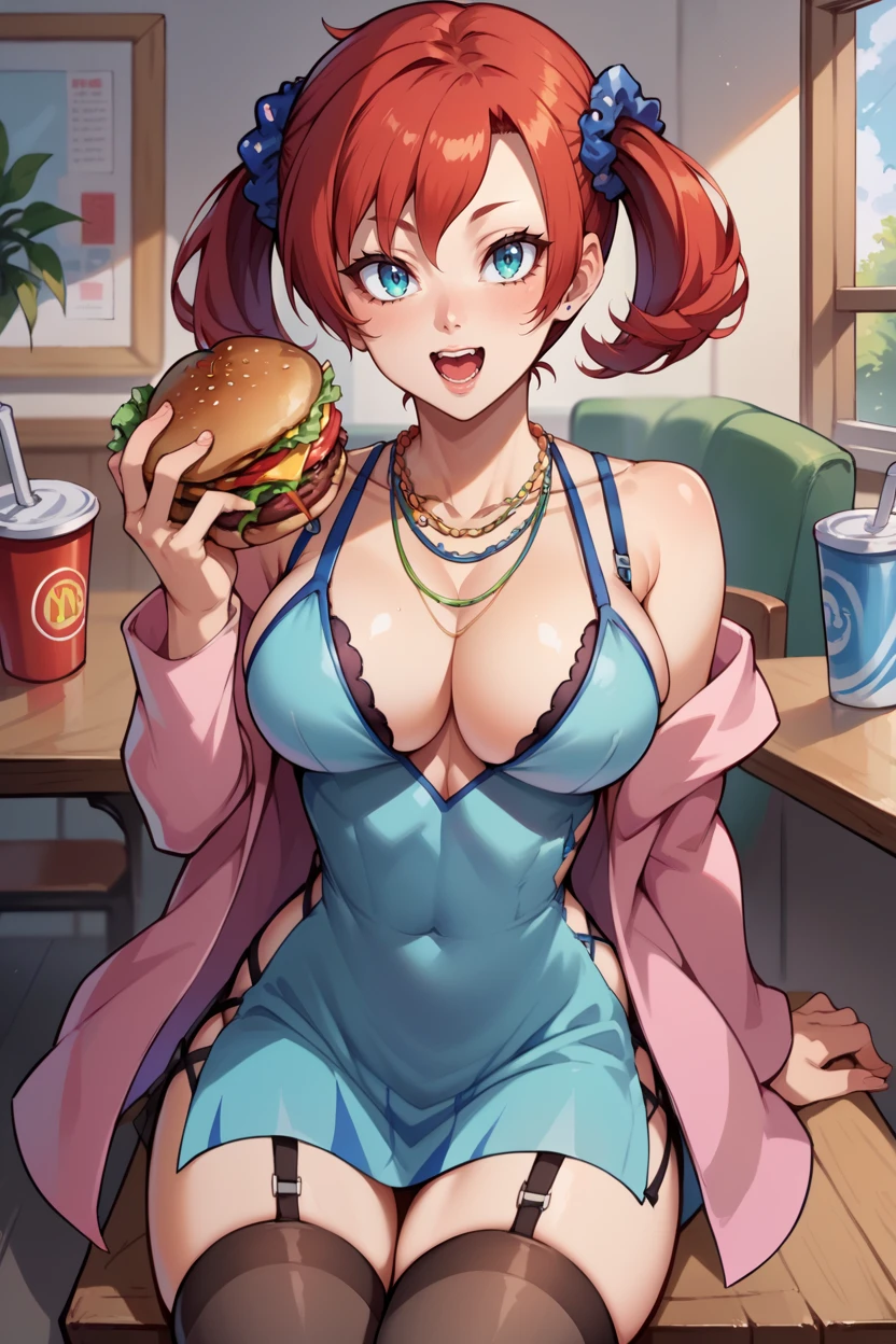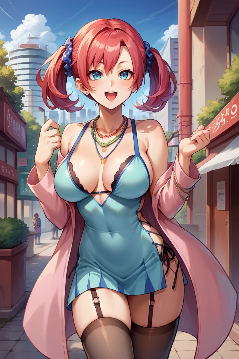 Add "scrunchie, necklace, teal dress, cleavage, pink jacket, short dress, garter straps, black thighhighs" for her typical look.