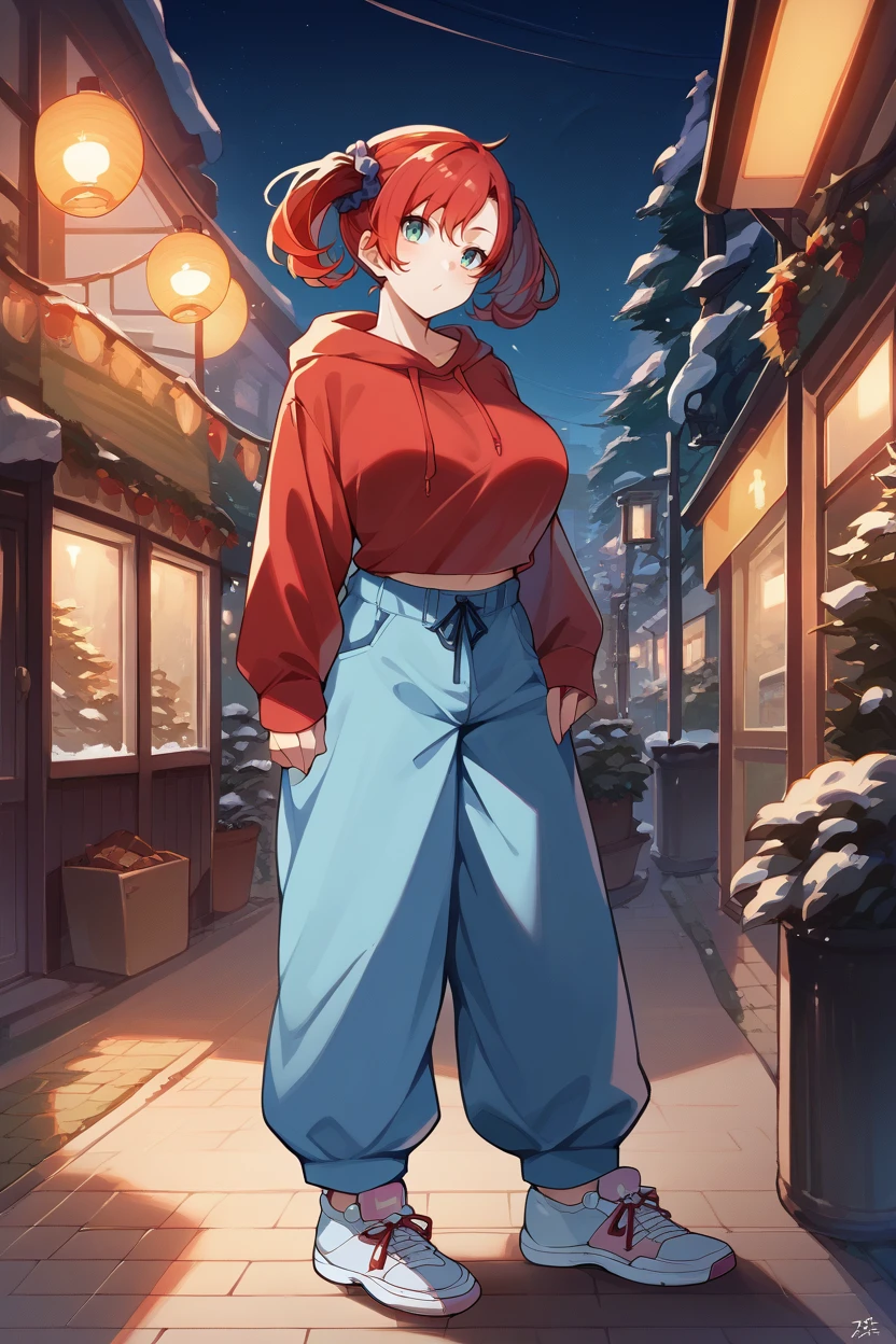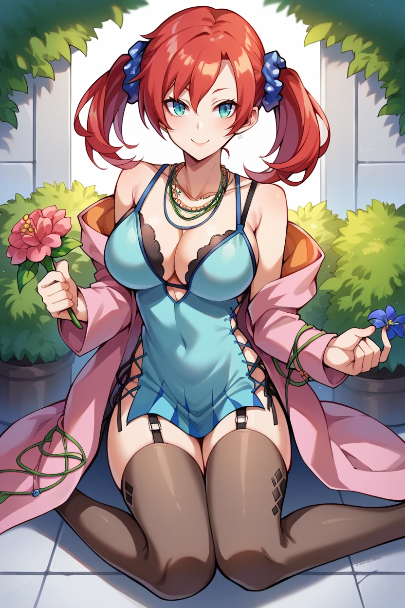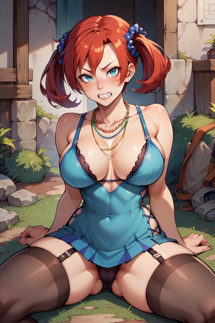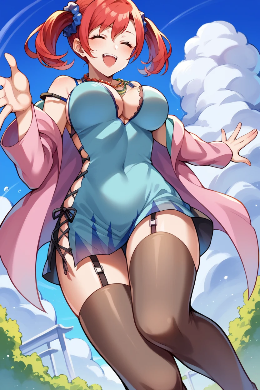Add "scrunchie, necklace, teal dress, cleavage, pink jacket, short dress, garter straps, black thighhighs" for her typical look.