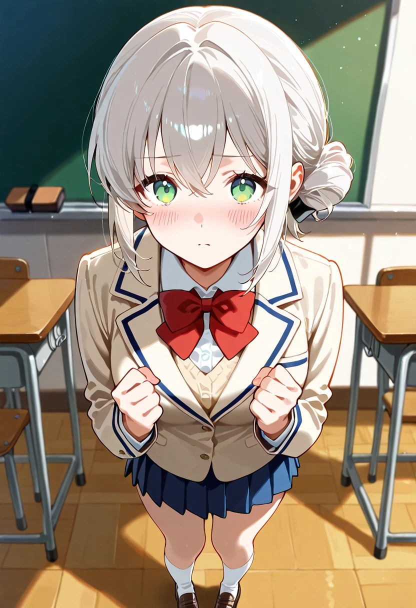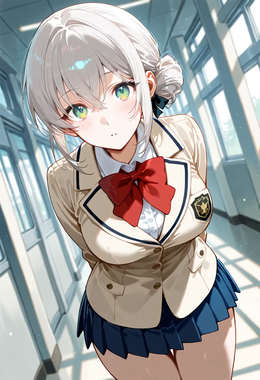 Outfit 1 (School) : OouraMiyuri, 1girl, single hair bun, white hair, grey hair, bangs, green eyes, school uniform, blazer, mini skirt, red bowtie, long sleeves, white shirt