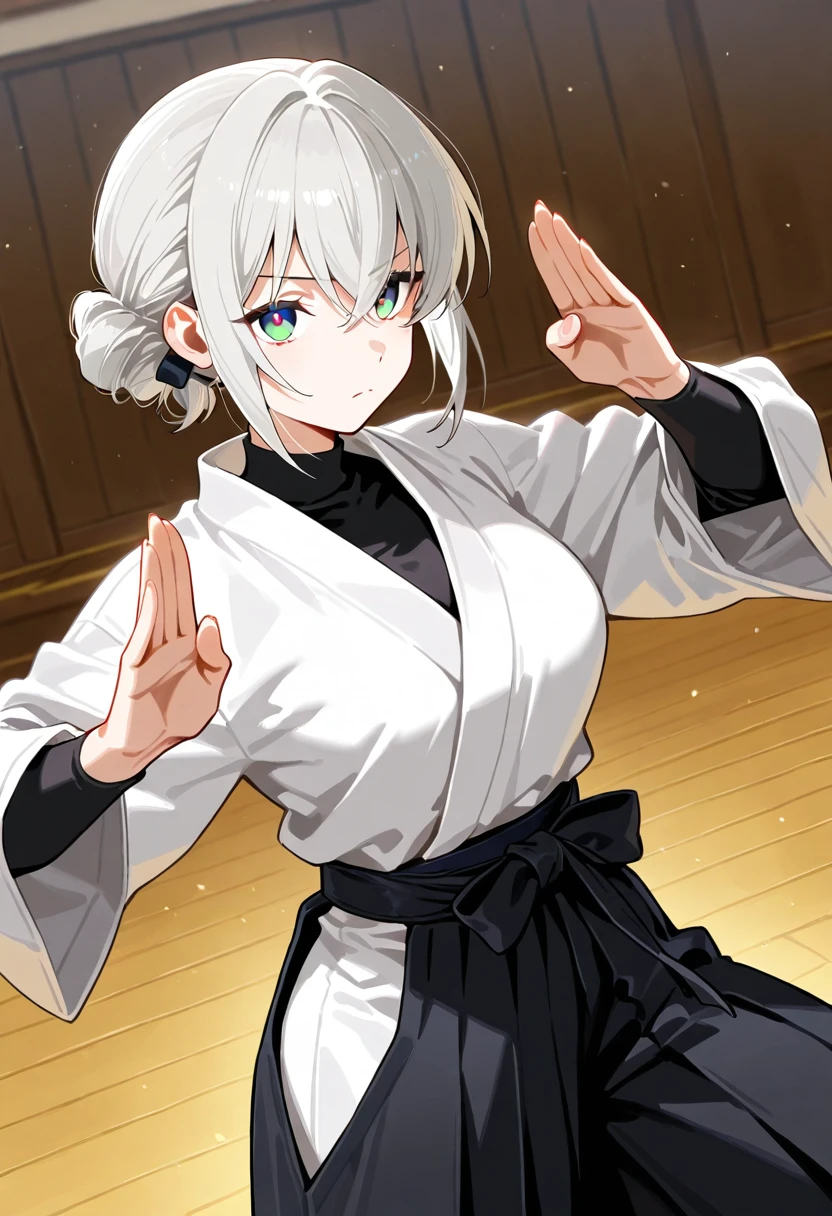 Outfit 3 (Martial Arts) : OouraMiyuri, 1girl, single hair bun, white hair, grey hair, bangs, green eyes, black hakama, white kimono, black shirt, black long sleeves