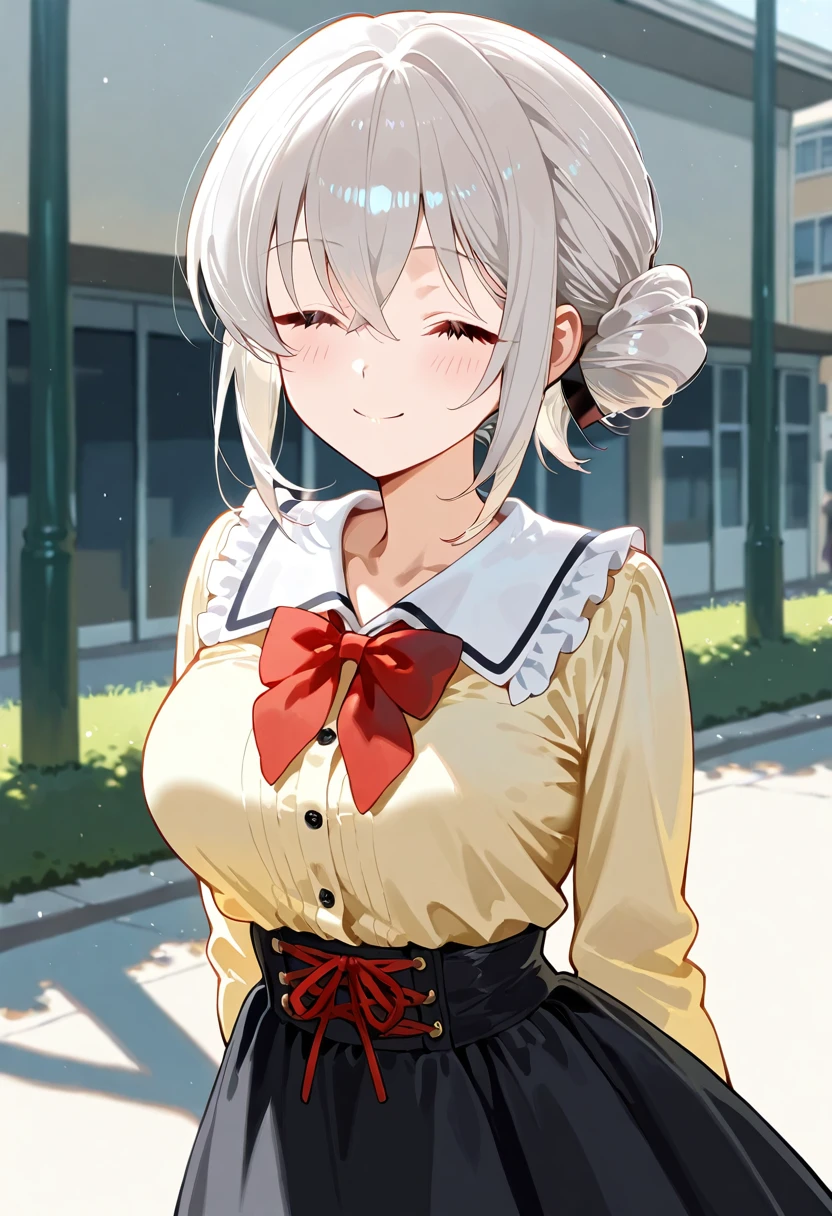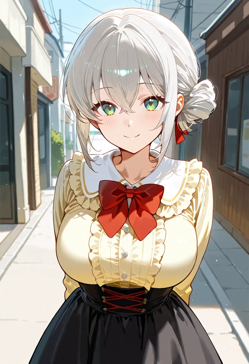 Outfit 2 (Casual) : OouraMiyuri, 1girl, single hair bun, white hair, grey hair, bangs, green eyes, yellow school blouse frills, red bowtie, black skirt, corset-style red ribbon lace-up waist