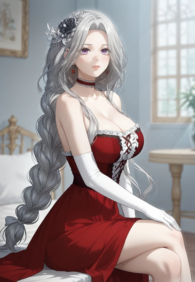 red dress, choker, elbow gloves, braid, hair ornament