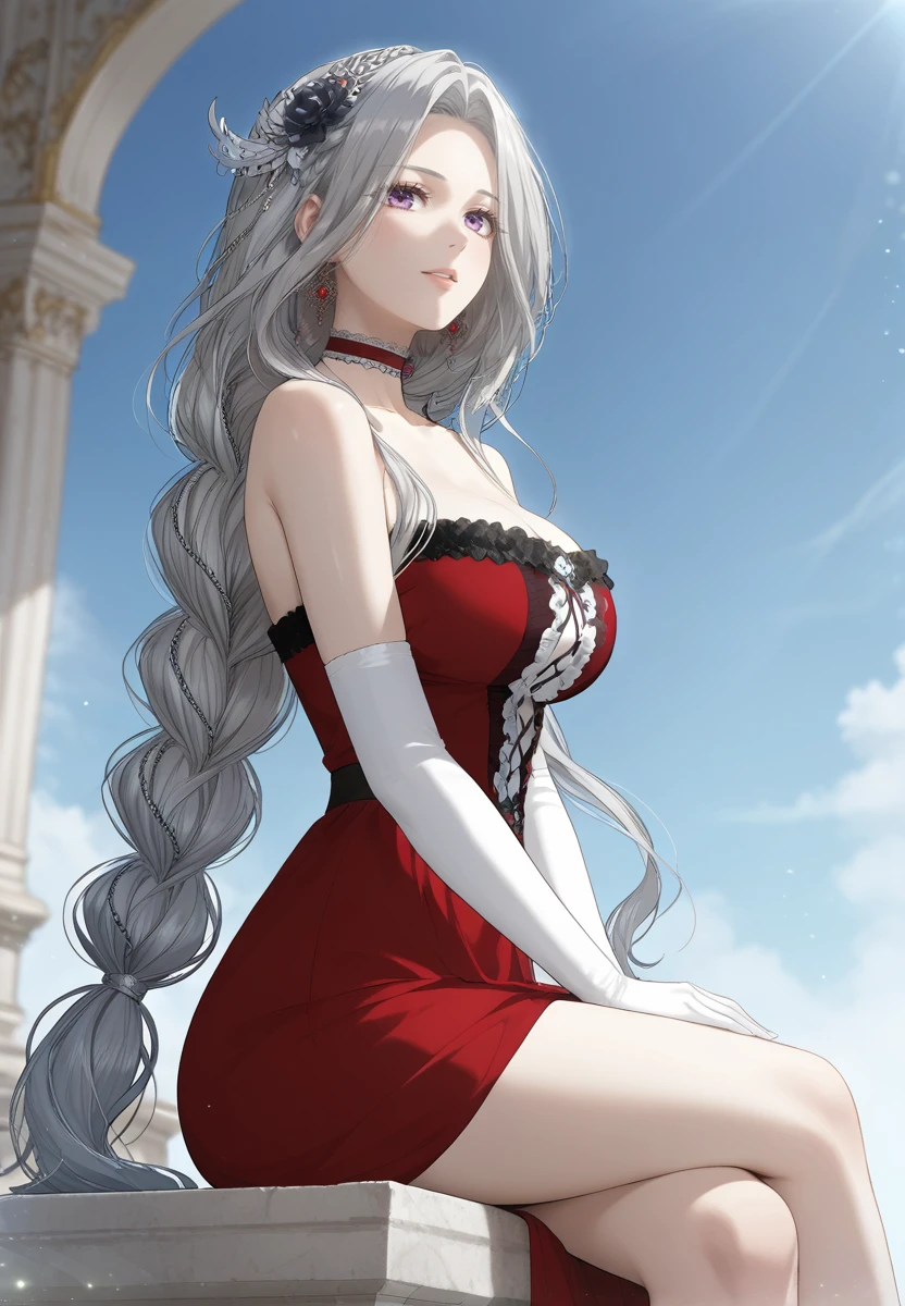 red dress, choker, elbow gloves, braid, hair ornamentStrength: 0.8