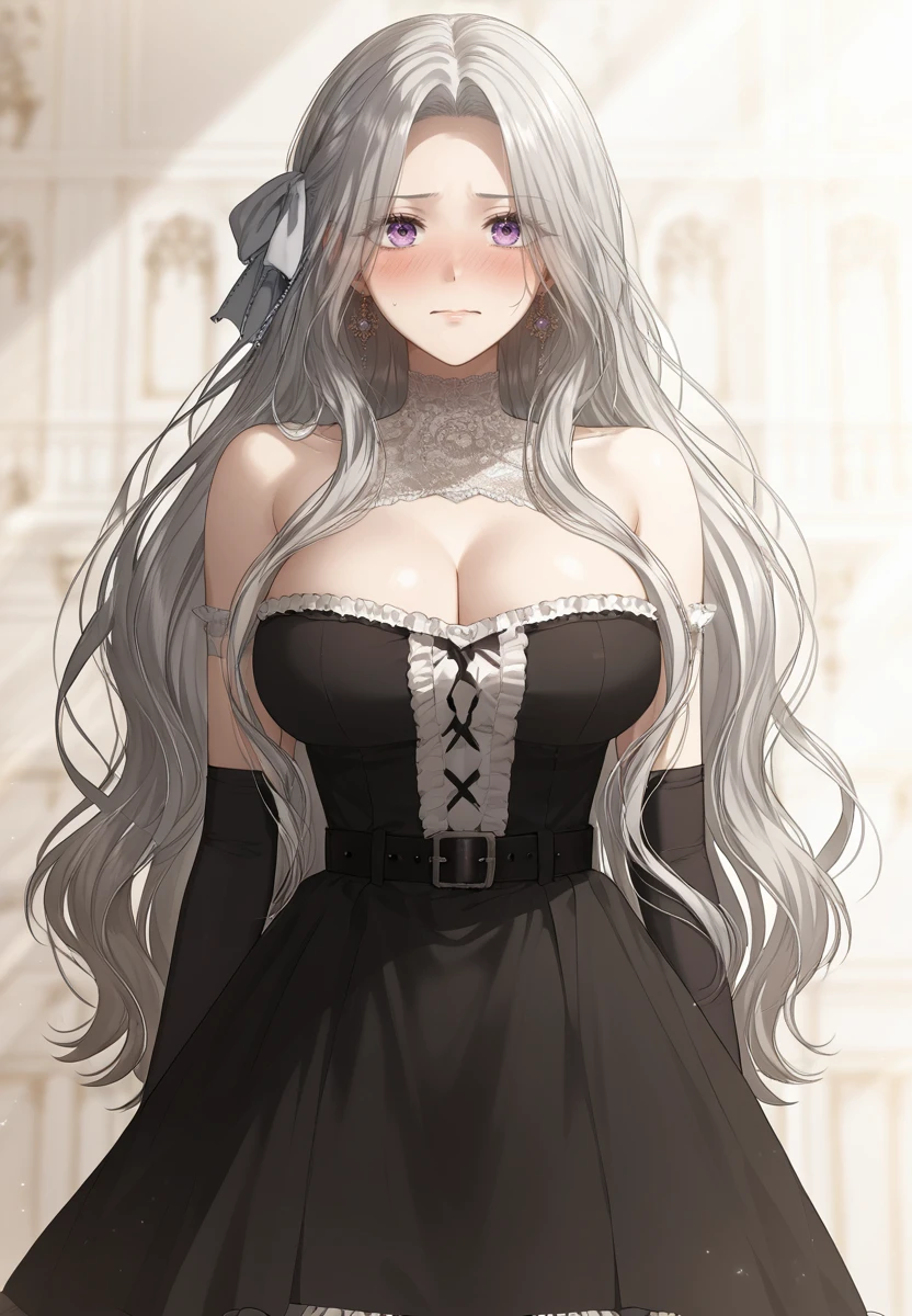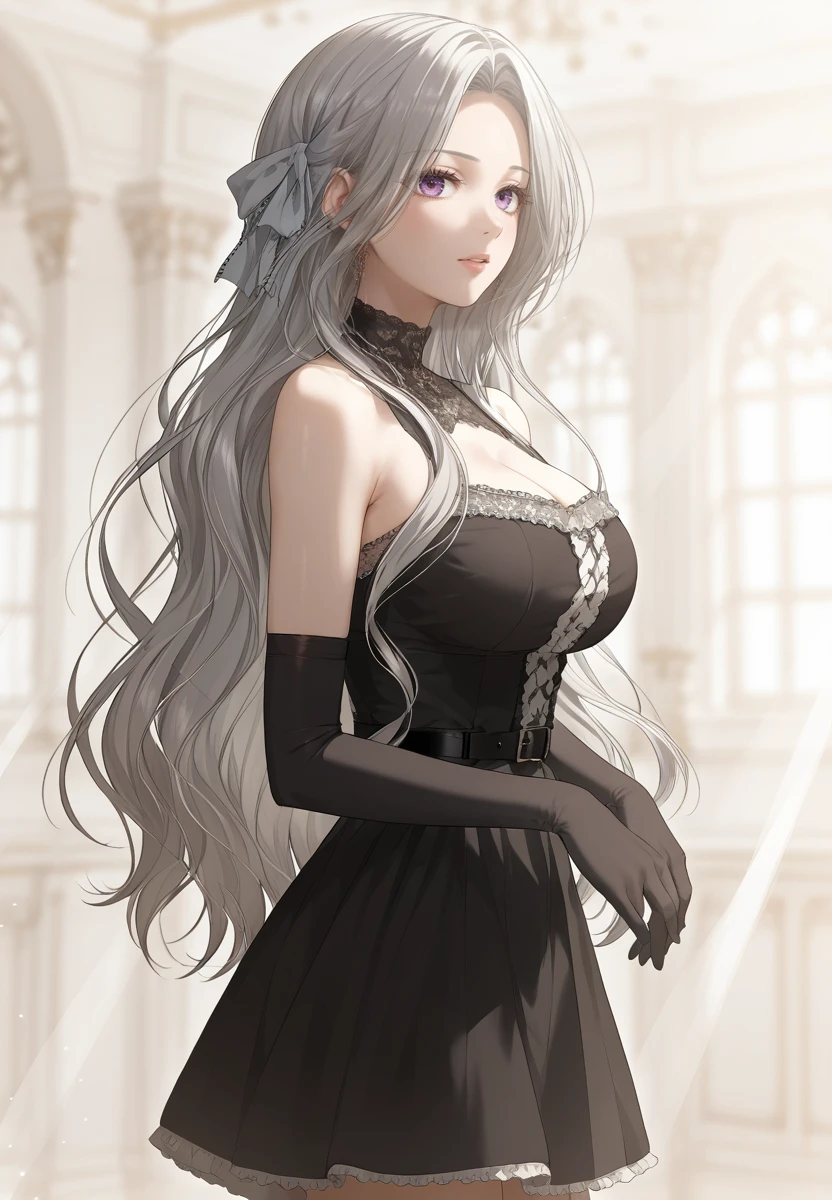 hair ribbon, black dress, belt, elbow gloves